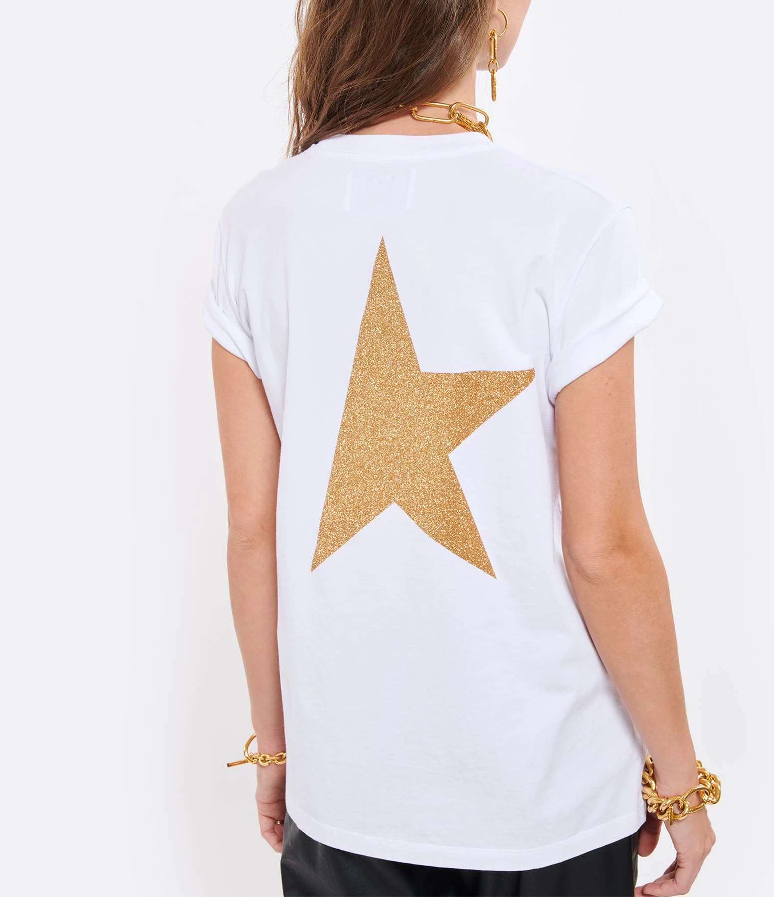 Tee-shirt en coton blanc avec inscription à paillettes dorées sur la poitrine, et étoile dans le dos. Col rond. Manches courtes. Coupe droite. Base droite.