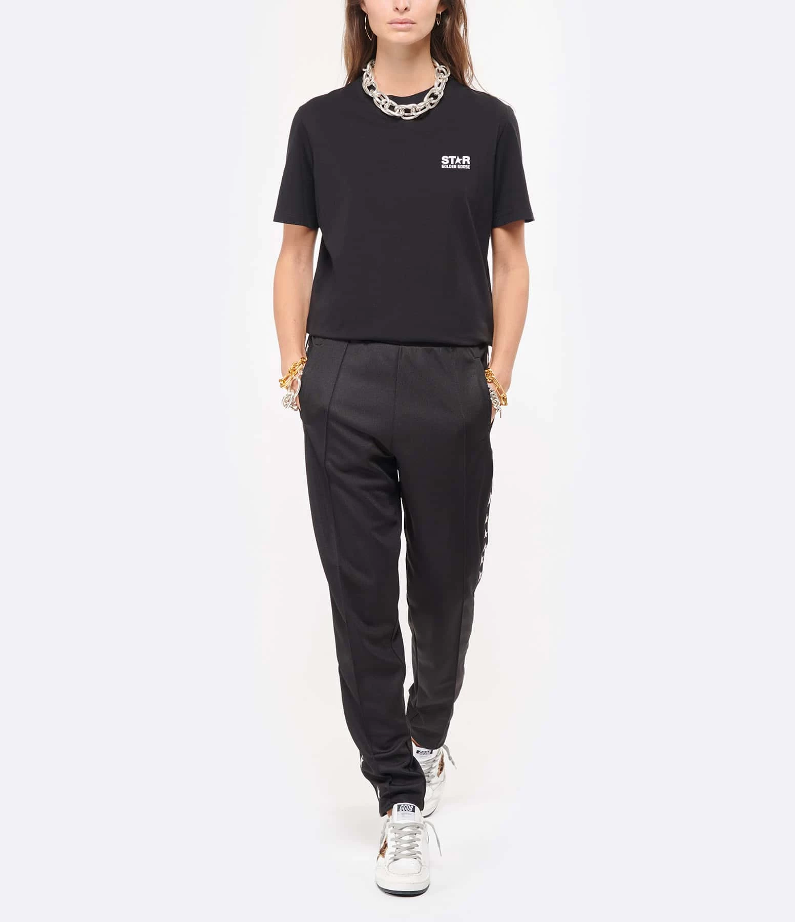 Tee-shirt en coton noir. Inscription poitrine “STAR GOLDEN GOOSE” sérigraphiée en blanc. Logo étoile blanc au dos. Col rond côtelé. Manches courtes. Coupe droite. Base droite.