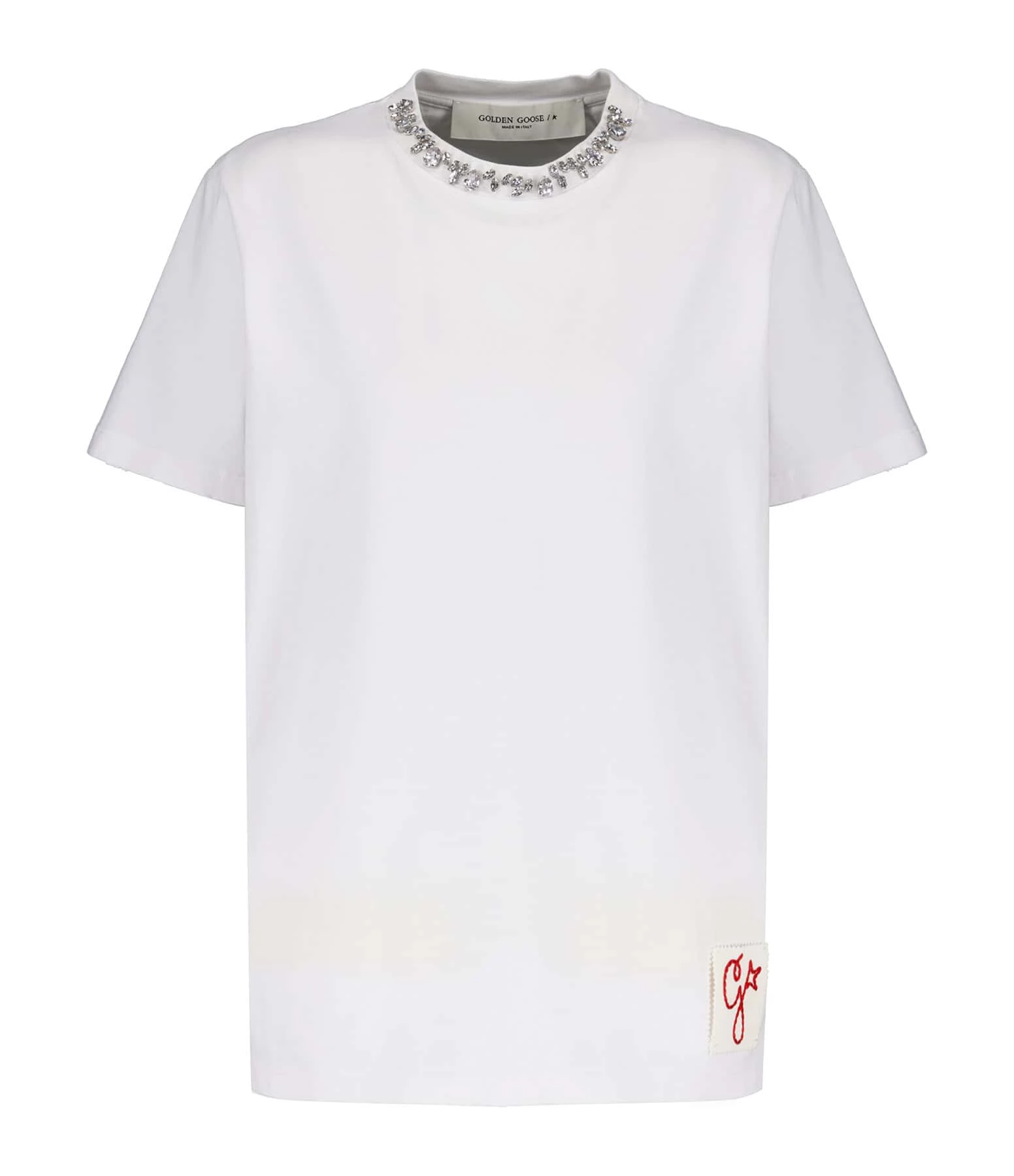 Tee-shirt en coton blanc. Col rond avec cristaux cabochons. Pièce amovible blanche avec la lettre G rouge brodée. Coupe droite. Base droite. Effet usé volontairement.