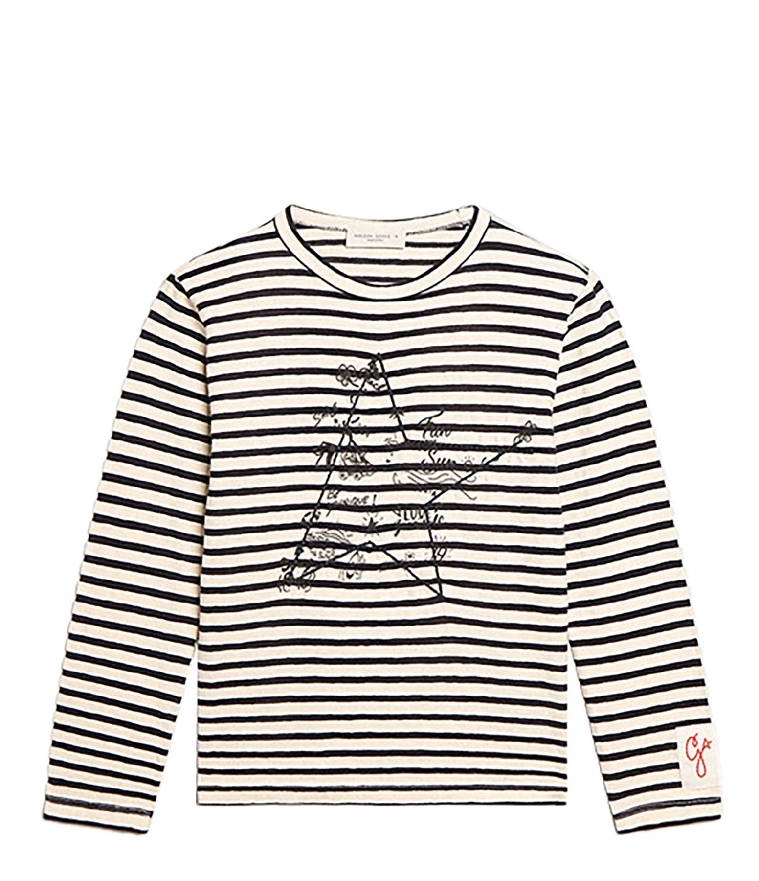 Tee-shirt en jersey de coton et lin écru à rayures bleues avec le logo étoile imprimée en bleu sur le devant. Col rond. Manches longues. Patch amovible avec la lettre G brodée en rouge sur le poignet gauche. Coupe droite. Base droite.