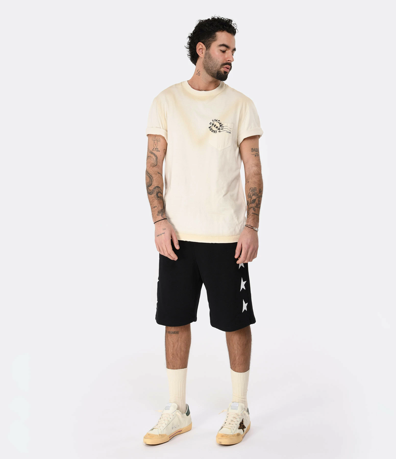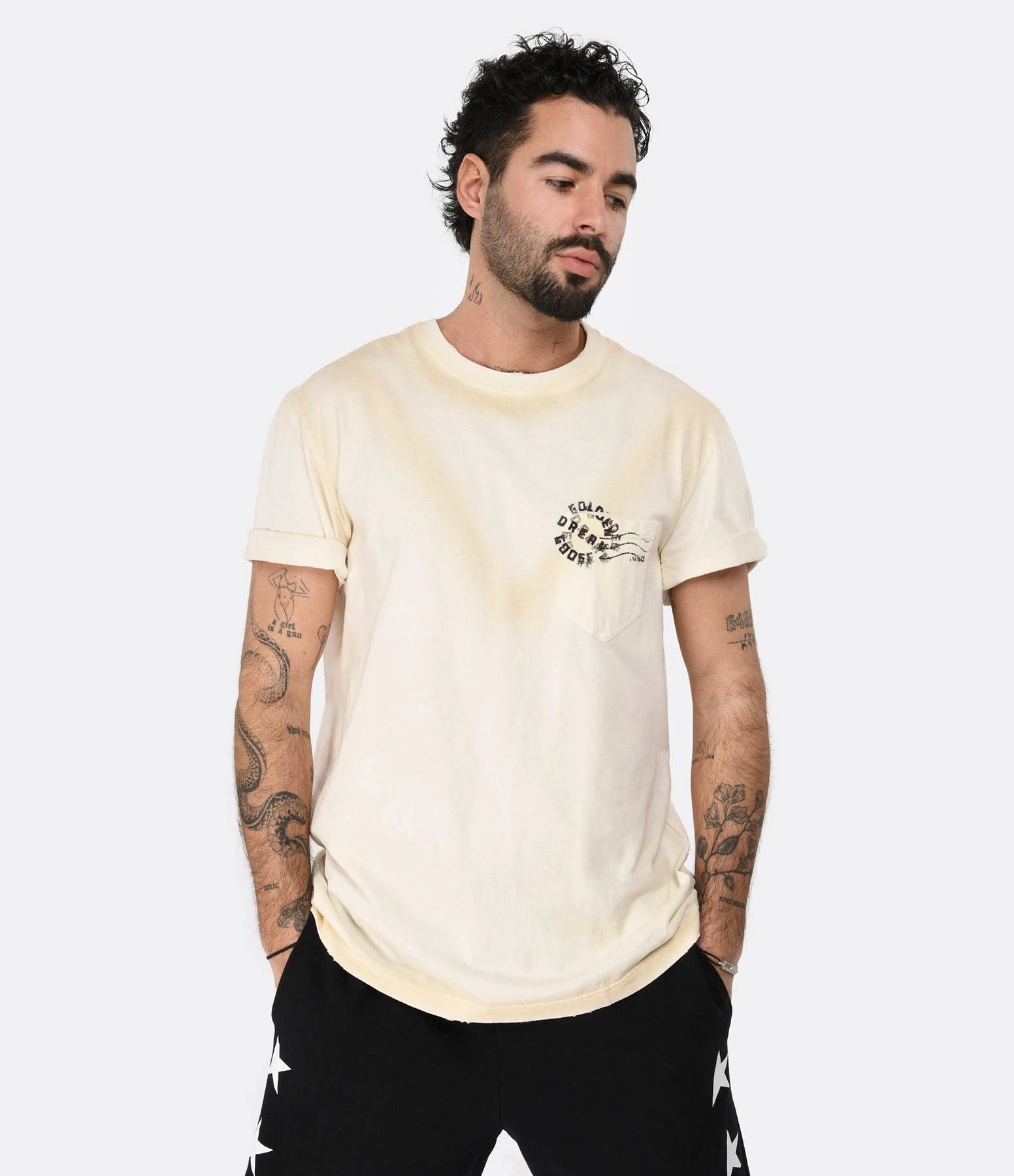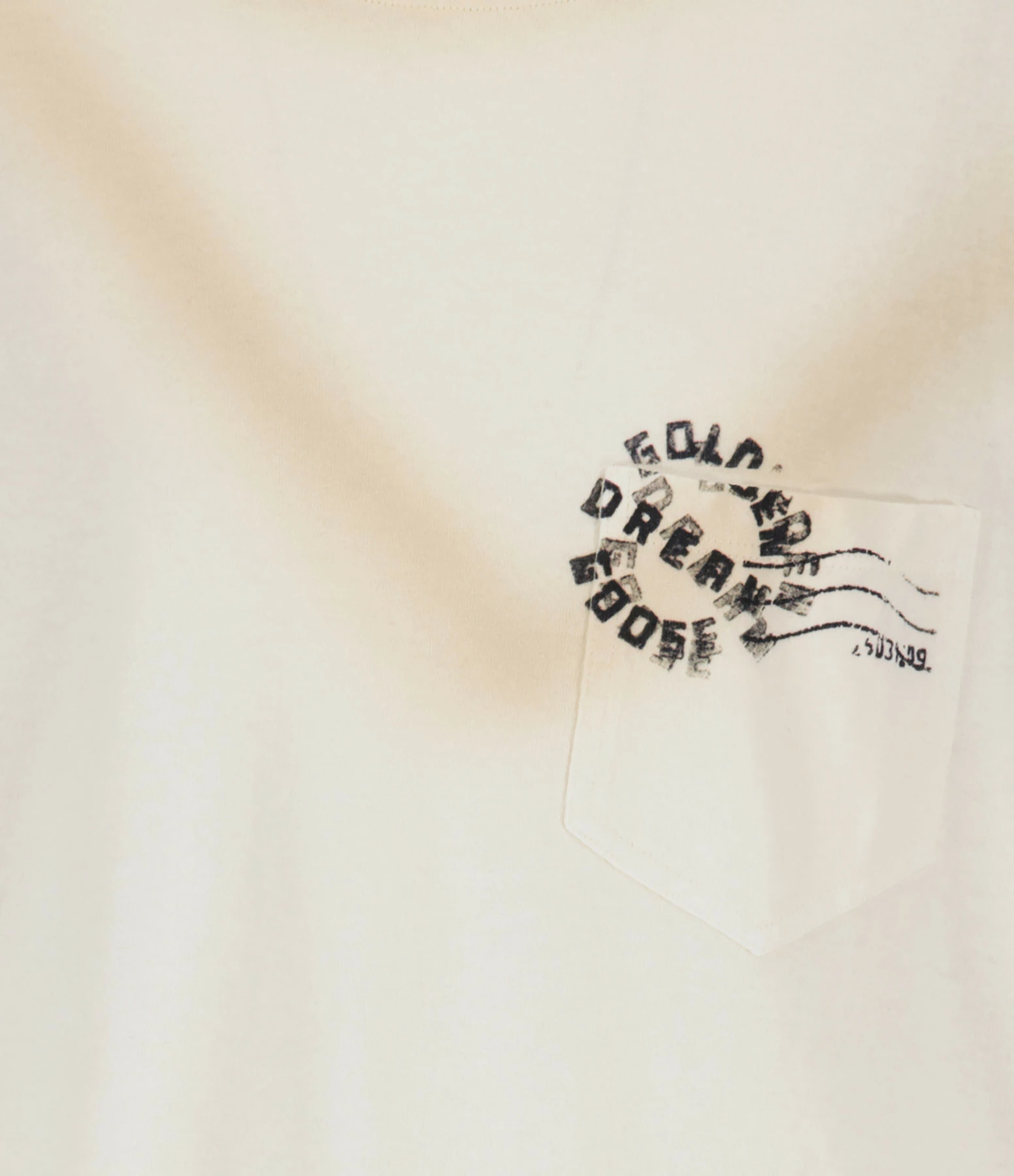 Tee-shirt en coton beige avec l’inscription “Golden Dream Goose” imprimée en noir sur le devant. Col rond côtelé. Manches courtes. Une poche plaquée poitrine.