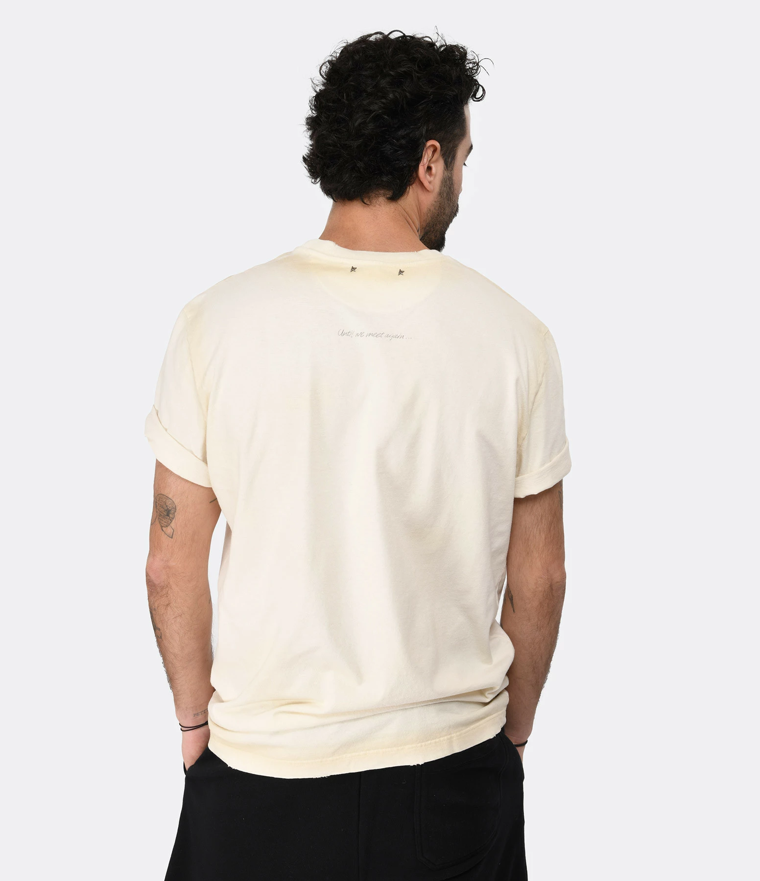 Double logo étoile en métal bronze dans la nuque. Inscription “Until we meet again…” imprimée en noir dans le dos. Coupe droite. Base droite. Effet usé et déchiré par endroits.