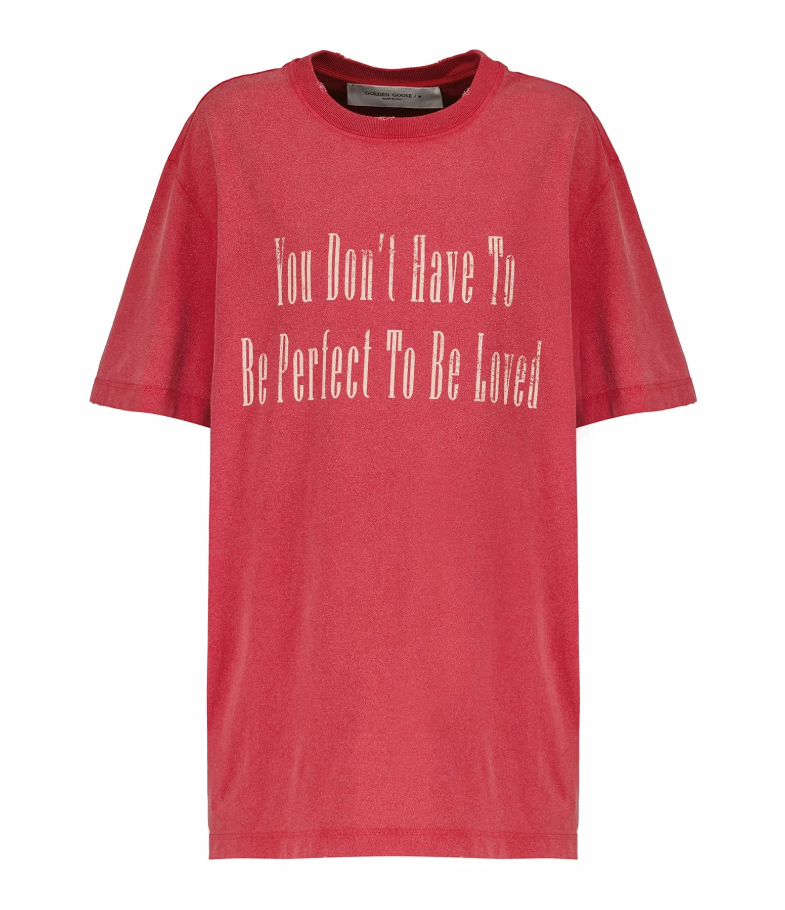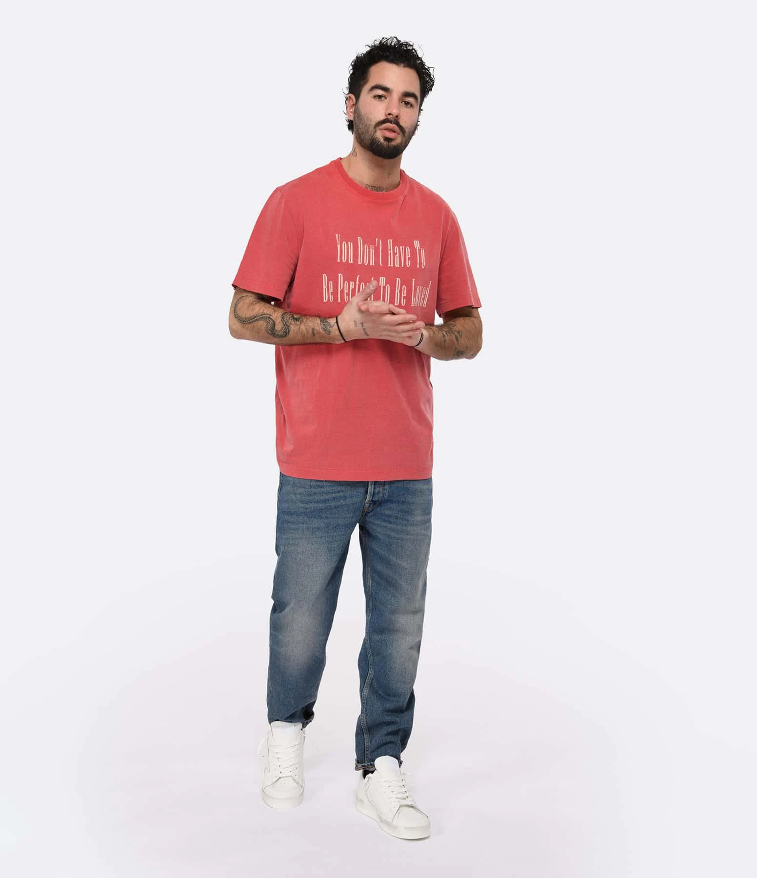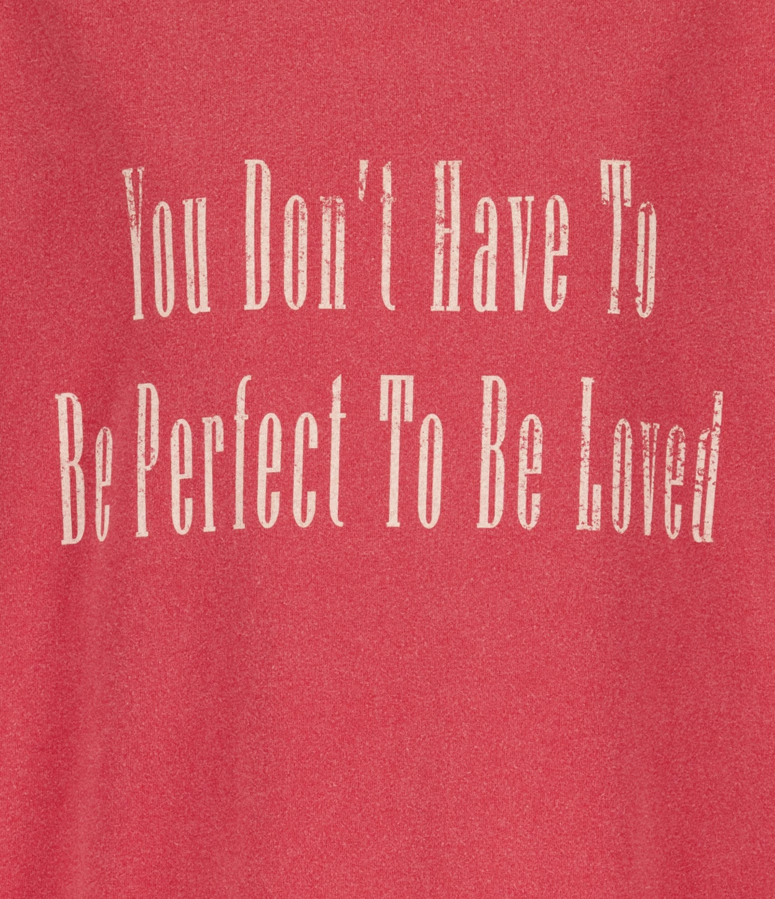 Tee-shirt en coton rouge avec l’inscription “You Don’t Have To Be Perfect To Be Loved” imprimée en beige sur le devant. Col rond côtelé. Manches courtes. Double logo étoile en métal bronze dans la nuque. Coupe droite. Base droite. Effet usé et déchiré par endroits.