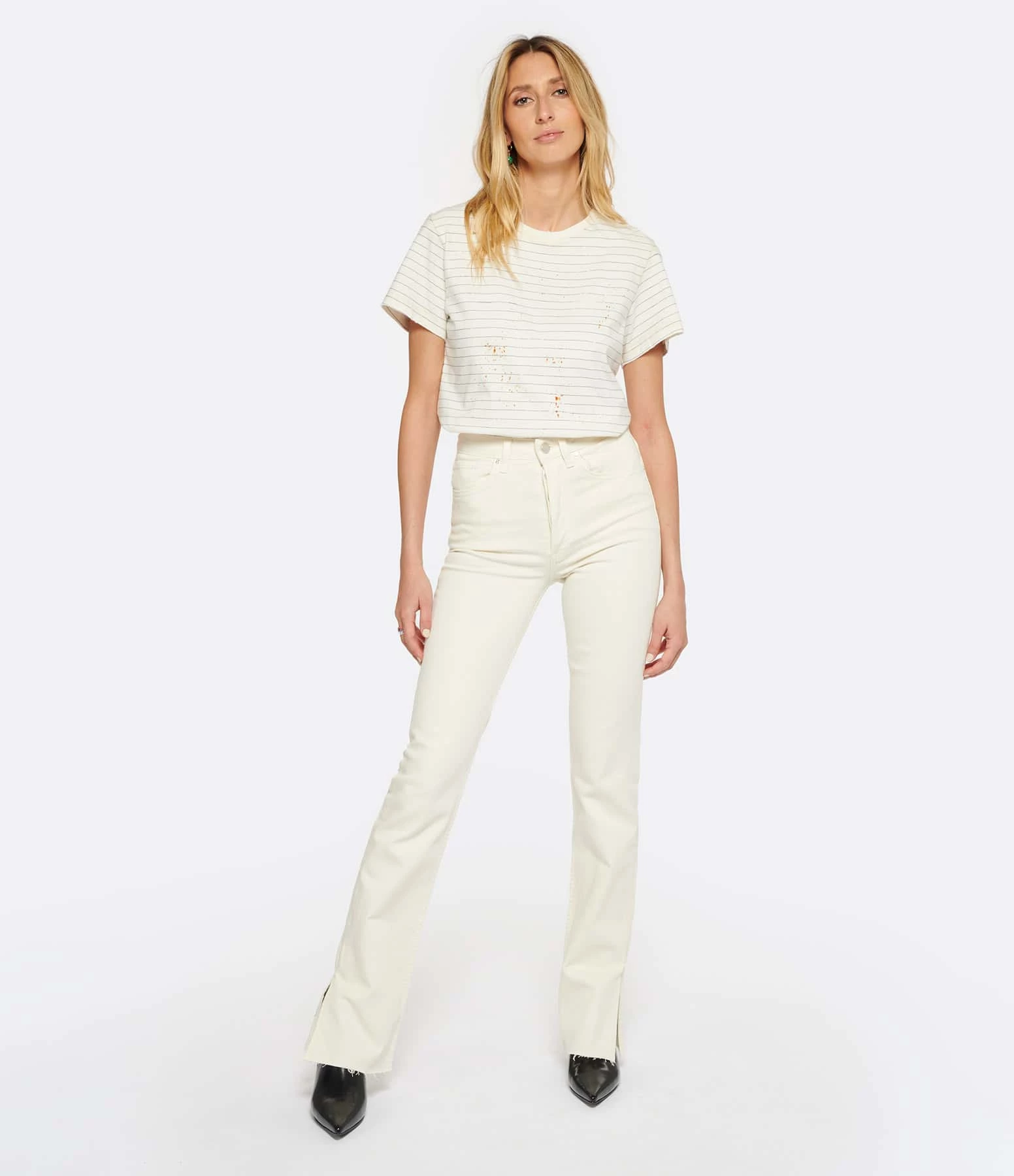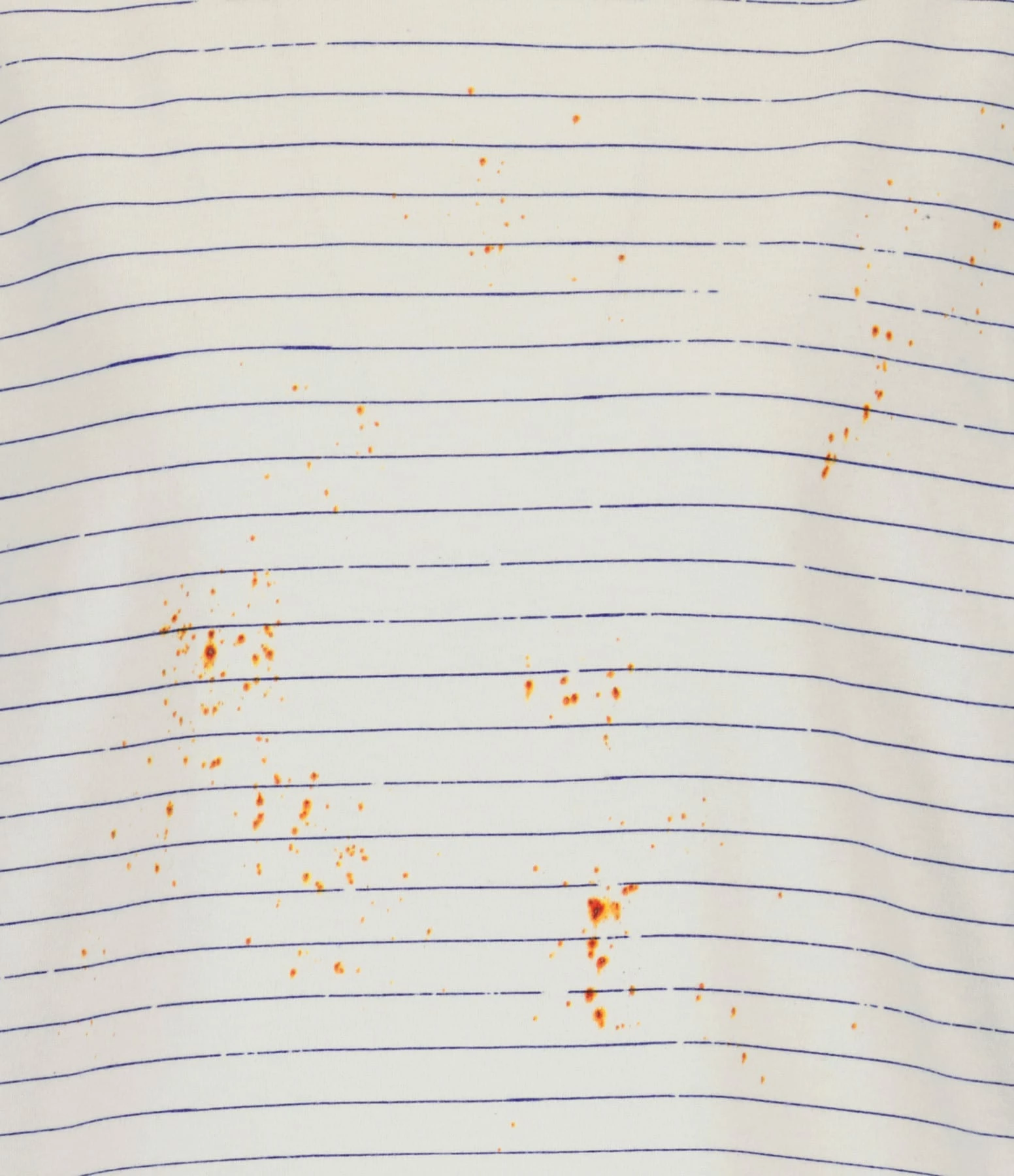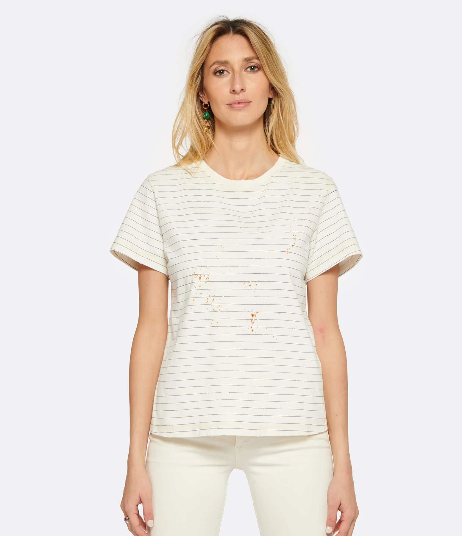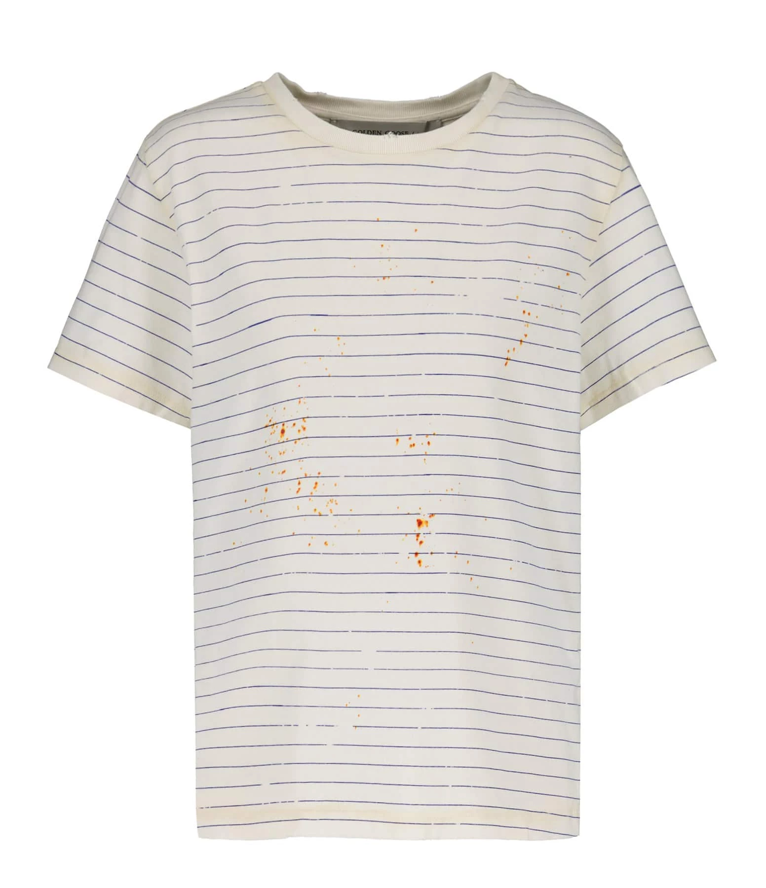 Tee-shirt en coton écru à rayures bleues. Inscriptions dans le dos. Col rond. Coupe droite. Base droite. Effet usé et tâché volontairement.