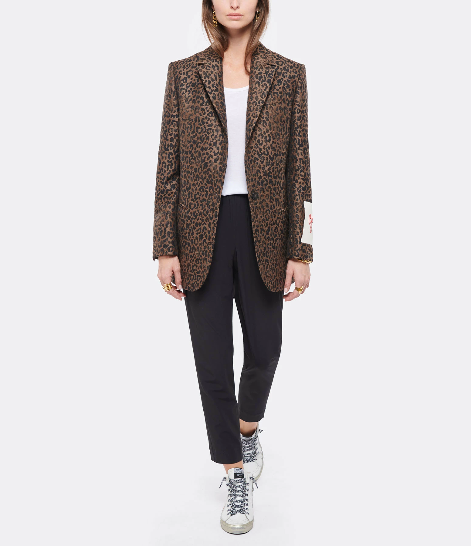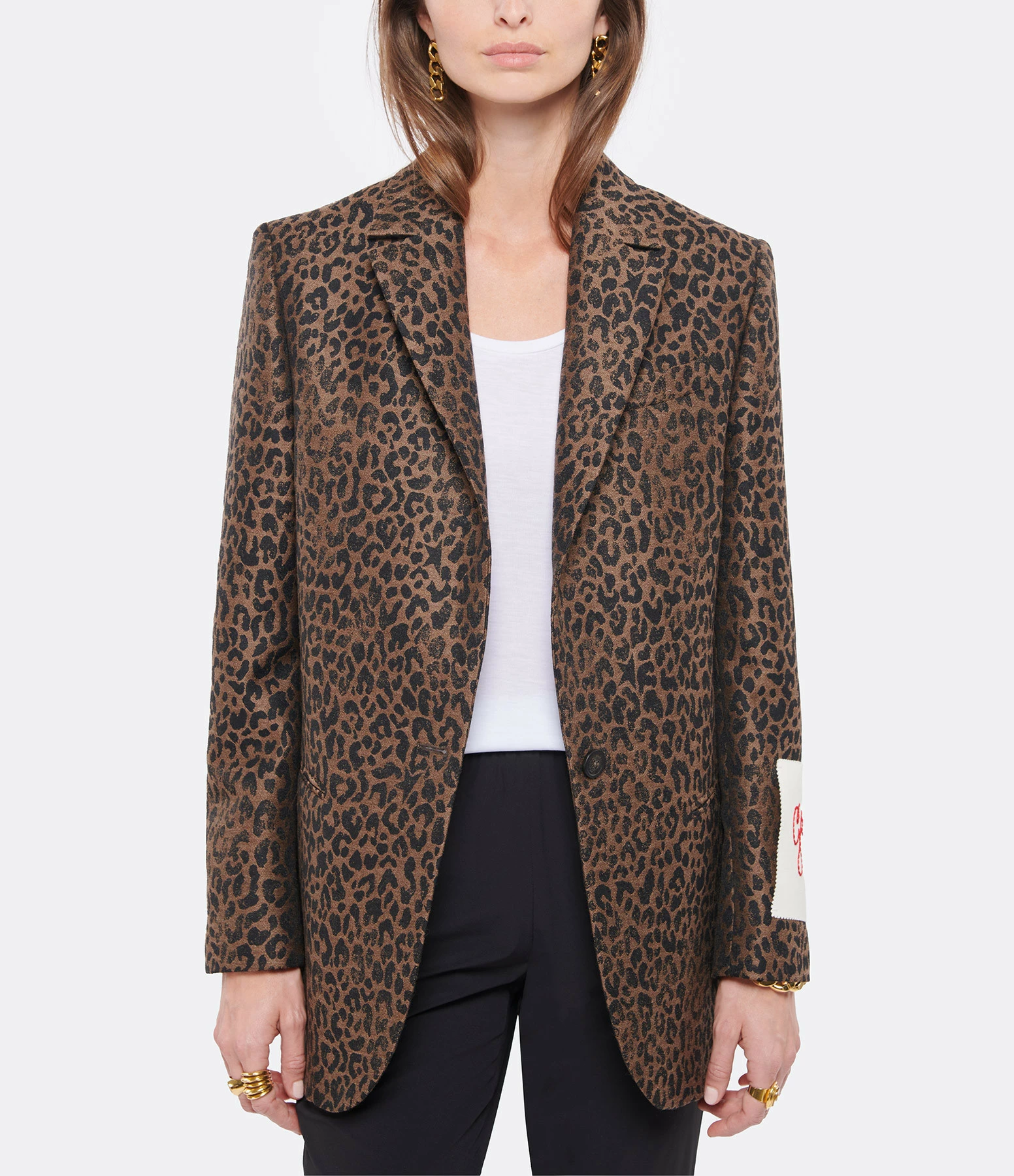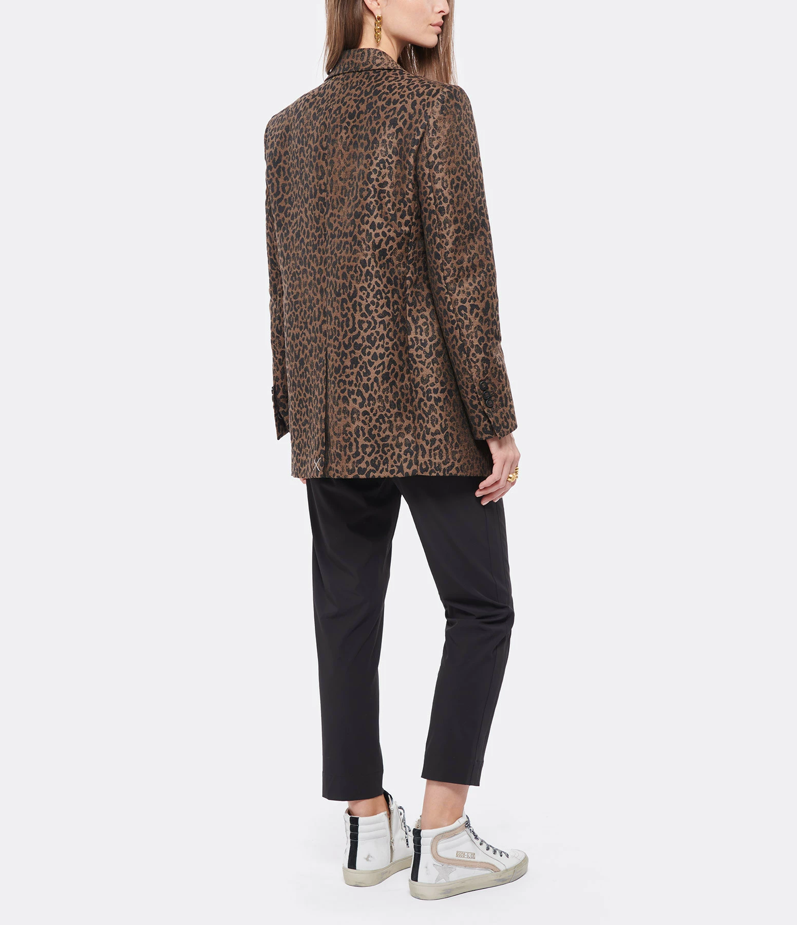 Veste de blazer en laine à imprimé léopard. Col tailleur. Manches longues. Trois poches passepoilées dont une poitrine, Entièrement doublée. Coupe cintrée.