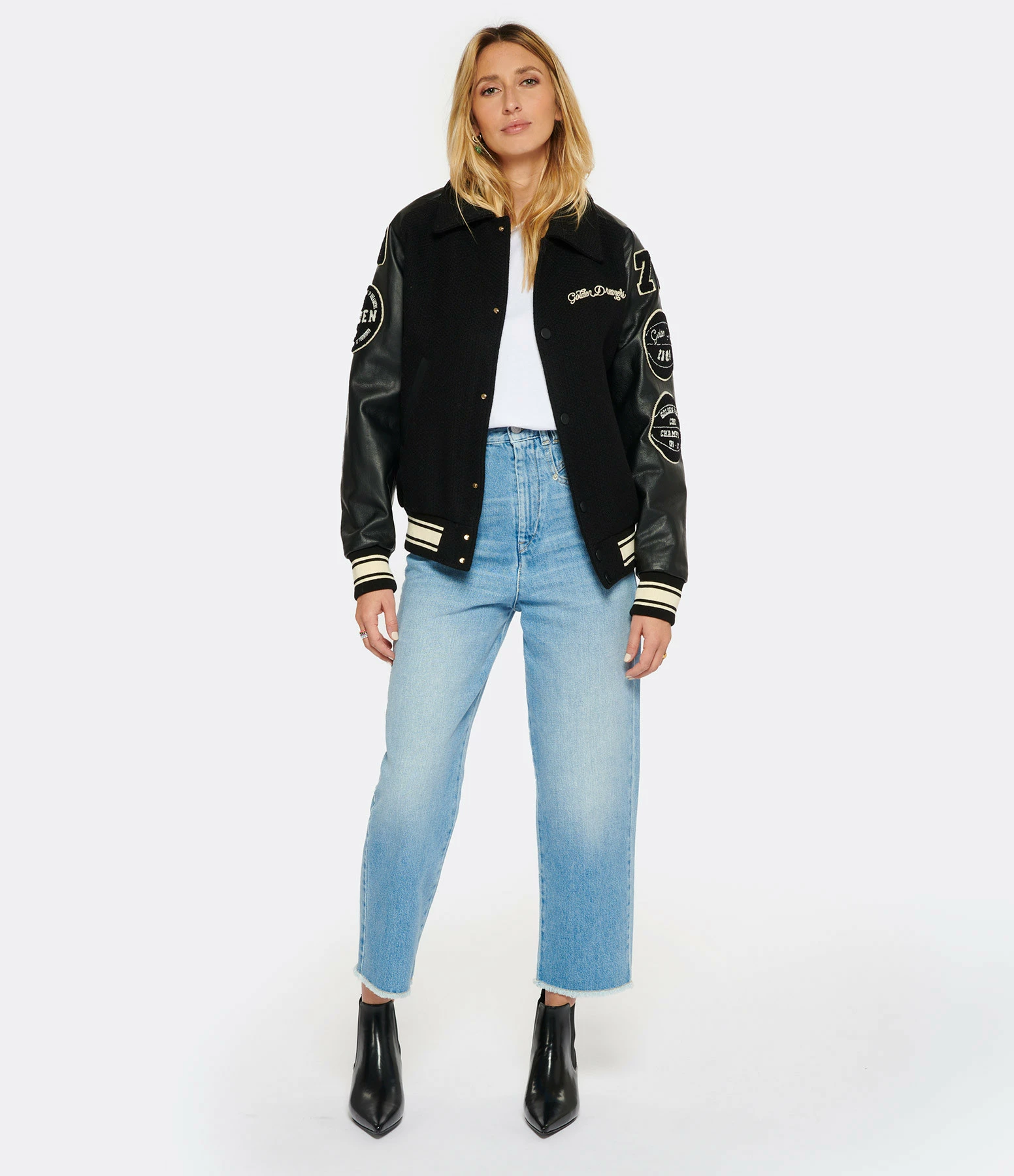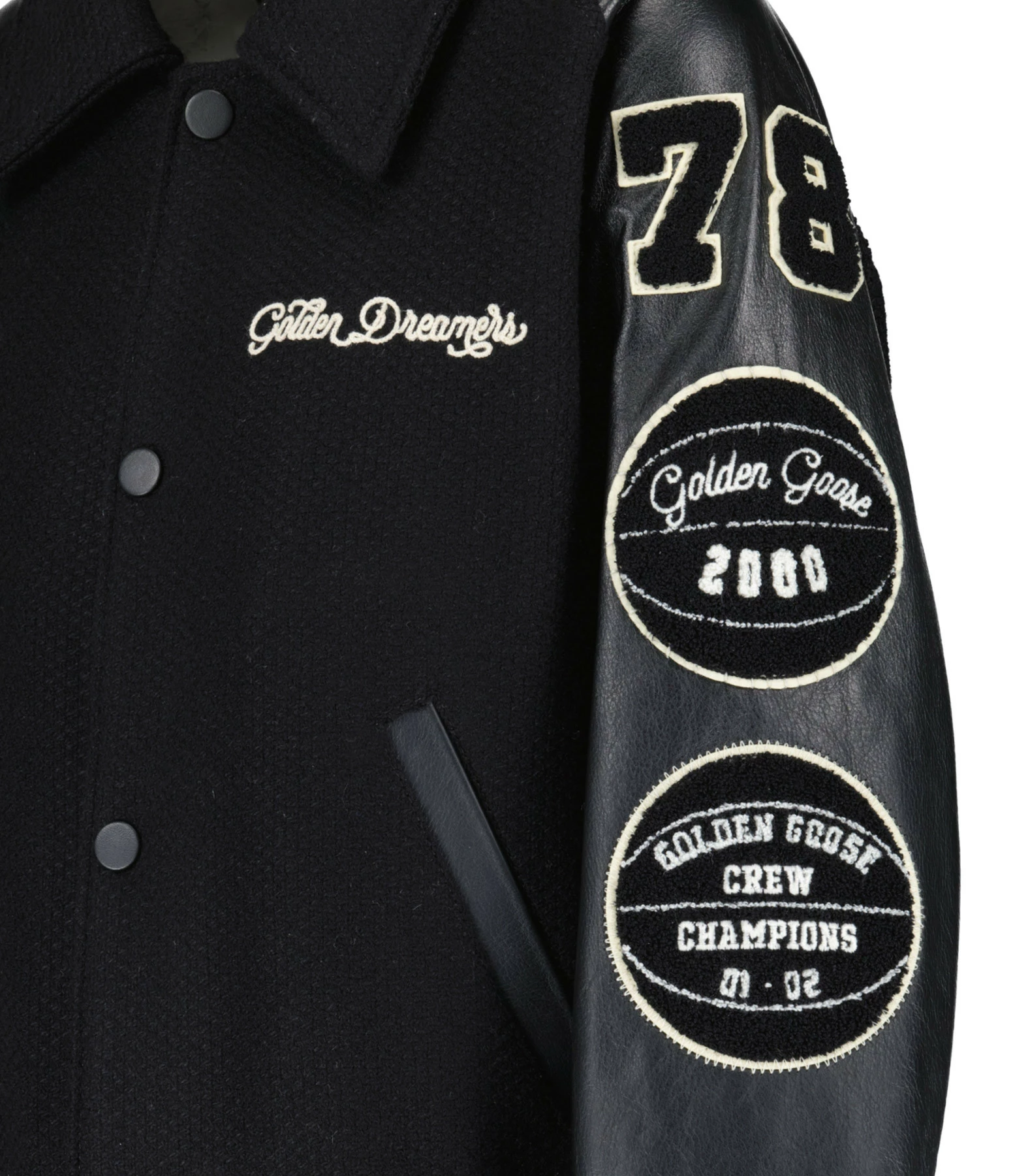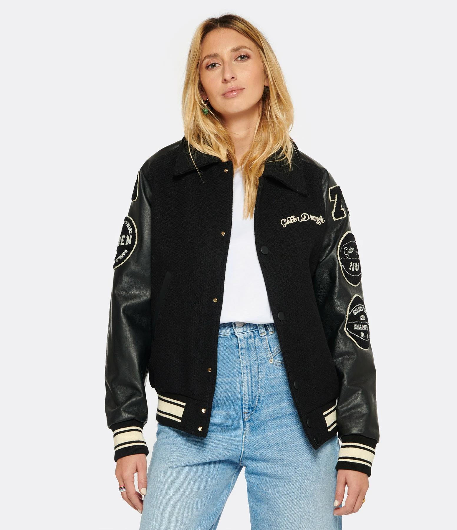 Veste bomber en laine et cuir noirs avec l’inscription “Golden Dreamers” brodée en beige sur le devant. Col chemisier. Manches longues en cuir avec poignets côtelés soulignés par des bandes blanches. Patchs estampillés GOLDEN brodés sur les manches. Fermeture pressionnée sur le devant. Boutons pression noirs. Deux poches raglans sur le devant. Une poche zippée intérieure. Double logo étoile en métal bronze dans la nuque. Coupe ample. Base droite côtelée soulignée de bandes blanches. Doublée.
