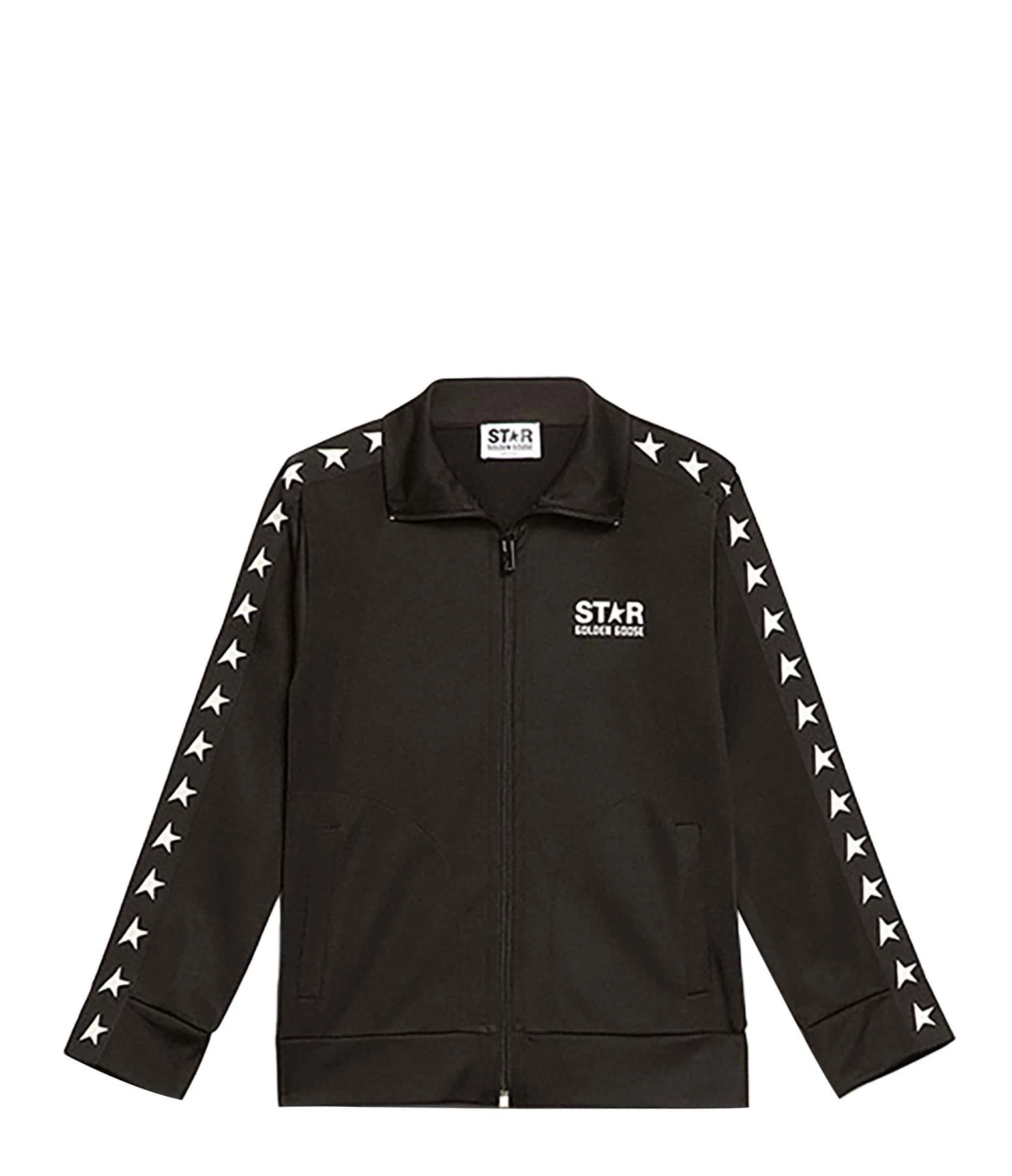 Veste sportwear noir. Col montant. Manches longues avec bande noire en gros grain avec série logos étoiles blanches sur les manches. Poignets côtelés. Inscription poitrine “STAR GOLDEN GOOSE” sérigraphiée en blanc sur le devant. Fermeture zippée sur le devant. Deux poches raglans sur le devant. Coupe droite. Base droite. Non doublée.