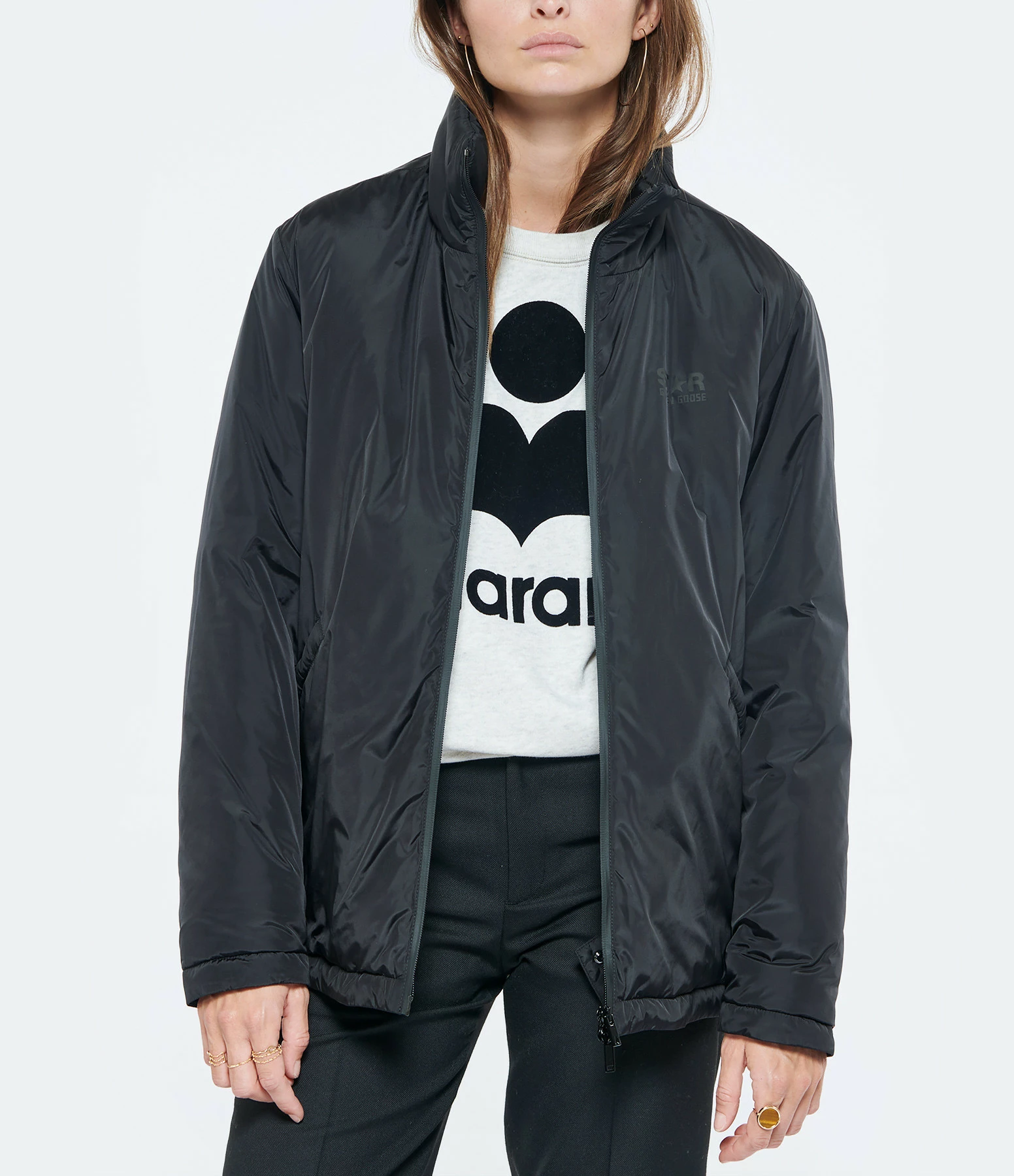 Veste sportwear noir effet K-way pour femme. Inscription poitrine “STAR GOLDEN GOOSE”. Bords côtes aux poignets. Deux poches à l’avant. Fermeture par zip. Base droite et élastiquée.