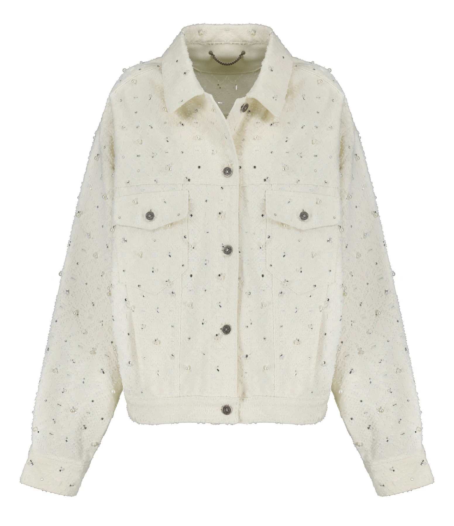 Veste en denim de coton blanc délavé se démarquant par des broderies de cristal et de perles disposées en all-over. Col chemisier. Manches longues avec fentes et poignets boutonnés. Fermeture boutonnée sur le devant. Boutons métalliques argentés estampillés Golden Goose. Deux poches à rabat boutonné et deux poches fendues sur le devant. Une poche plaquée intérieure. Coupe droite. Base droite avec patte de serrage. Non doublée. Effets usés et déchirés.