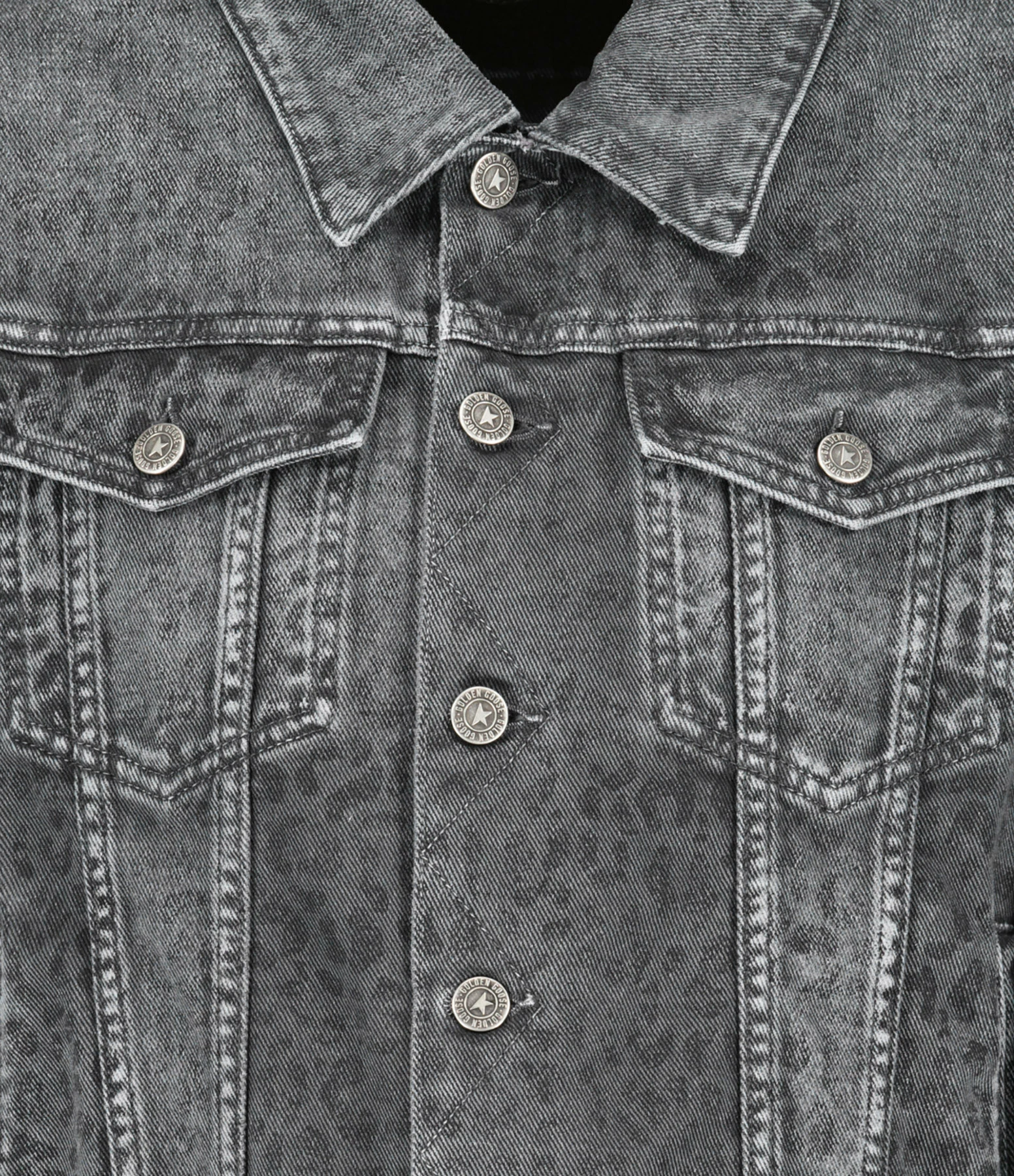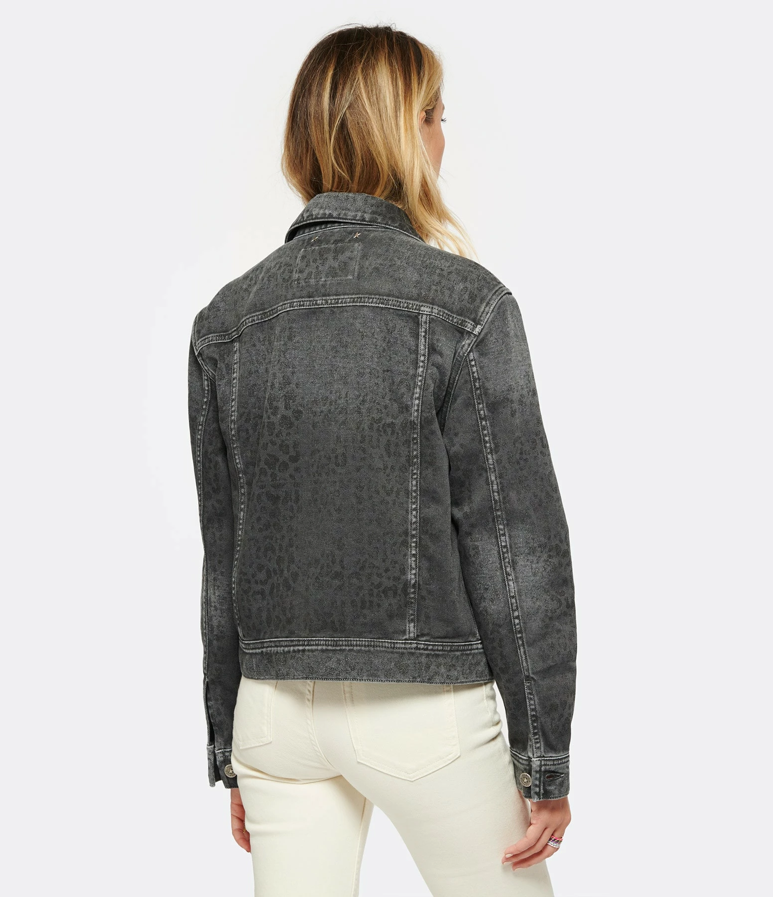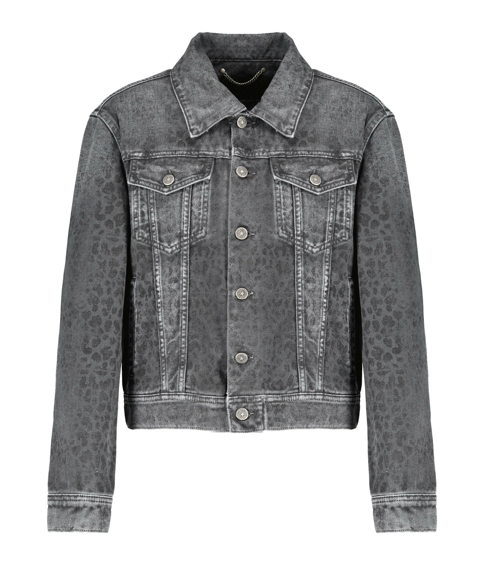 Veste en denim de coton gris à imprimé léopard. Col chemise. Manches longues avec fentes et poignets boutonnés. Fermeture boutonnée sur le devant. Boutons métalliques argentés. Deux poches à rabat boutonné et deux poches passepoilées sur le devant. Double logo étoile en métal bronze dans la nuque. Coupe droite. Base droite.