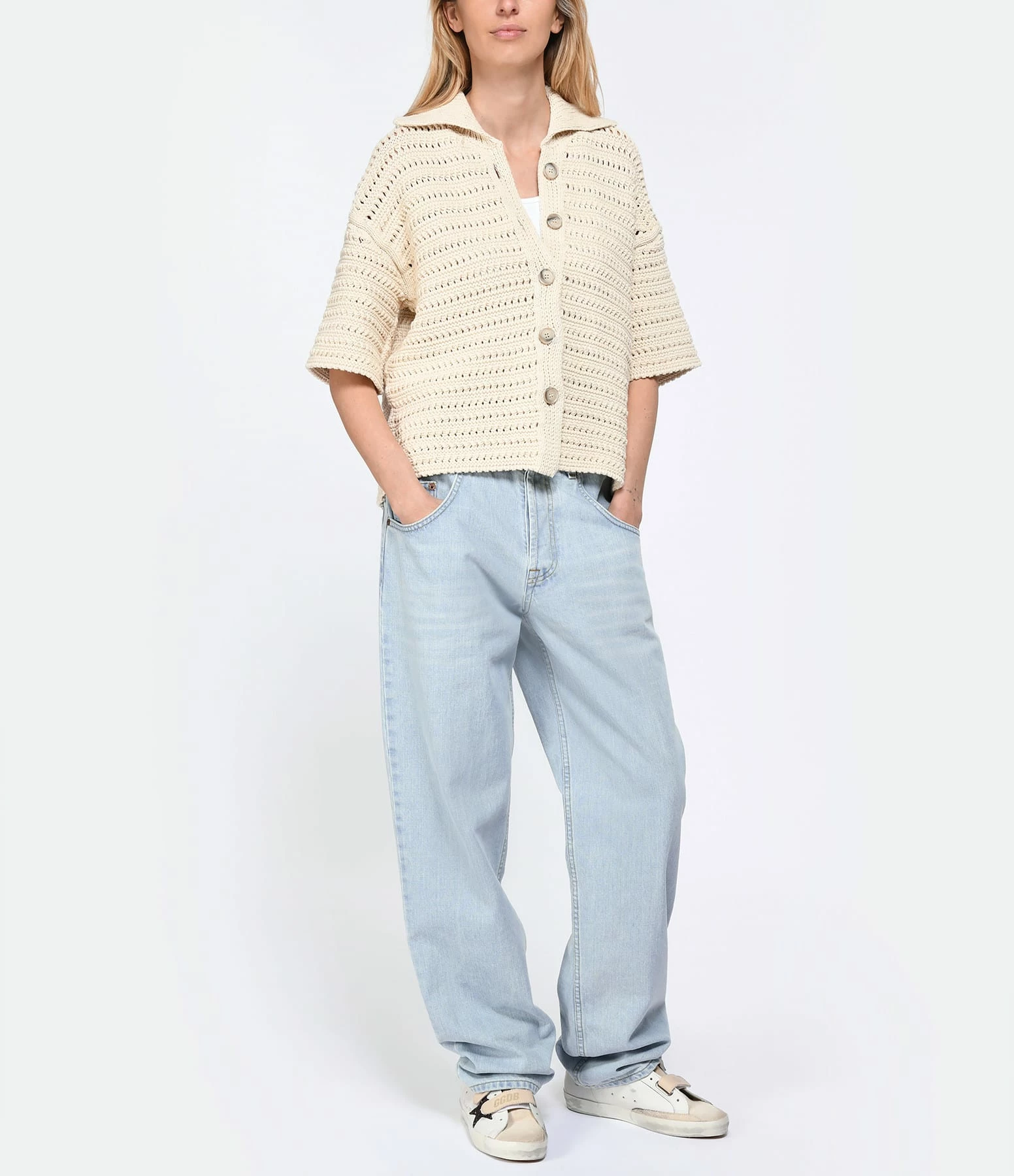 Chemise en coton effet crochet beige. Manches courtes. Col chemisier. Fermeture par boutons effet corne sur le devant. Coupe droite. Base droite.