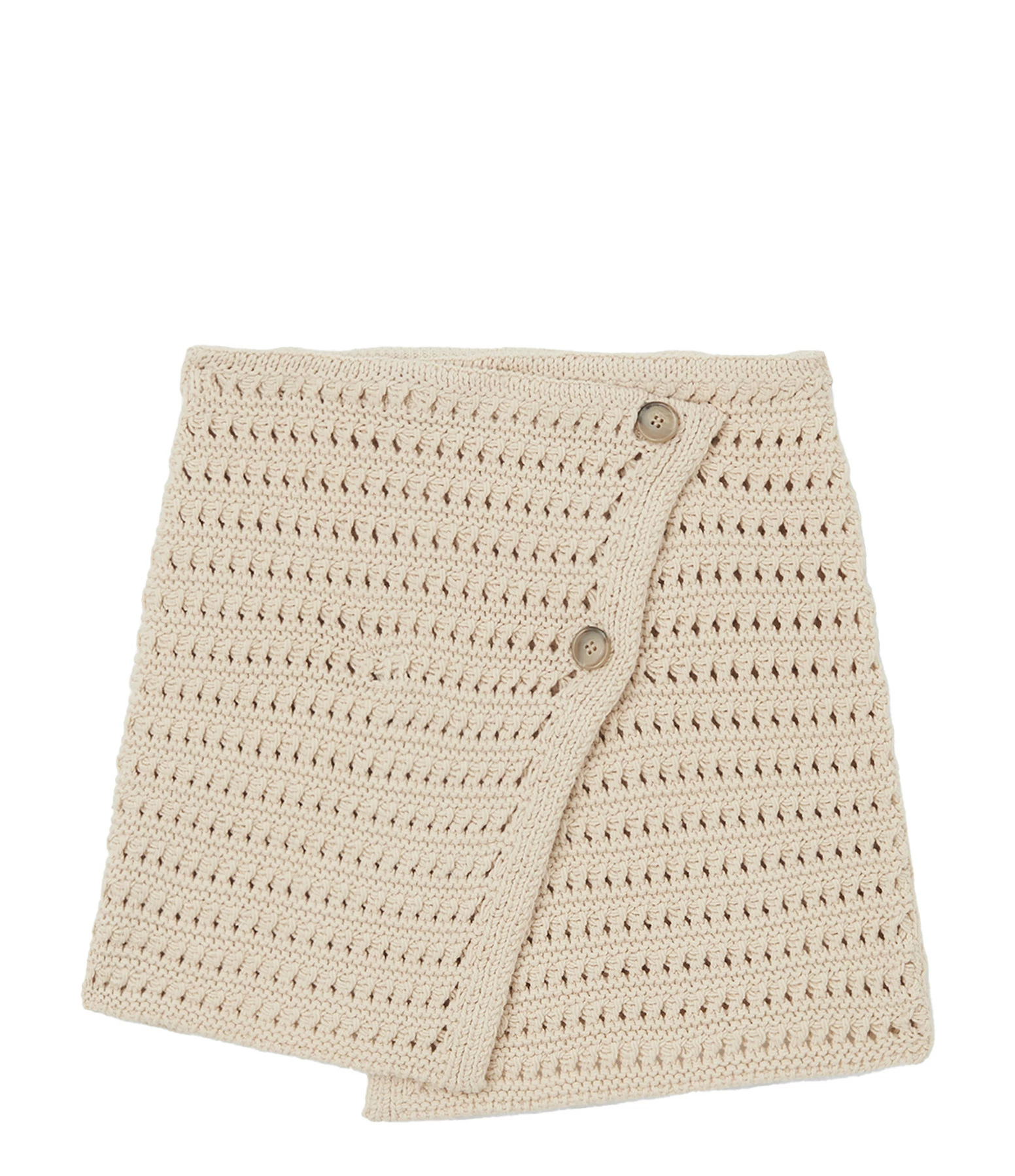 Jupe courte en coton effet crochet beige. Fermeture portefeuille par boutons corne sur le devant. Coupe droite. Base droite.