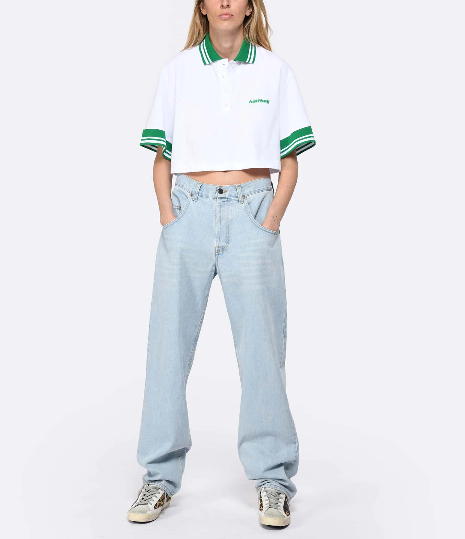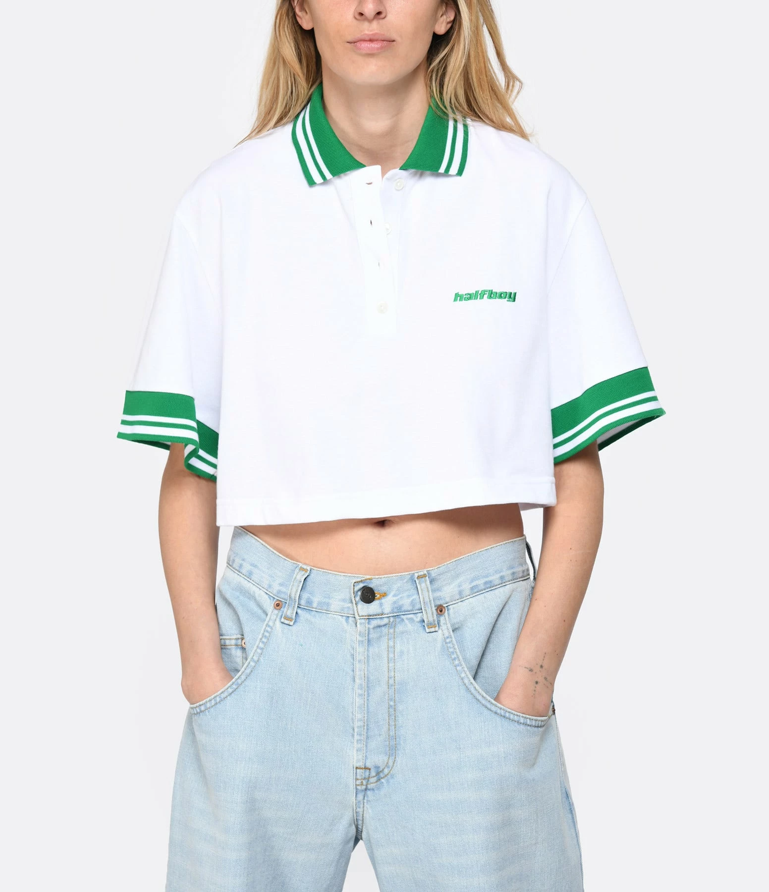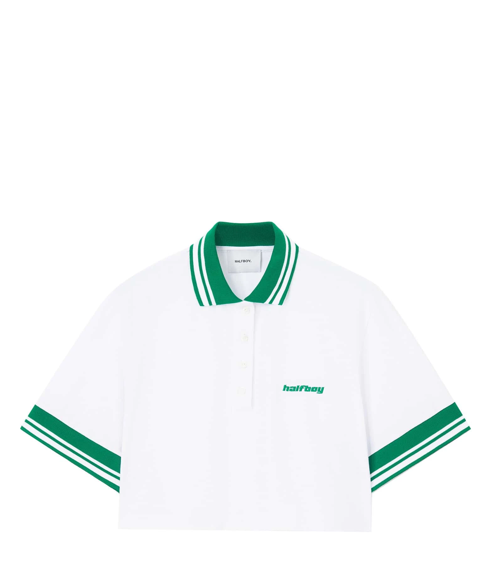 Polo court en coton blanc et vert. Inscription “halfboy” brodée en vert sur le devant côté poitrine. Col polo vert avec bandes blanches. Fermeture par boutons blancs sur le devant. Manches courtes. Coupe droite. Base droite.