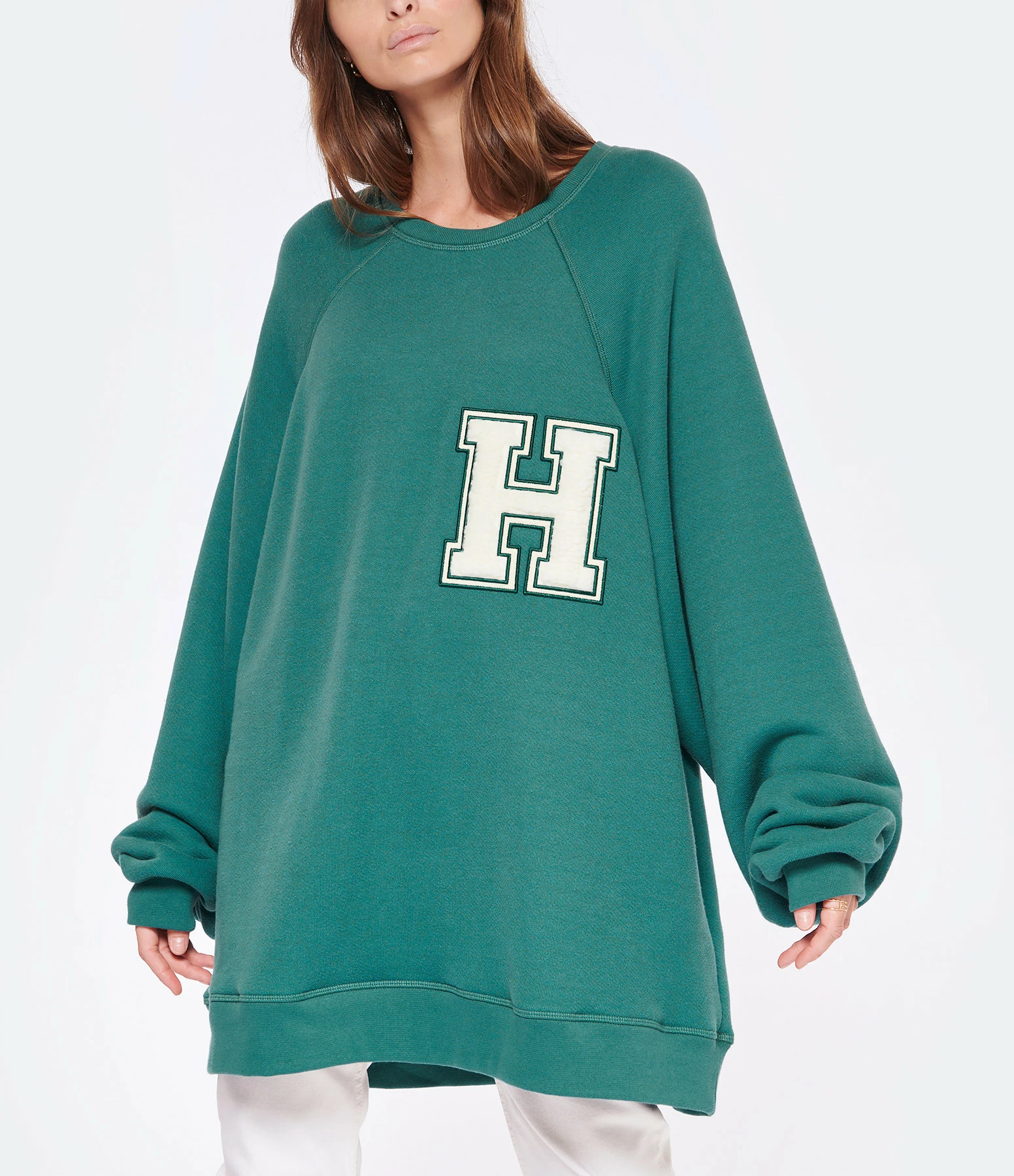 Sweatshirt molletonné en coton mélangé vert avec logo brodé en blanc en tissu éponge sur la poitrine. Col rond côtelé. Manches longues raglan avec poignets côtelés. Coupe oversized. Base droite côtelée.