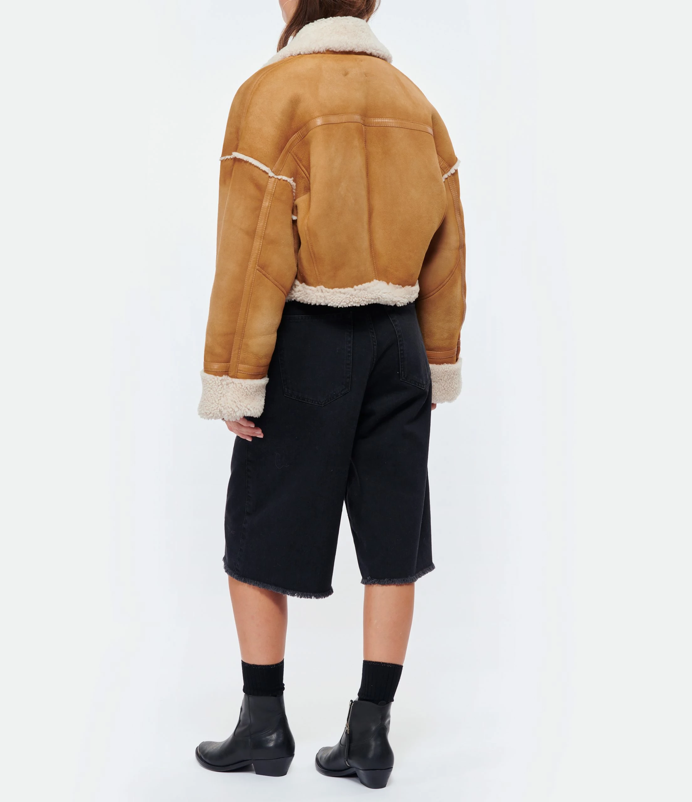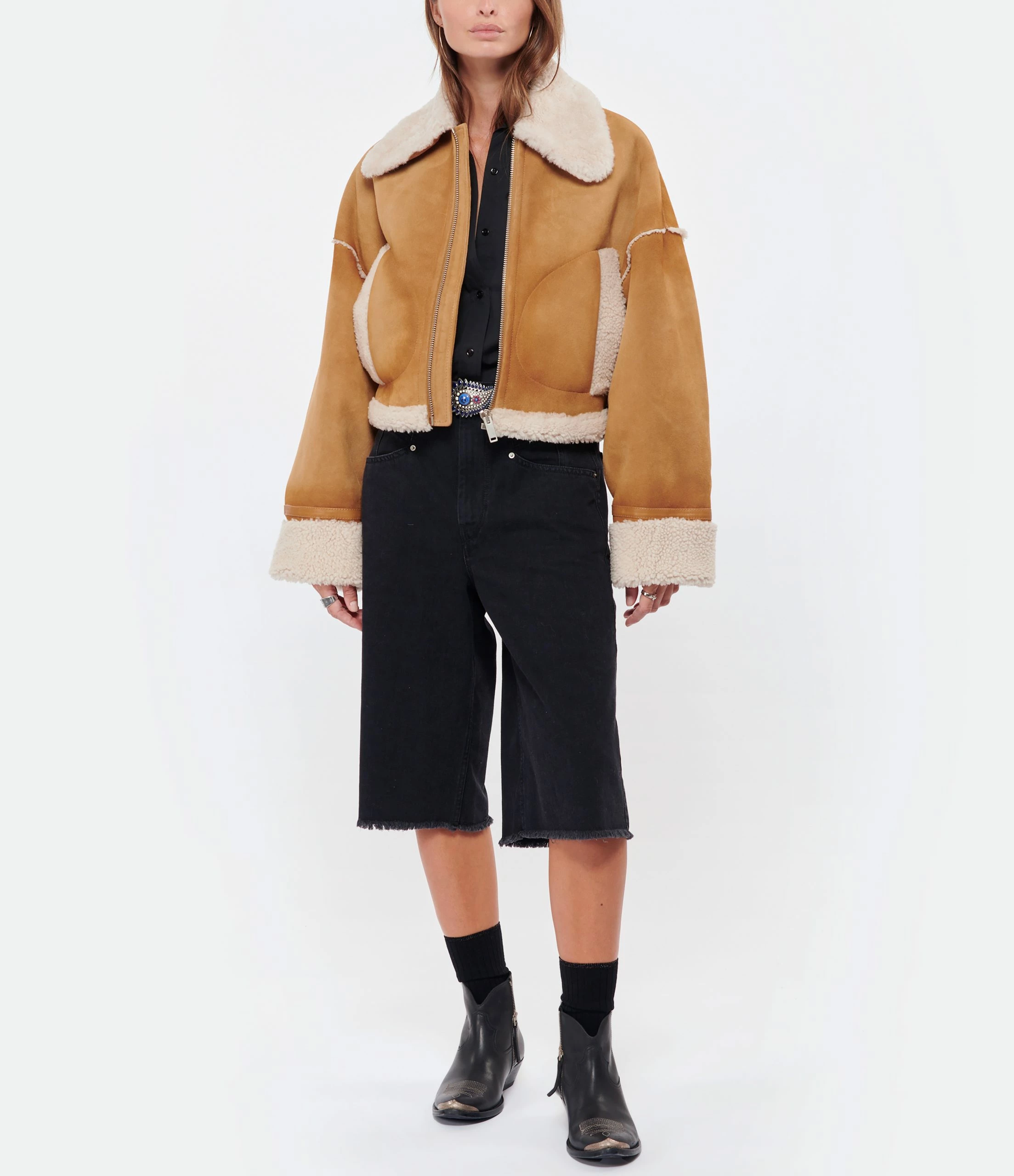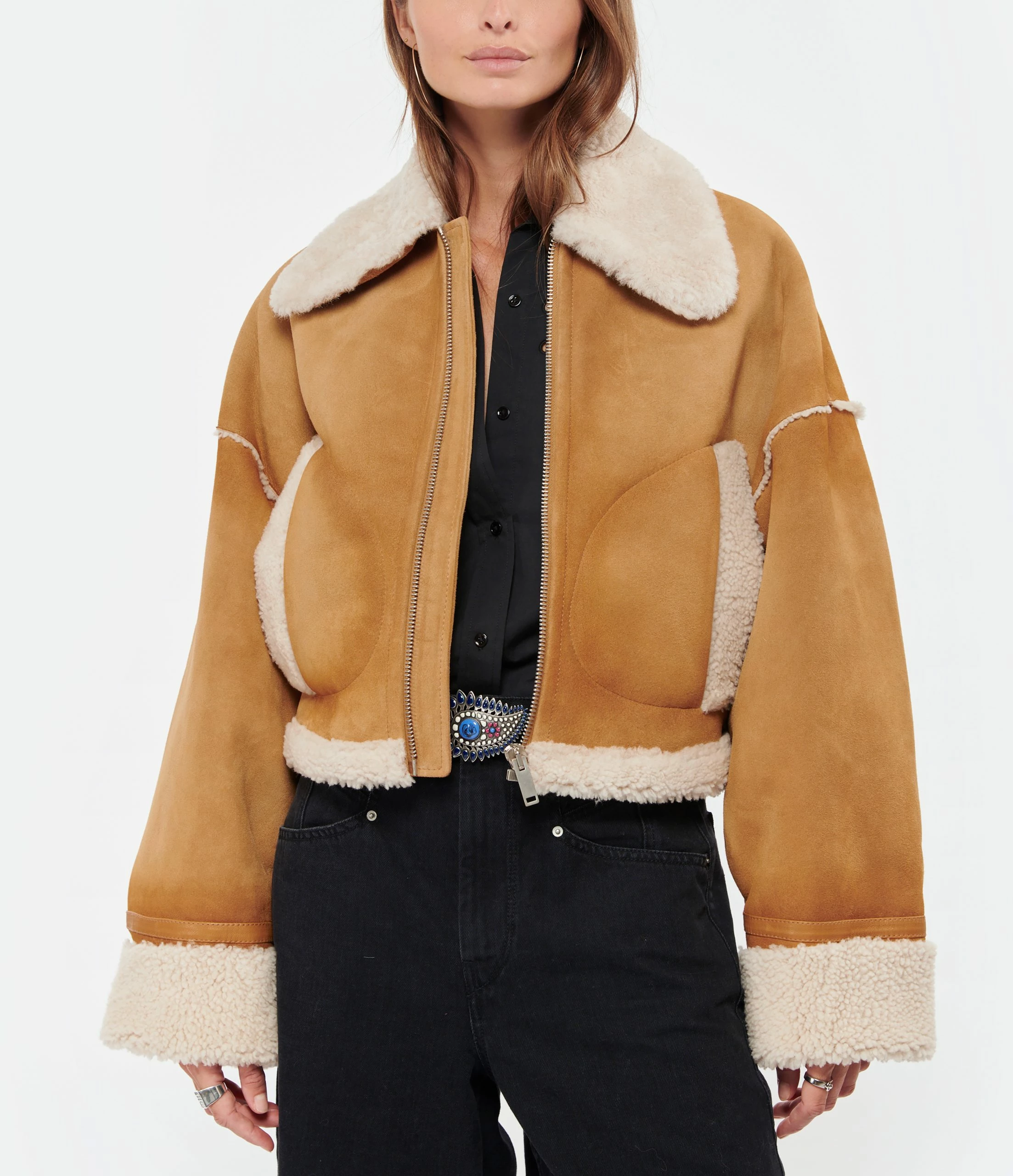 Veste aviateur courte en cuir suédé camel. Col plat à bout pointu en peau lainée.