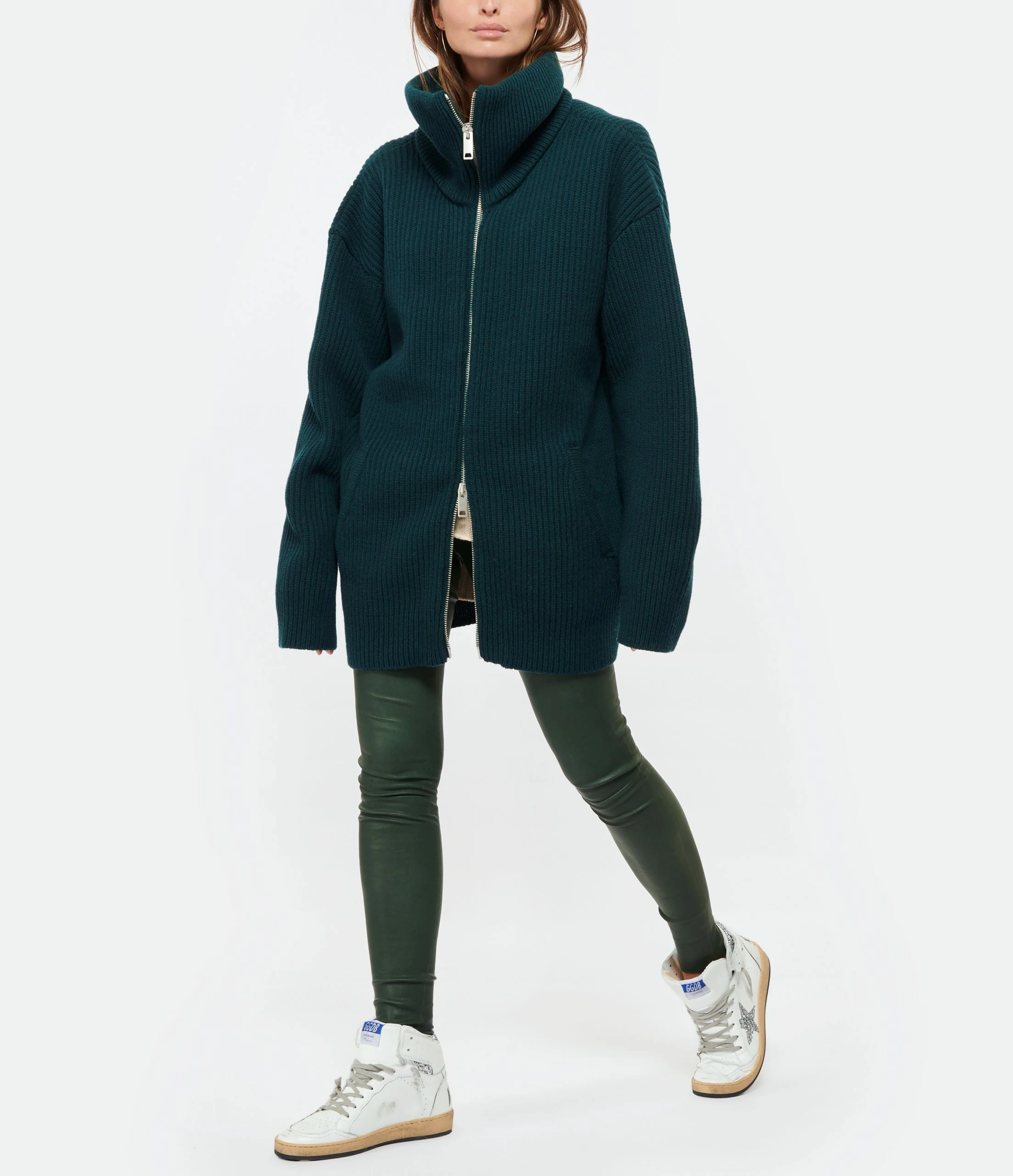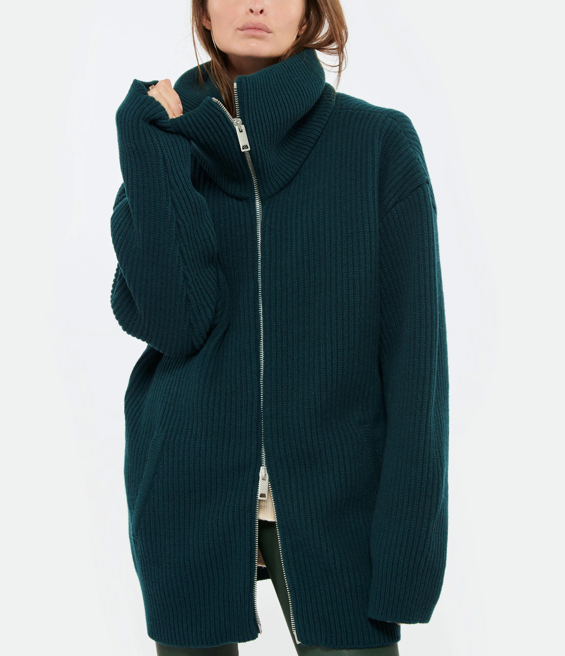 Veste en maille de laine verte. Col camionneur. Manches longues. Fermeture zippée sur le devant. Deux poches raglans sur le devant. Coupe droite. Base droite.