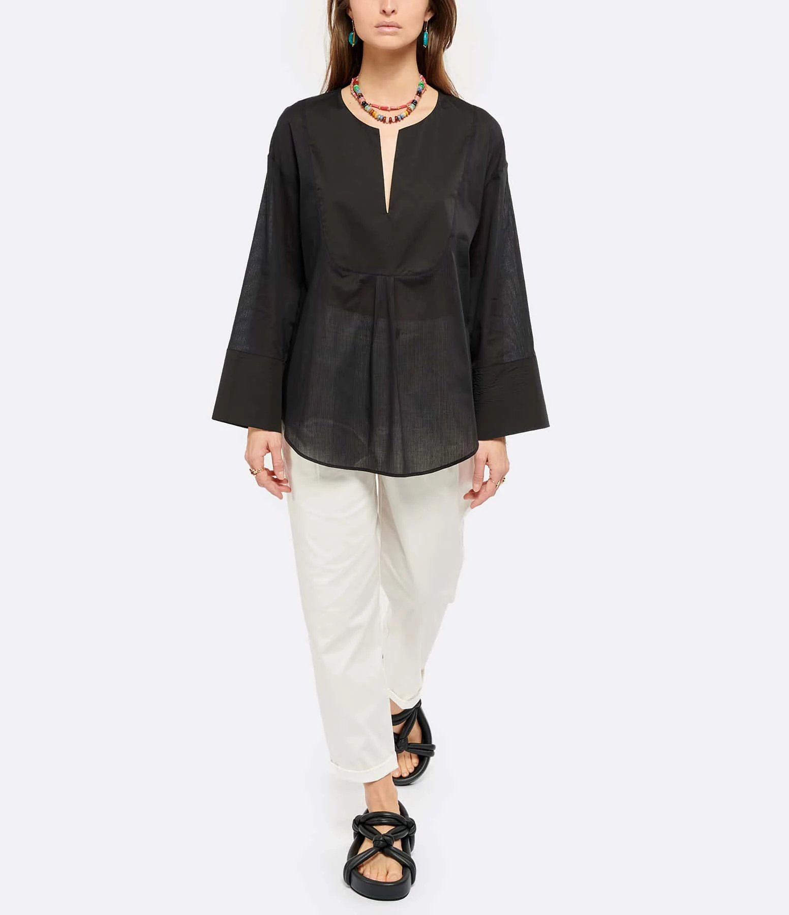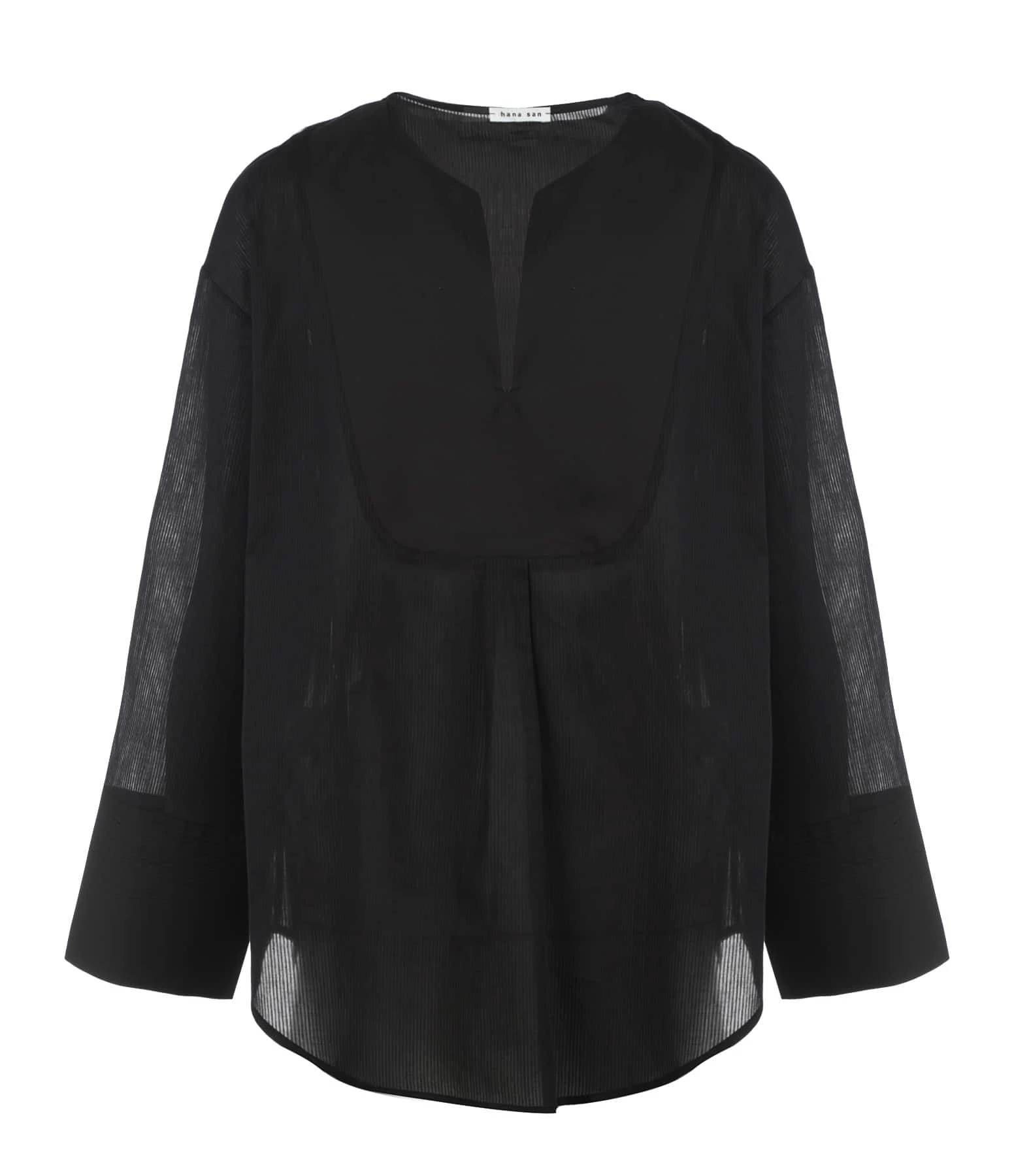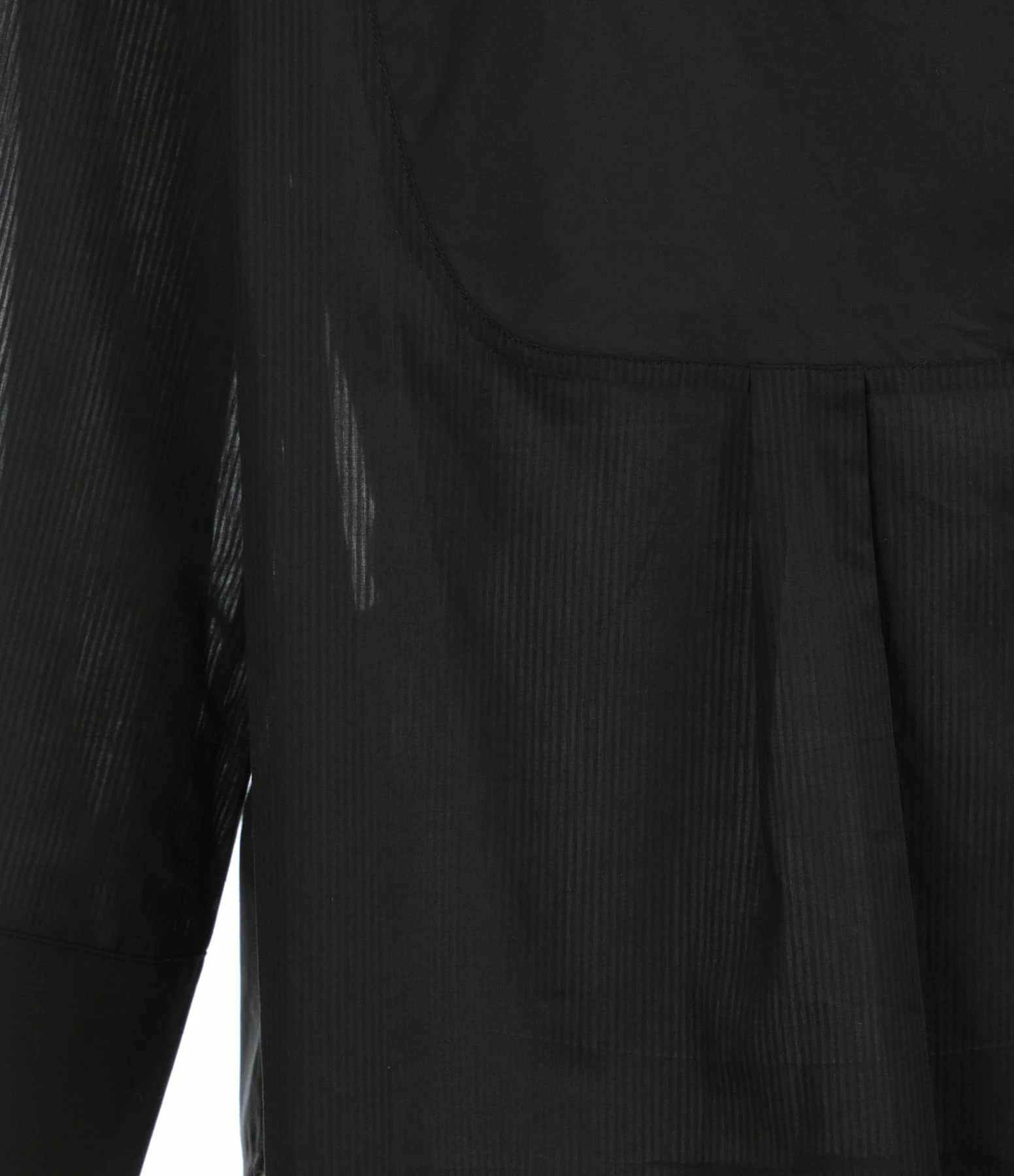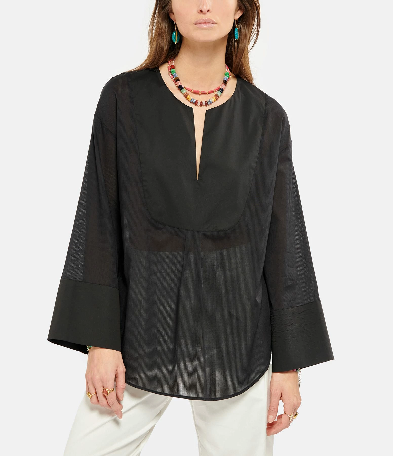Blouse en coton à fines rayures noires transparentes. Manches longues ample, tissus opaque aux poignets. Boutons aux poignets. Col en coton opaque plongeant en V. Coupe droite. Base arrondie. Non doublé.