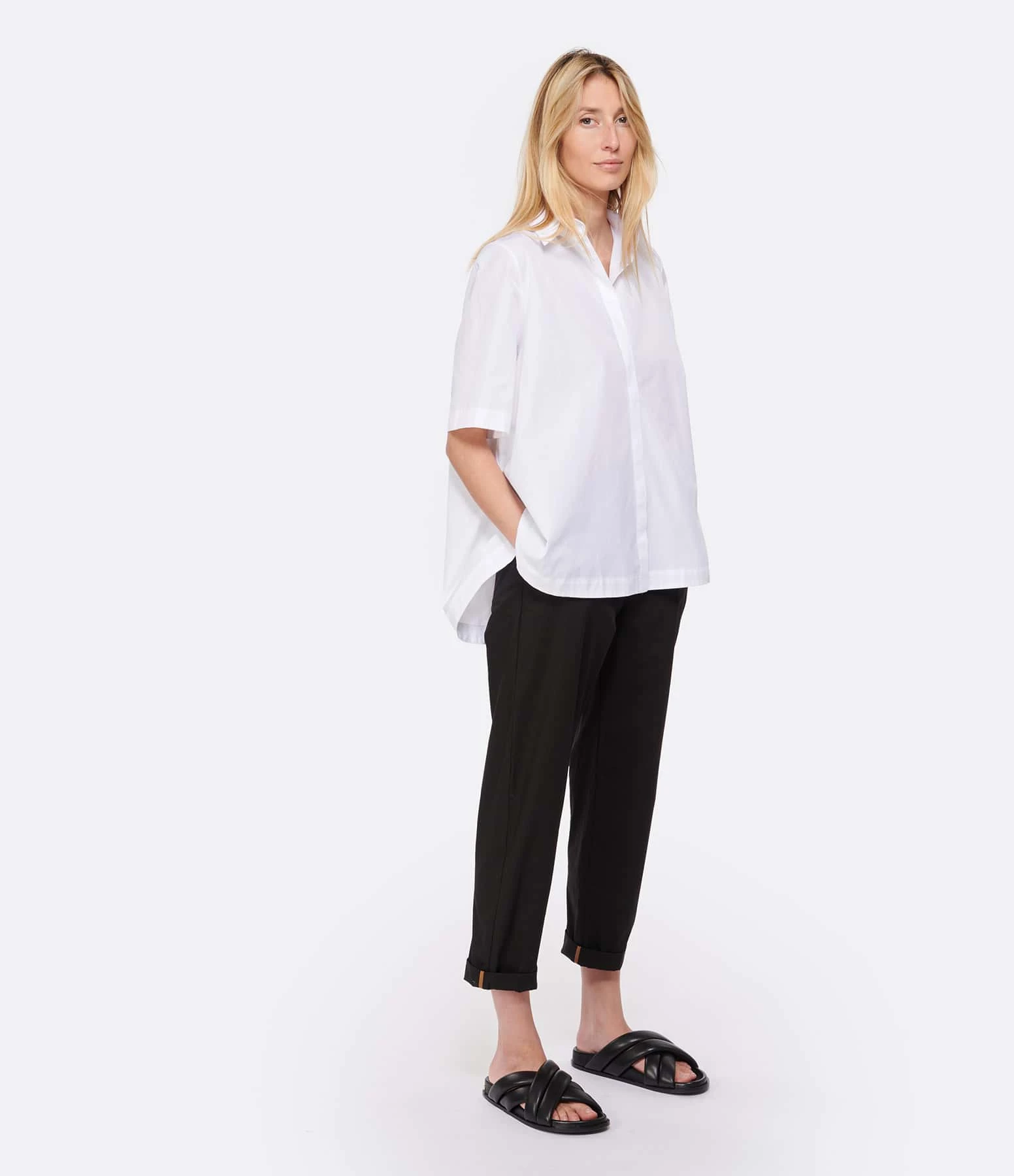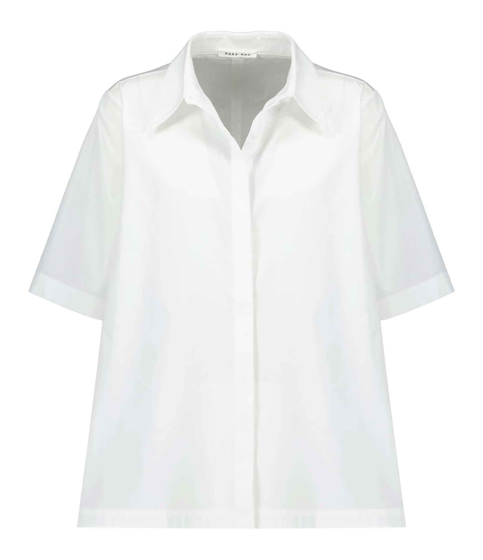 Chemise en coton blanc. Col chemise. Manches courtes. Fermeture boutonnée. Coupe ample. Base droite.