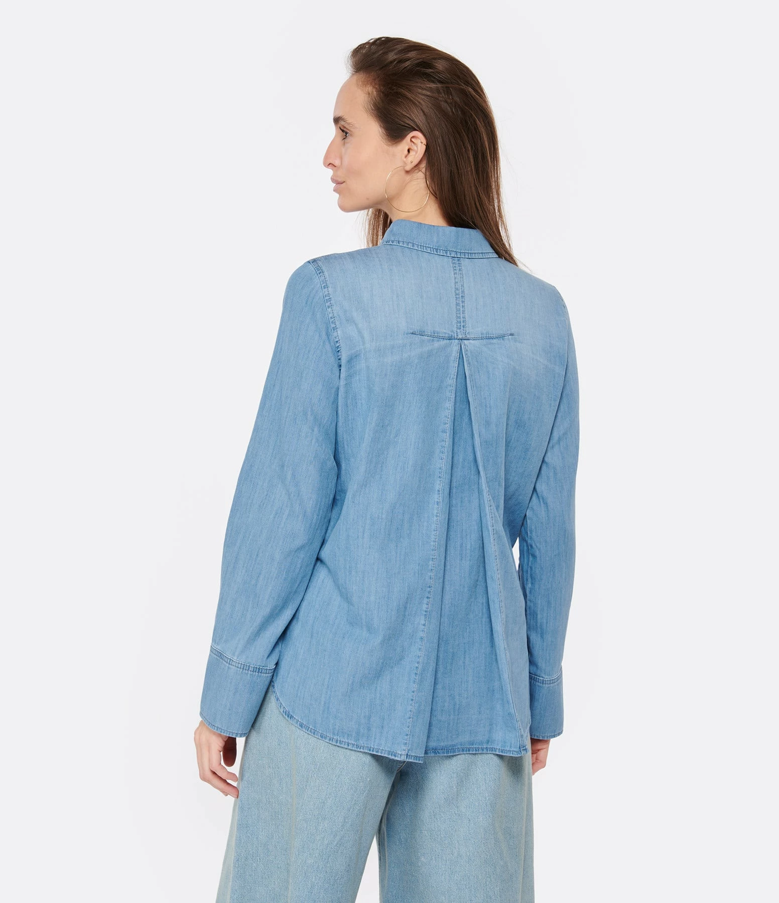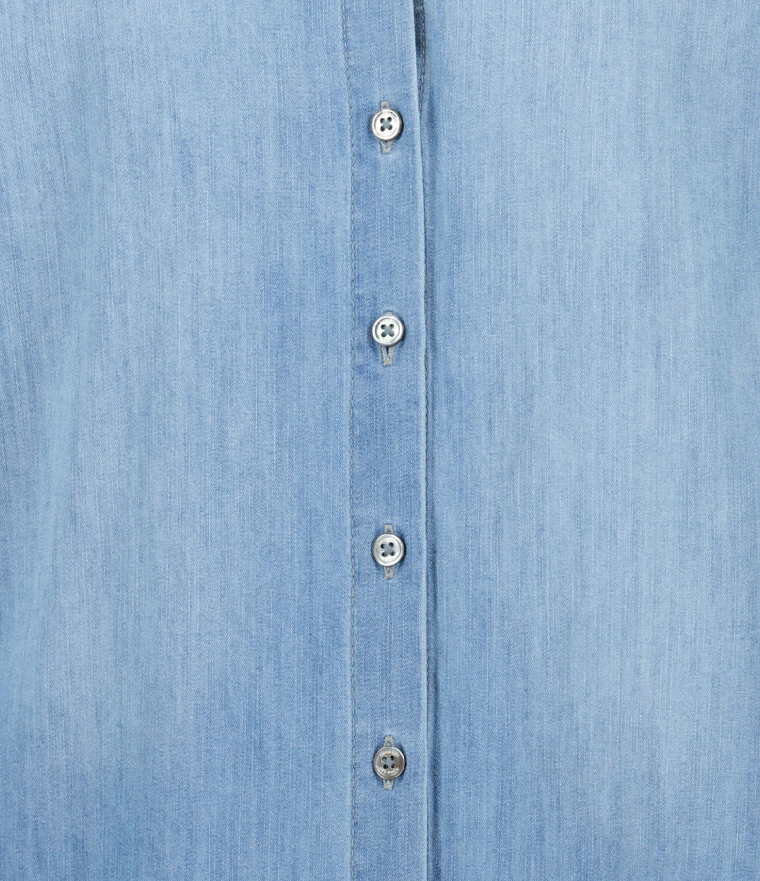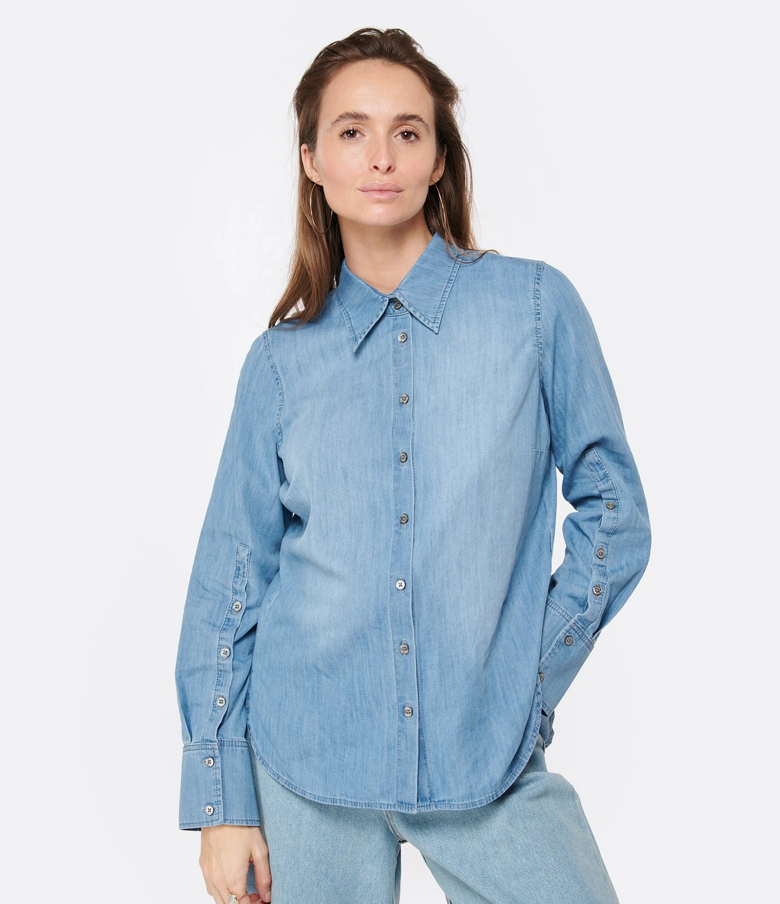 Chemise en denim de coton bleu. Col chemisier. Fermeture par boutons sur le devant. Manches longues resserrées par boutons aux poignets. Coupe droite. Base arrondie.