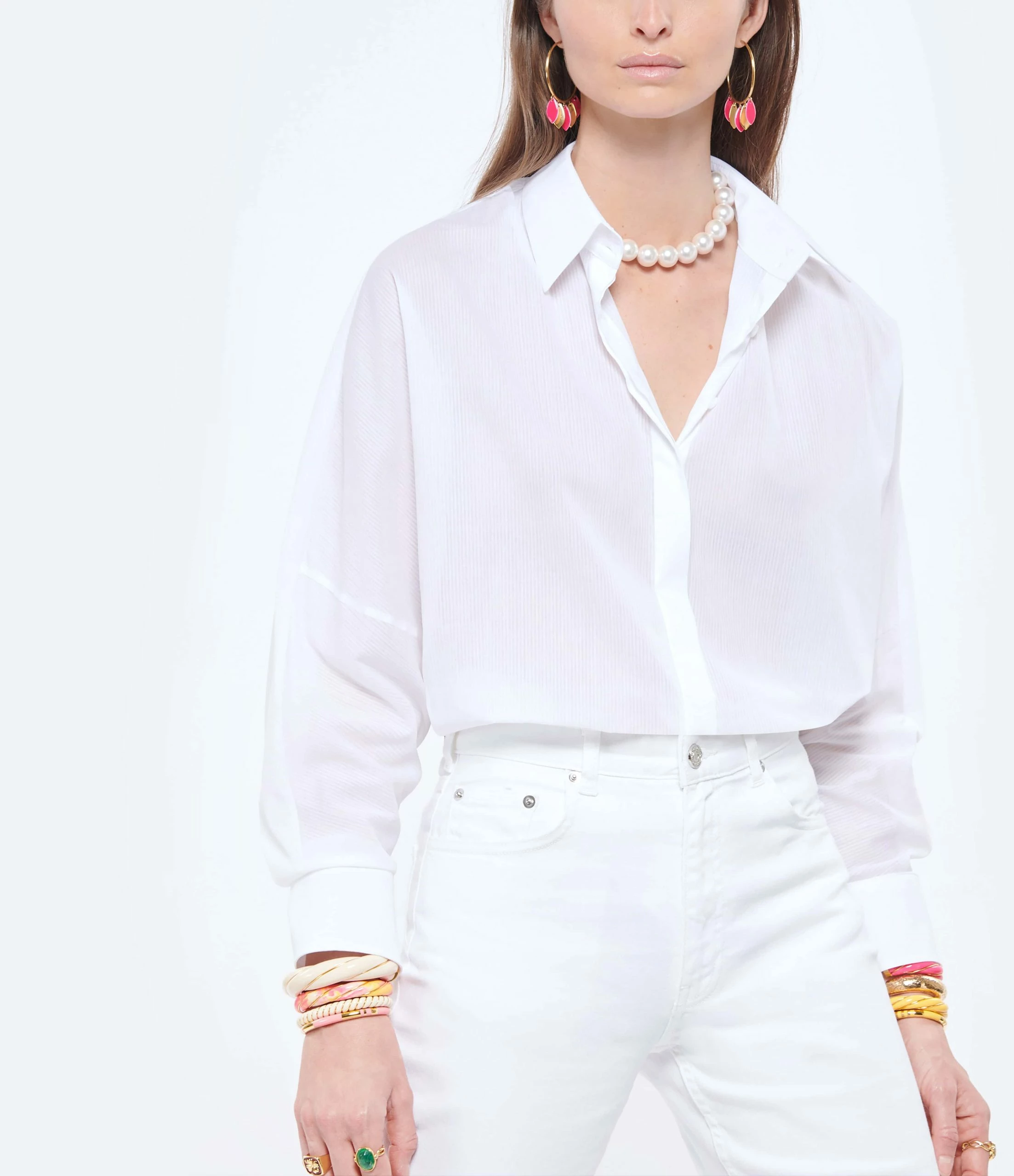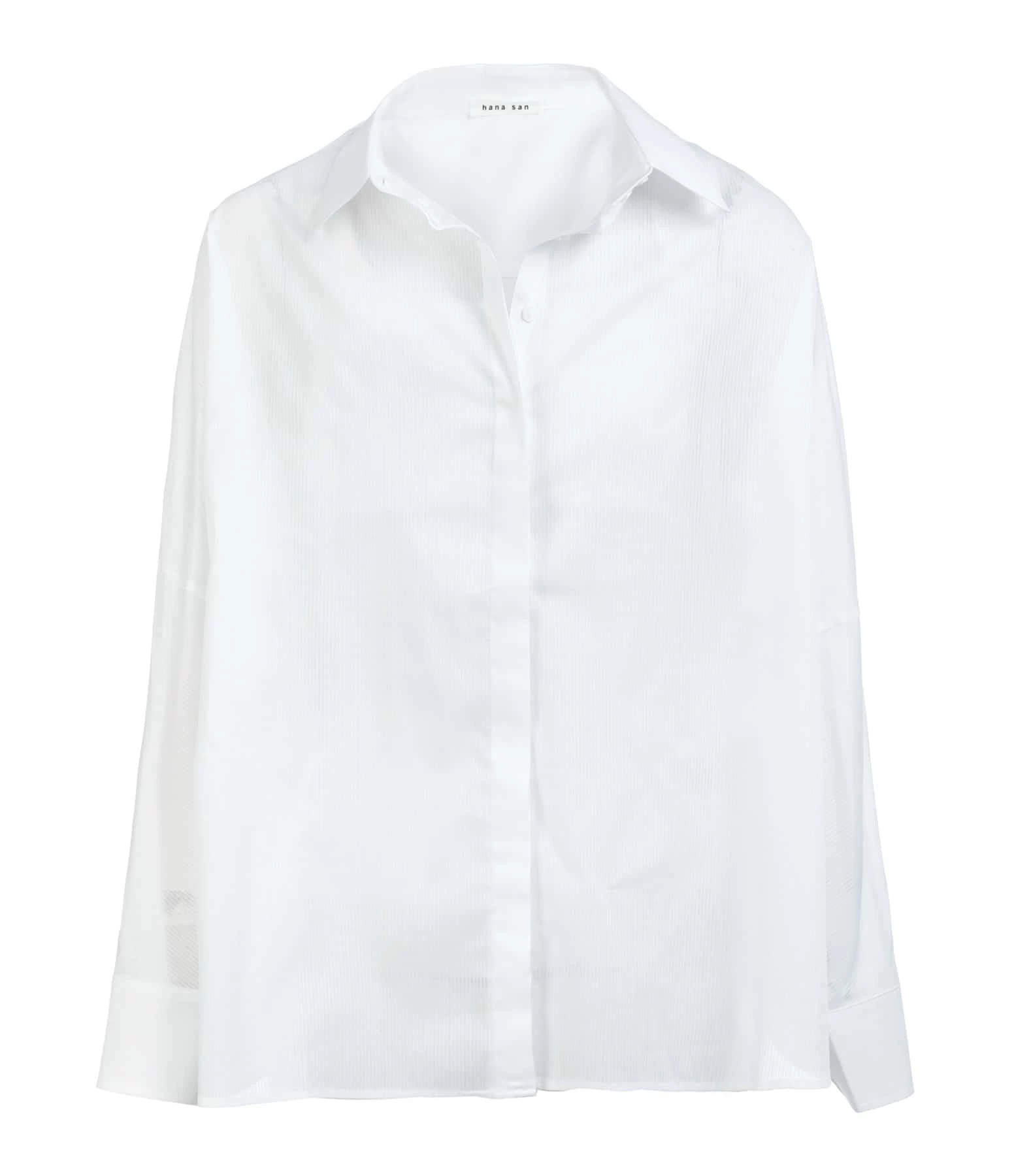 Chemise fluide en coton à fine rayures blanches. Manches longues chauve souris avec boutons aux poignets. Col chemise. Fermeture à bouton nacré gris. Coupe ample. Base droite avec côté arrondis, plus courte à l’avant. Non Doublé.