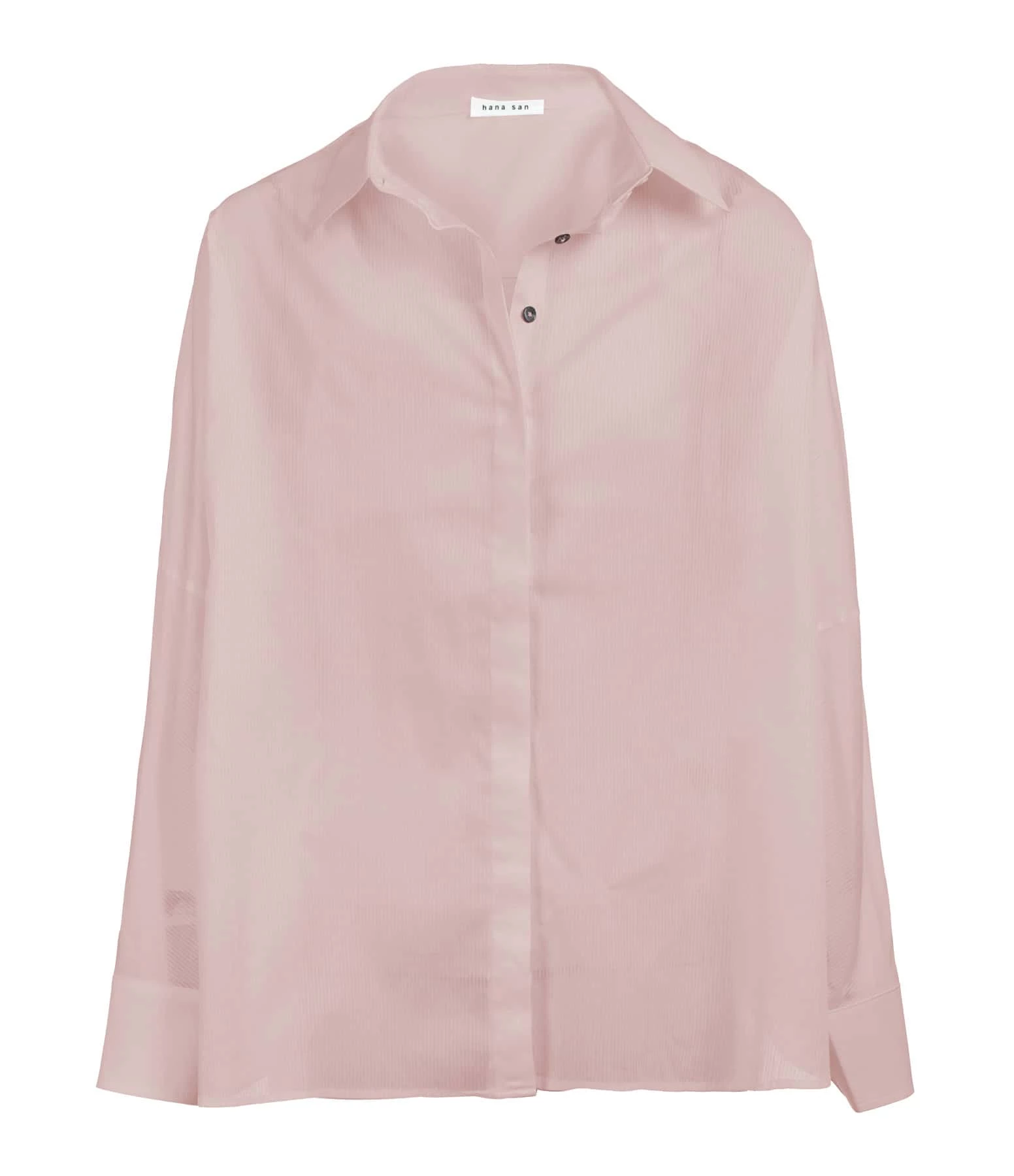 Chemise fluide en coton à fine rayures roses. Manches longues chauve souris avec boutons aux poignets. Col chemise. Fermeture à bouton nacré gris. Coupe ample. Base droite avec côté arrondis, plus courte à l’avant. Non Doublé.
