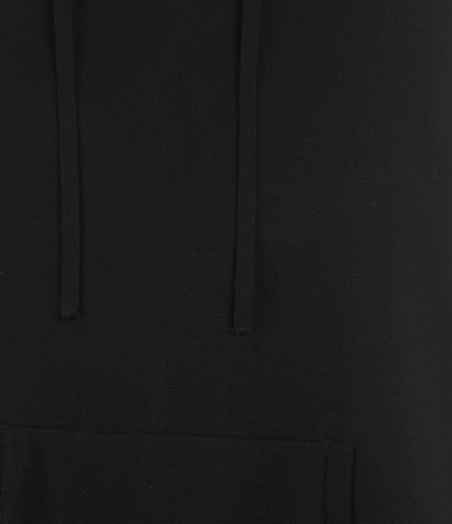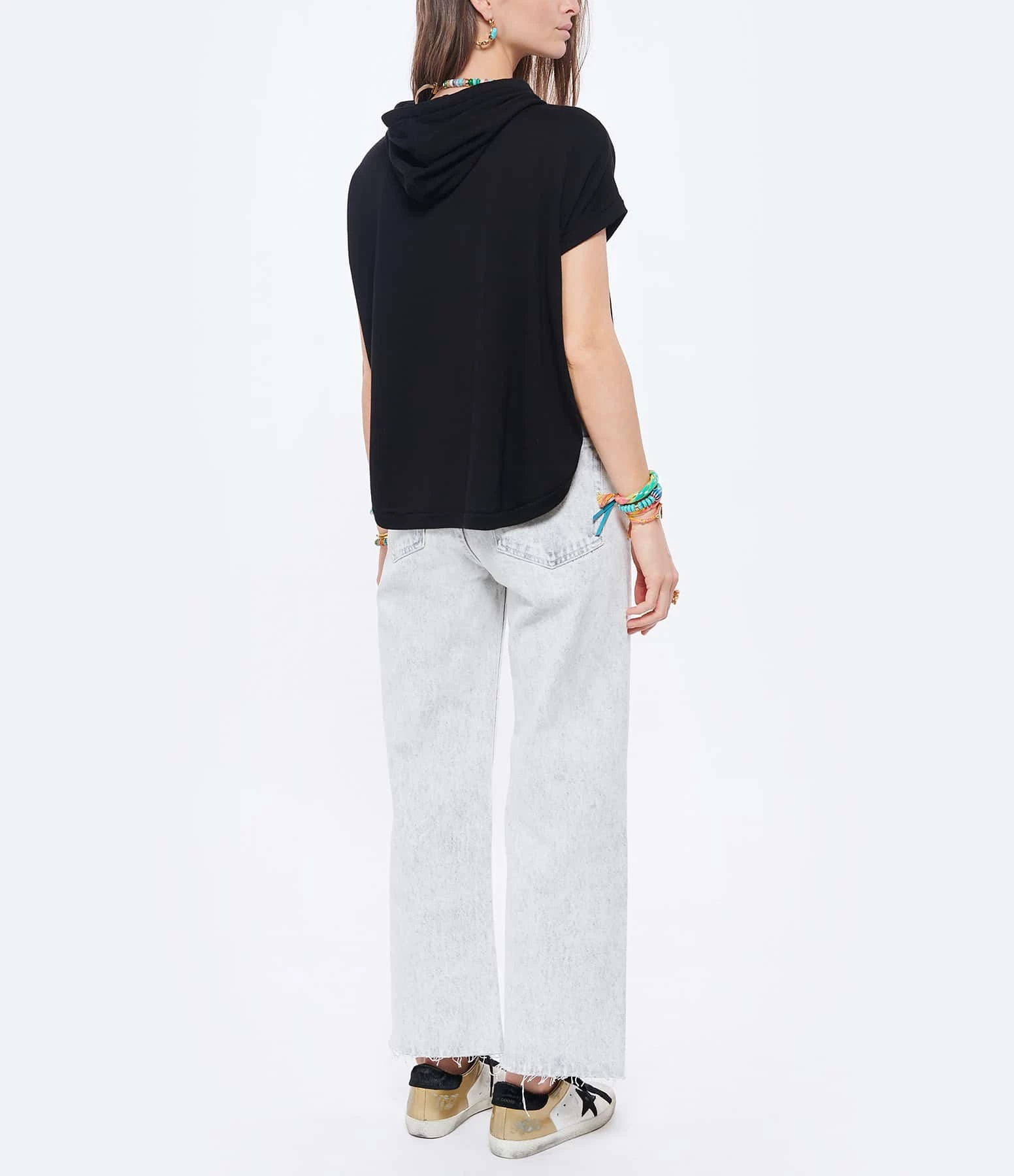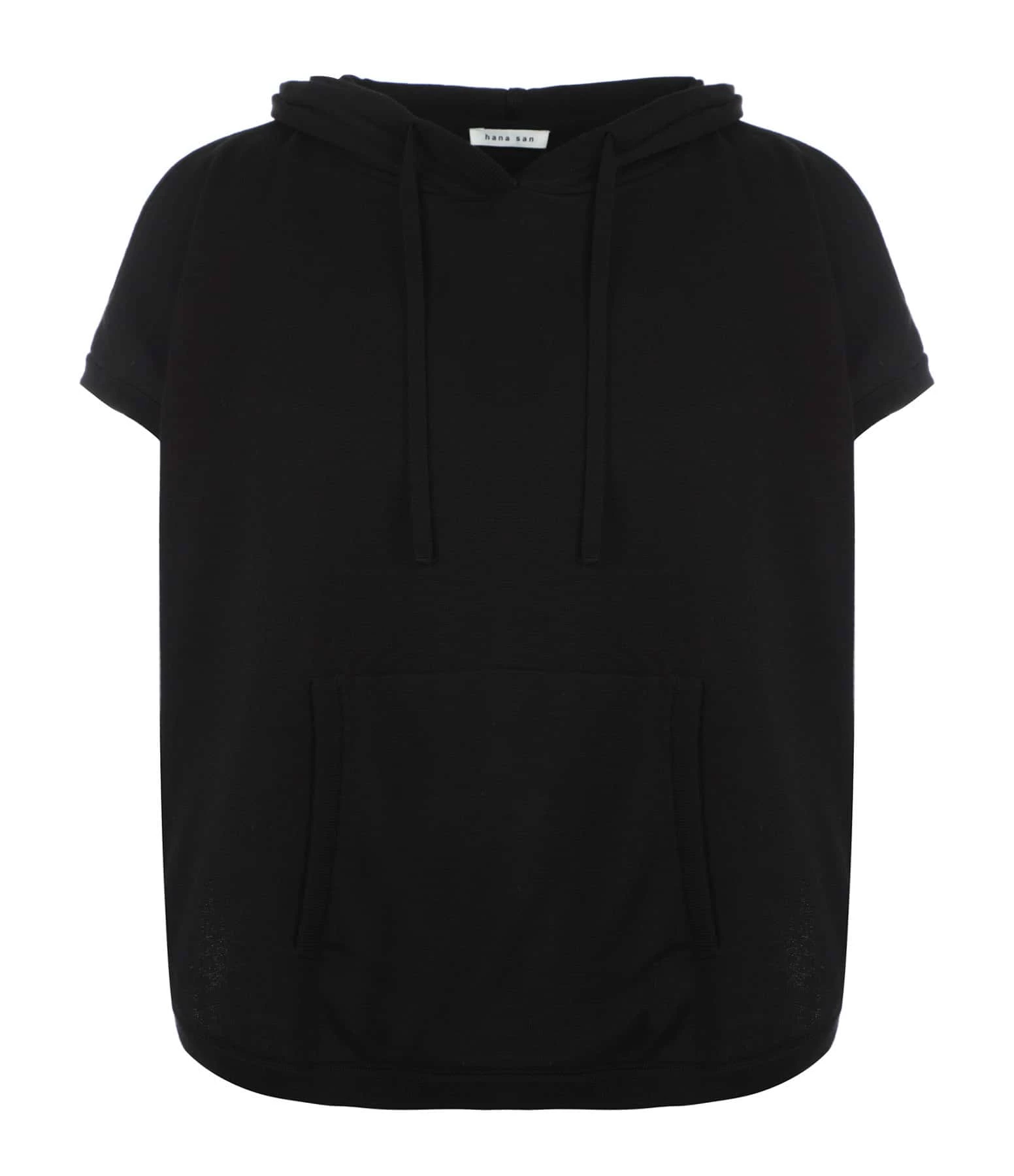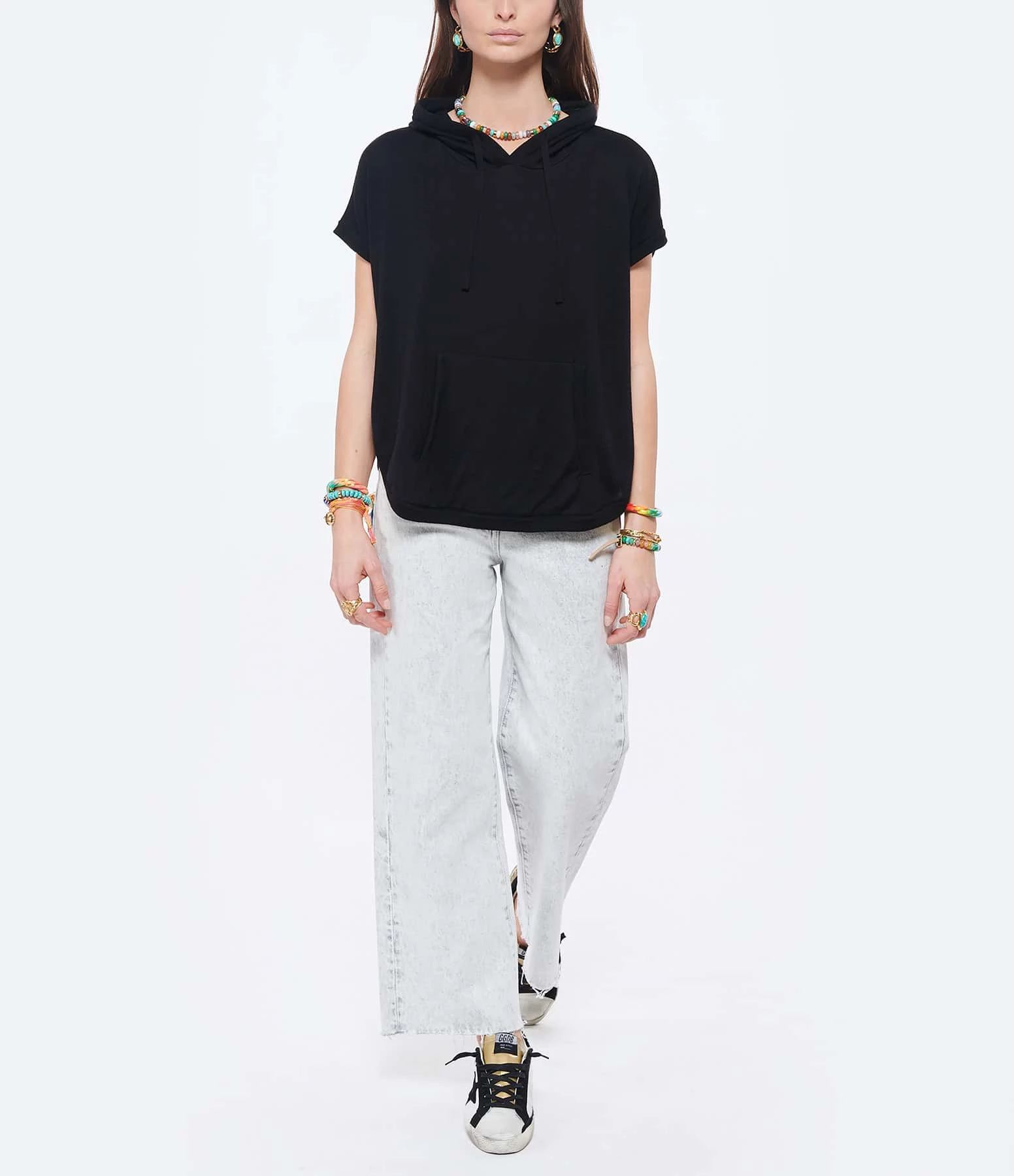 Pull manches courtes en coton noir. Capuche avec liens de serrage. Une poche kangourou à l’avant. Coupe droite. Base arrondie.