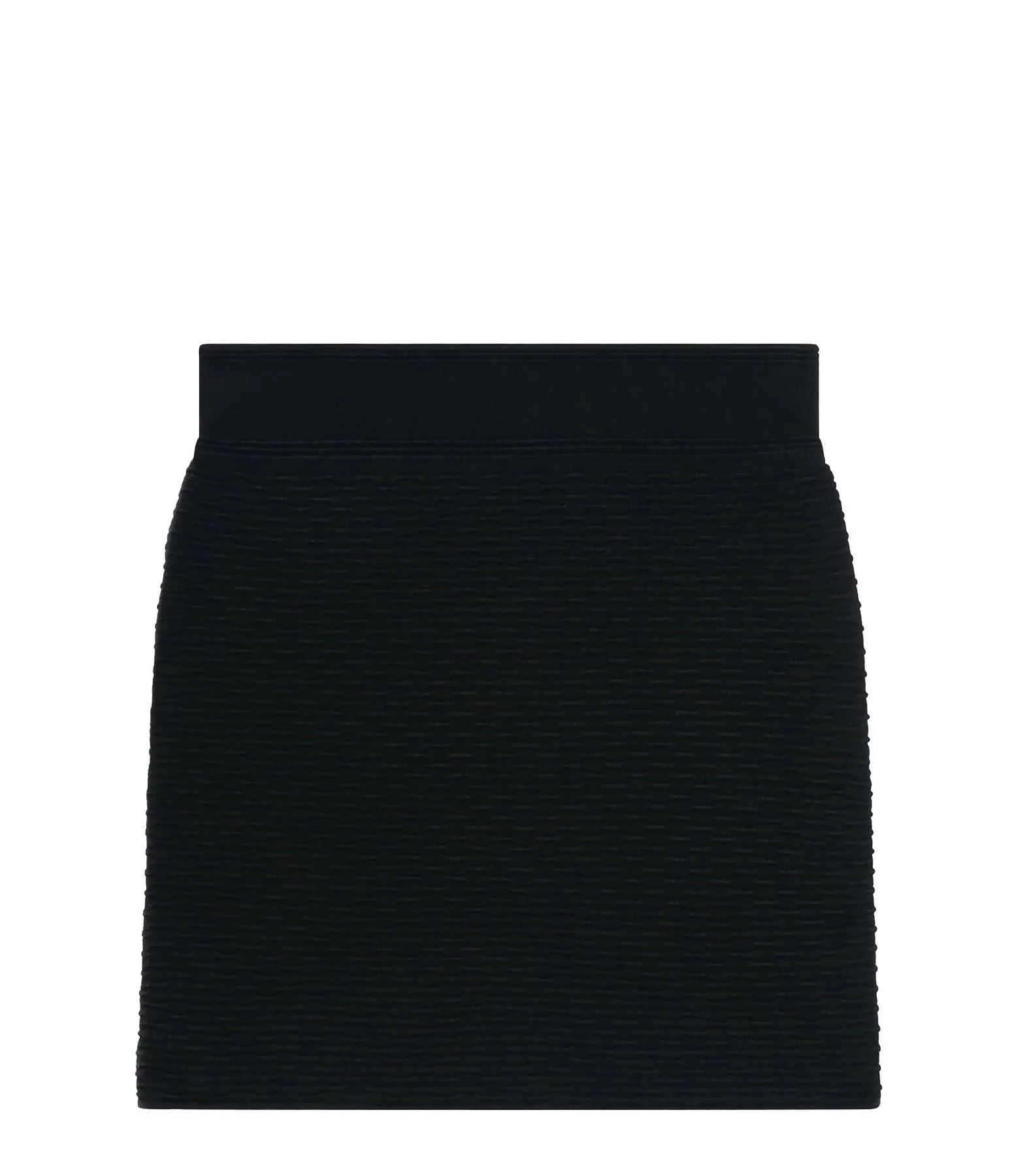 Jupe courte noire. Matière texturée. Taille élastiquée. Coupe ajustée. Base droite.