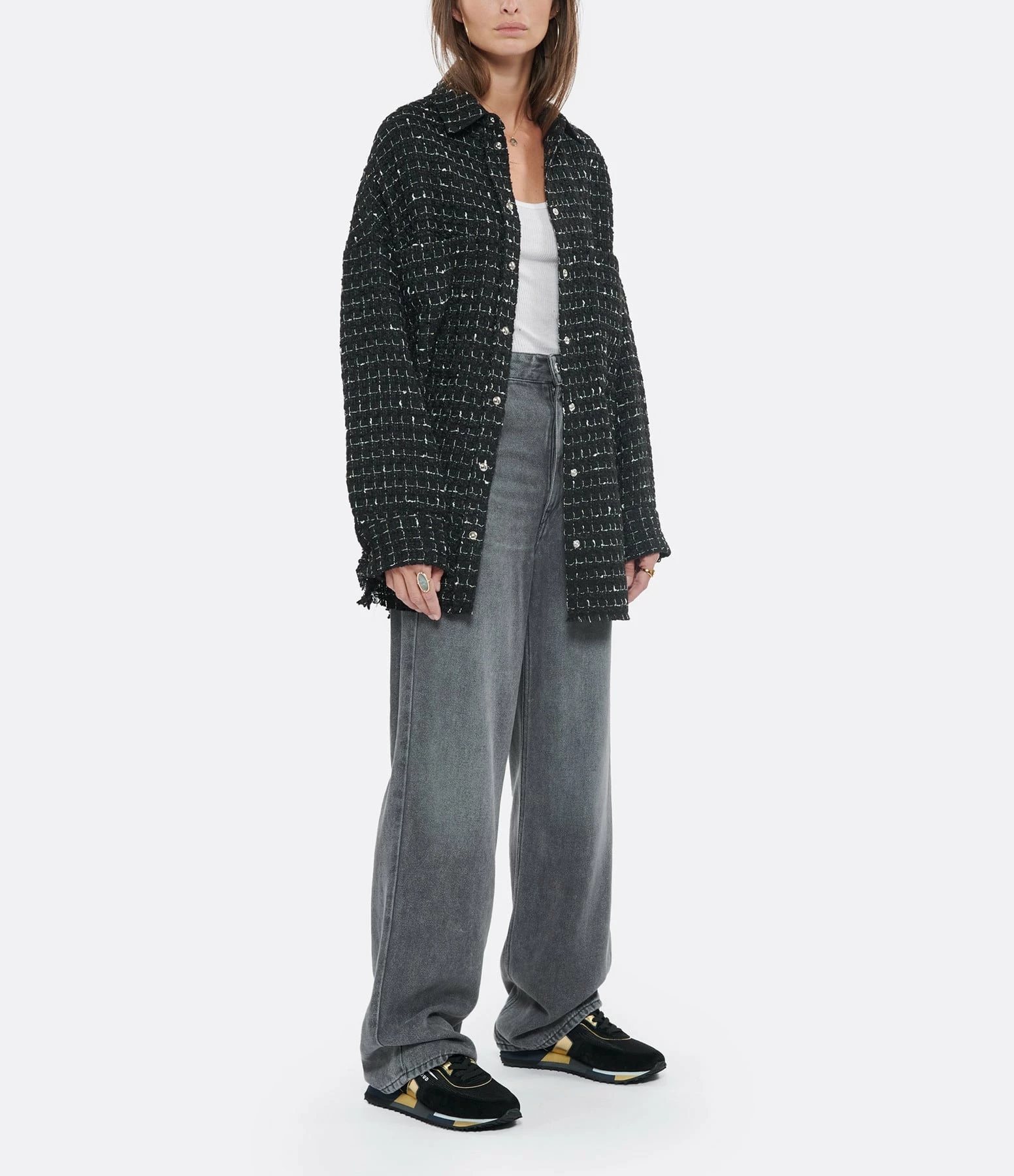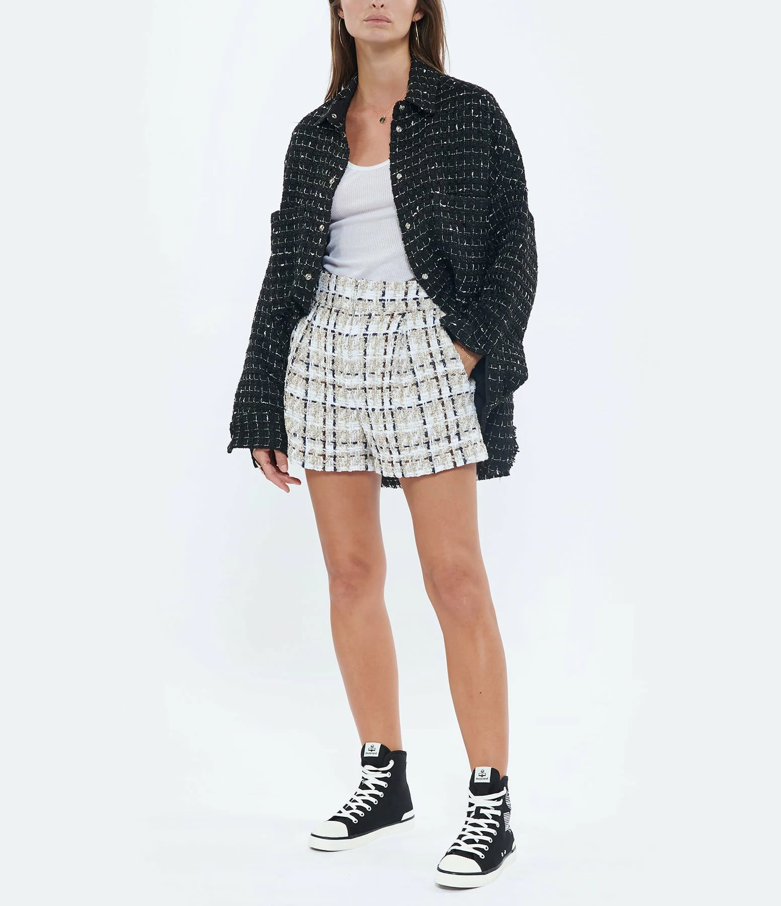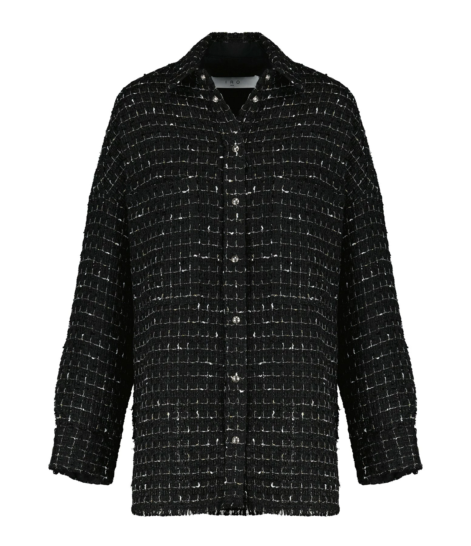 Surchemise en tweed à carreaux noir et blanc. Col chemisier. Fermeture pressionnée sur le devant. Boutons métalliques. Manches longues amples avec fente et poignet pressionné. Deux poches plaquées poitrine. Coupe droite large. Fentes latérales. Base arrondie avec bords francs.