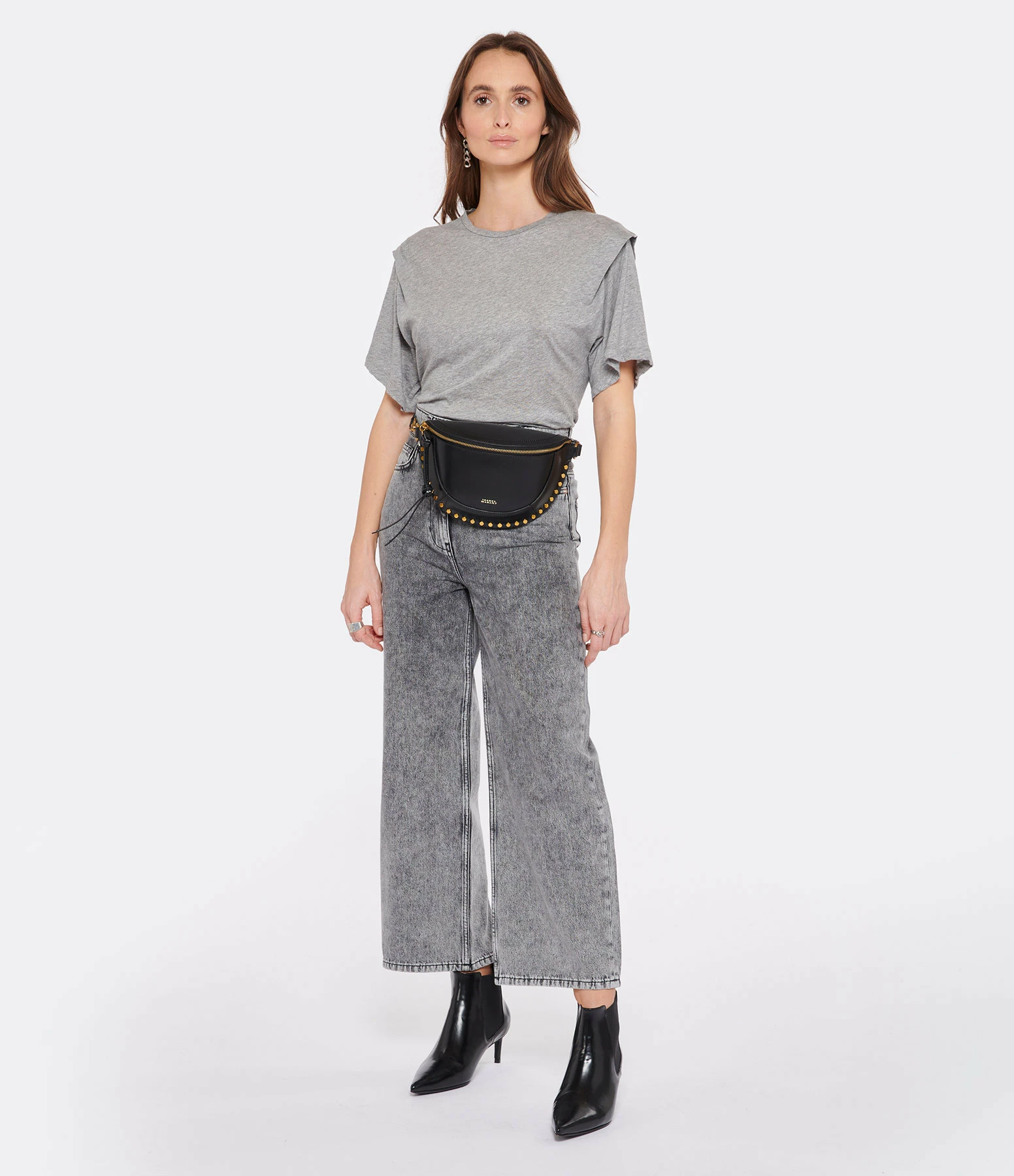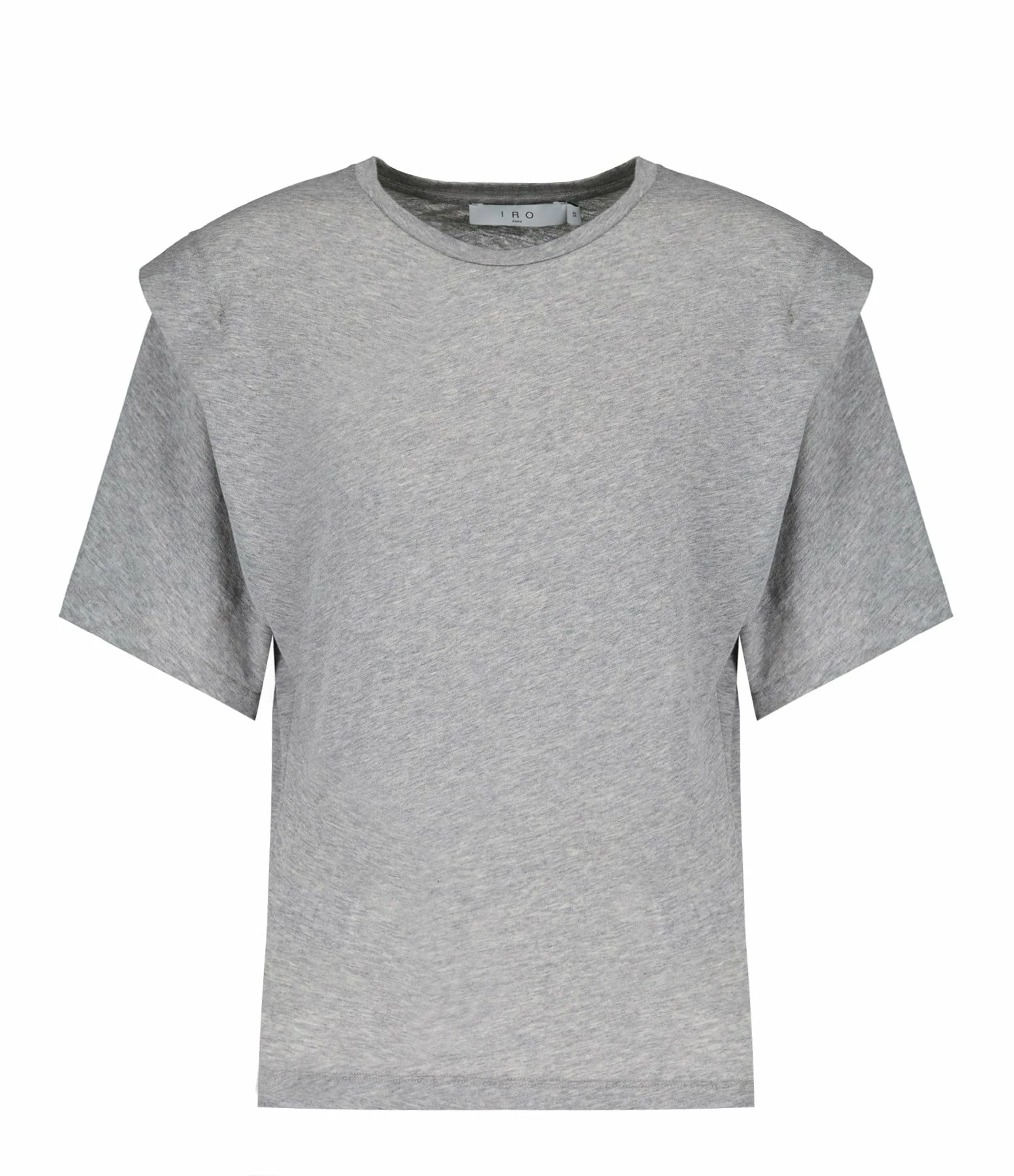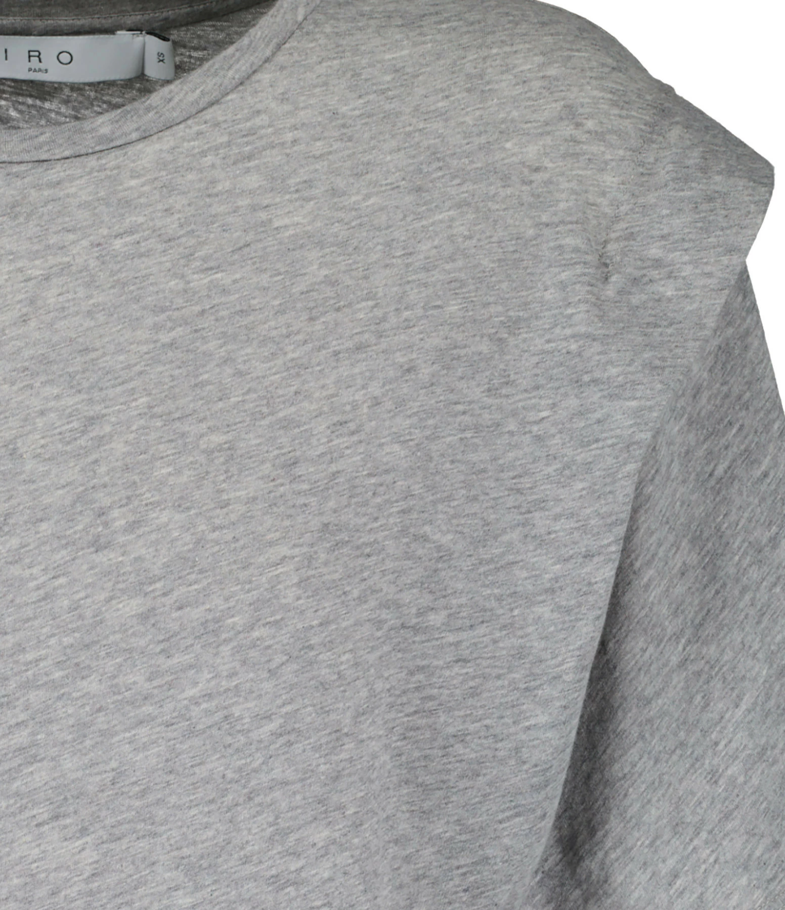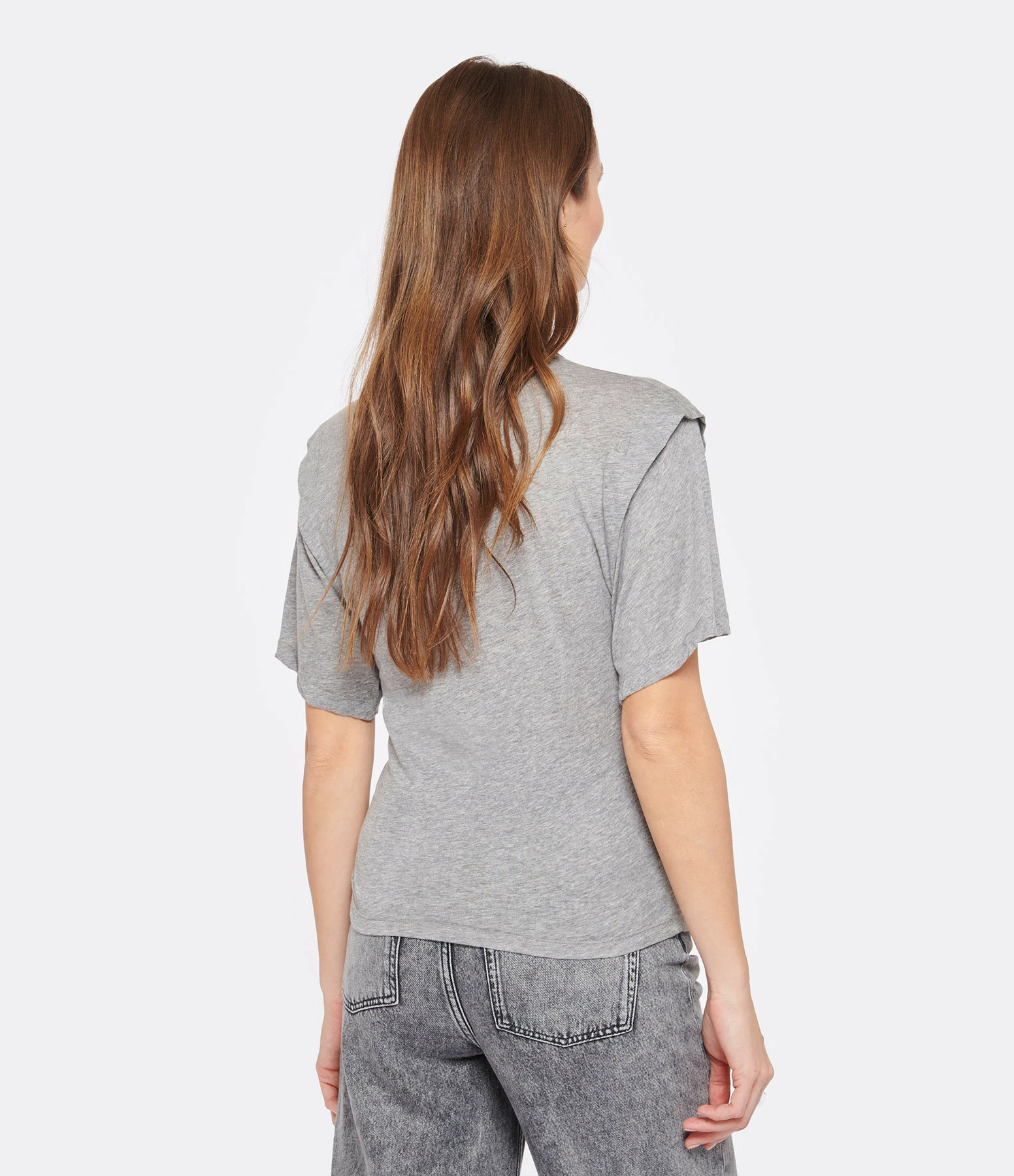 Top gris fluide à volant sur les épaules. Col rond. Manches courtes.