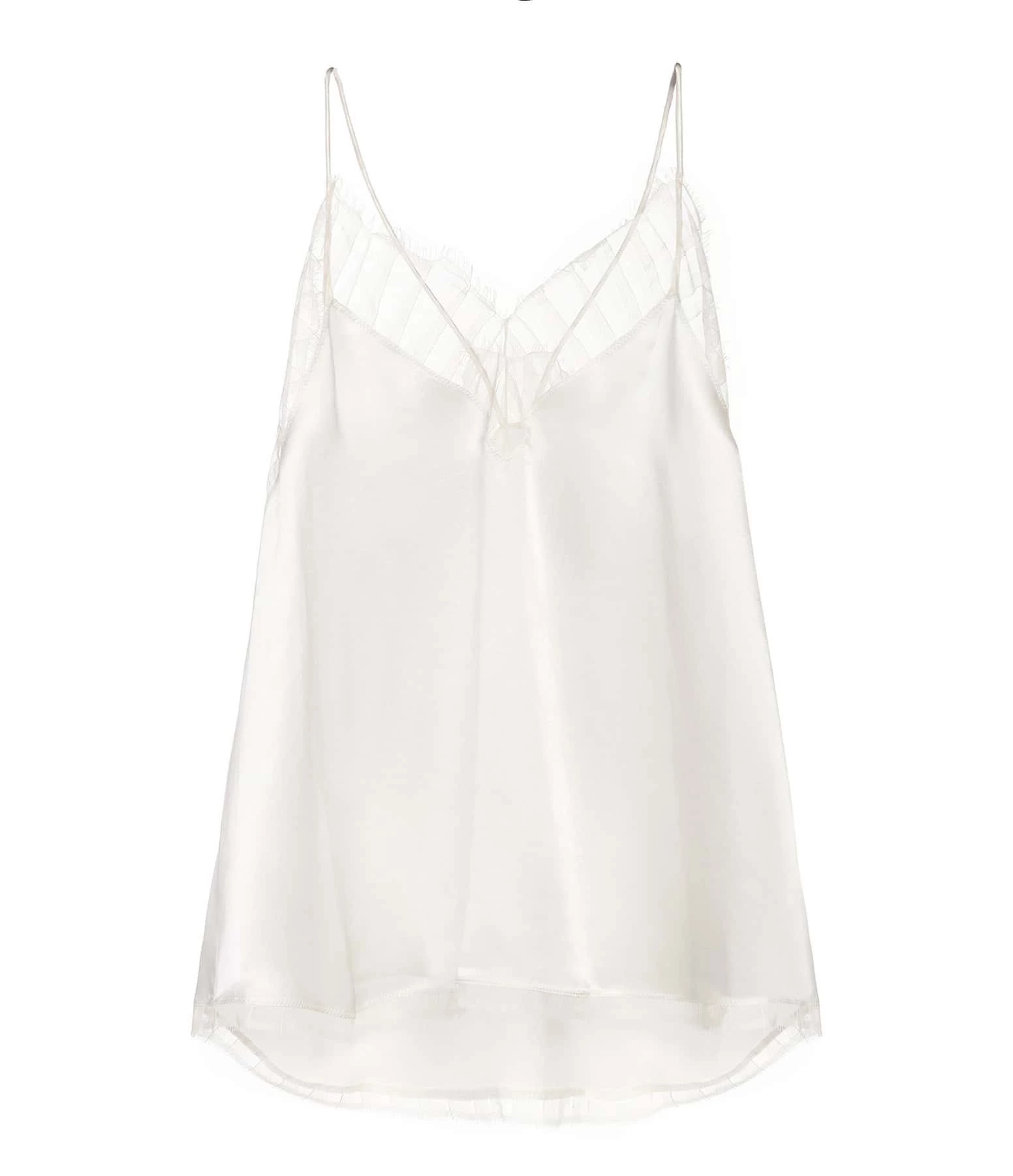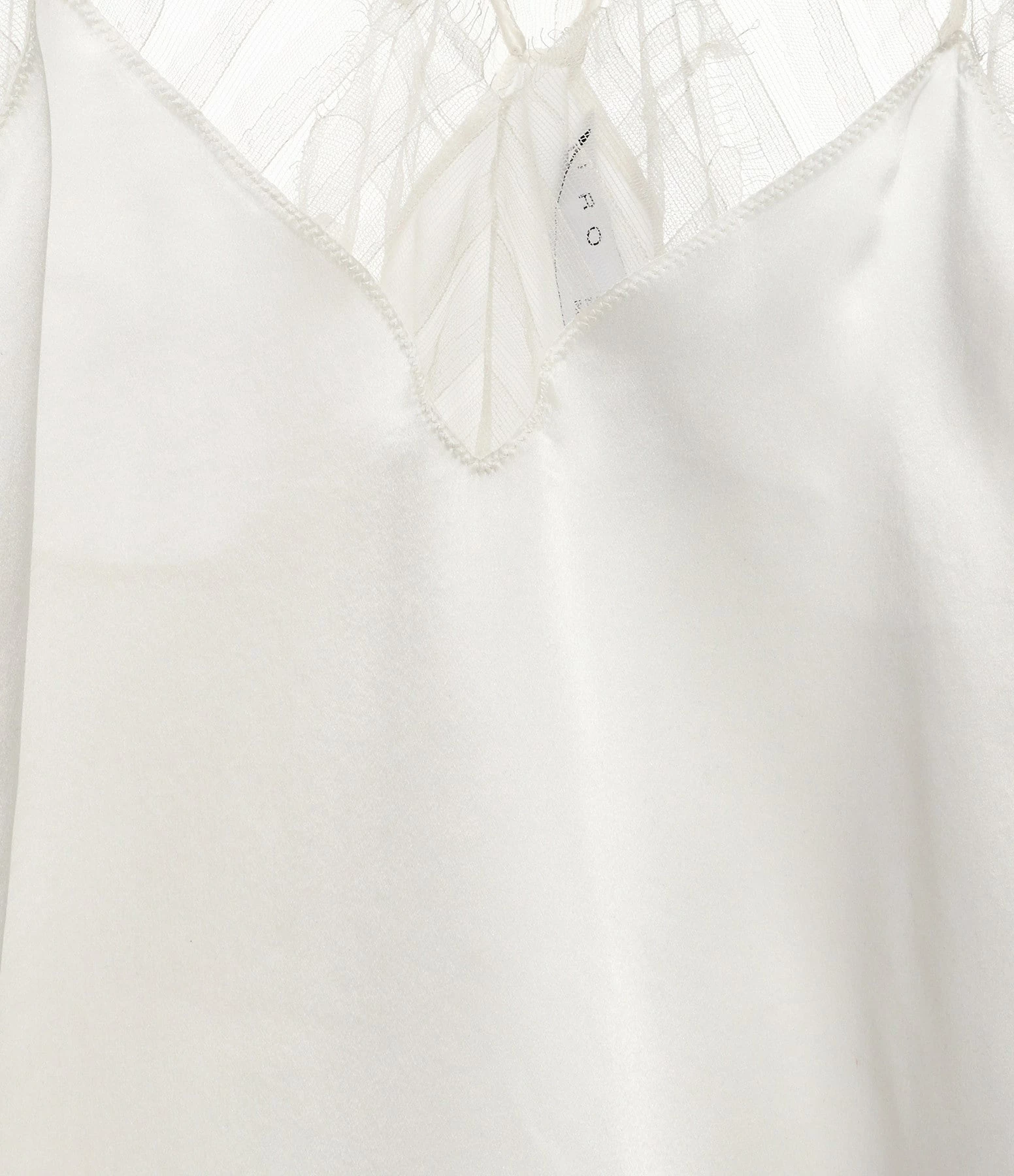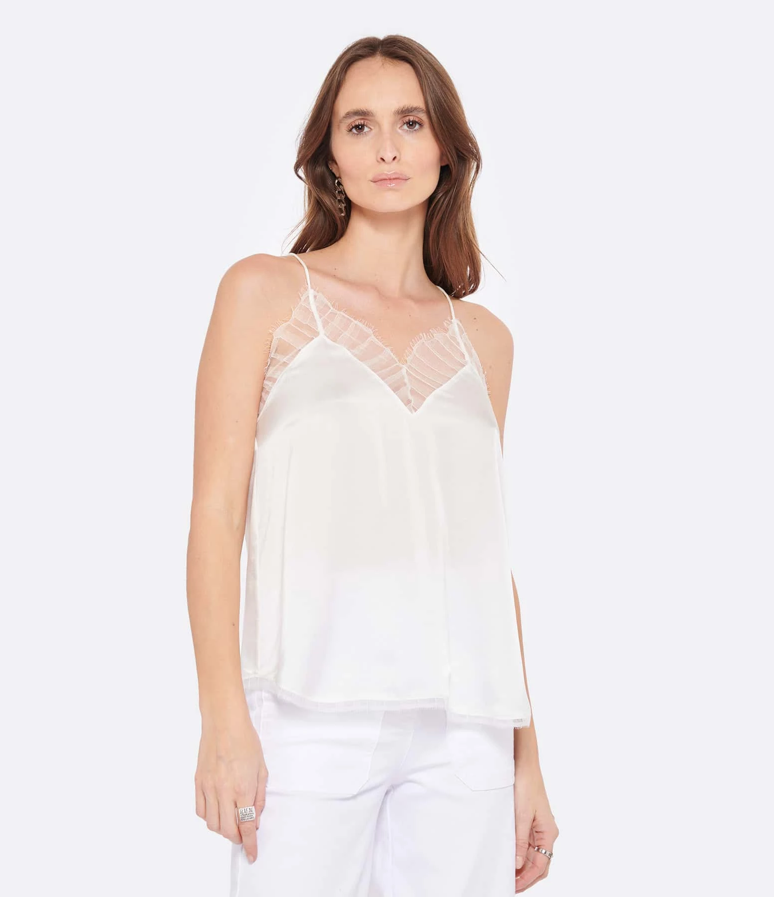 Top en soie et dentelle pour femme. Fines bretelles. Coupe fluide et légèrement évasée. Base droite. Non doublé.