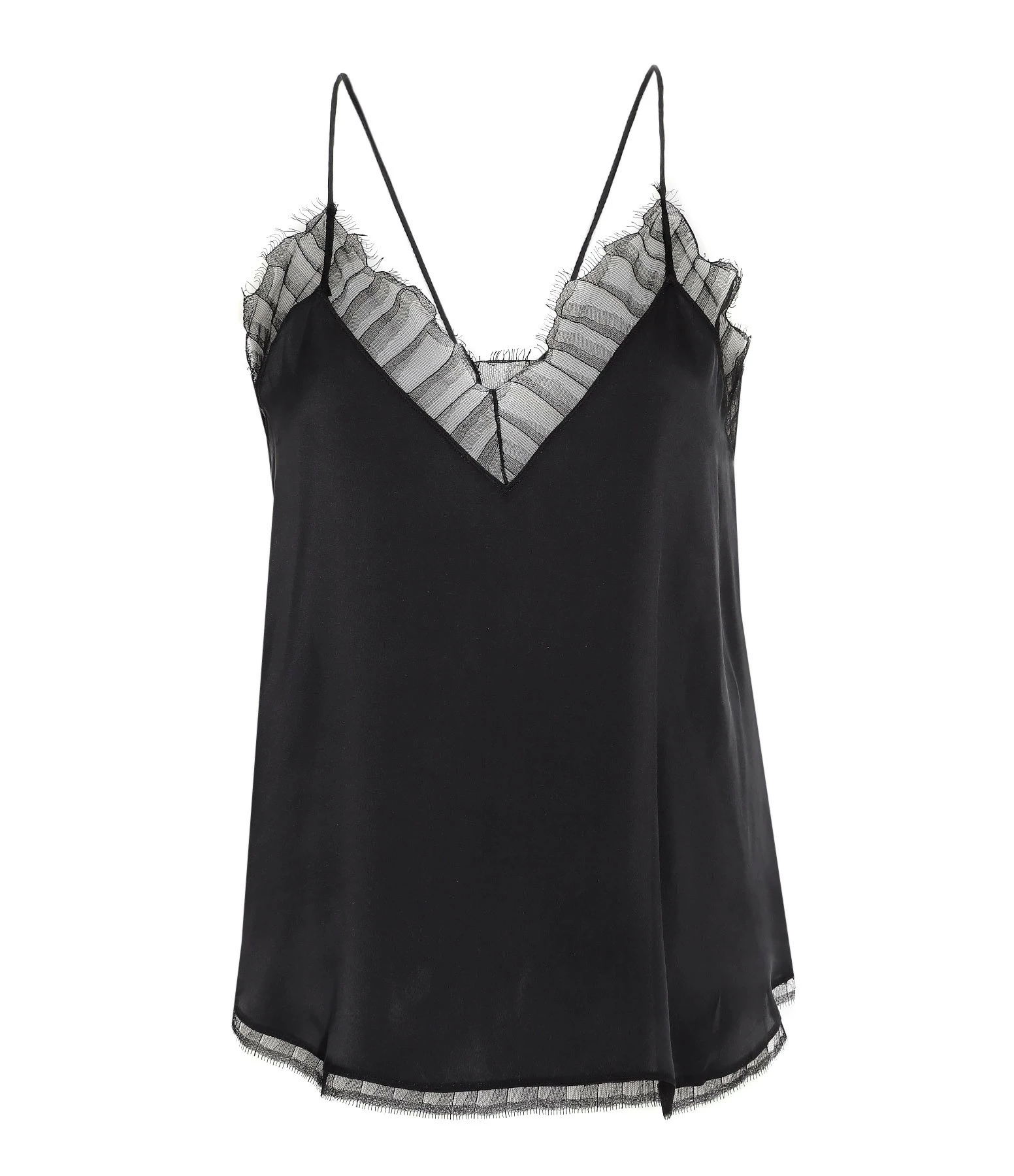 Top en soie et dentelle noir pour femme. Fines bretelles. Base droite. Coupe fluide et légèrement évasée. Non doublé.