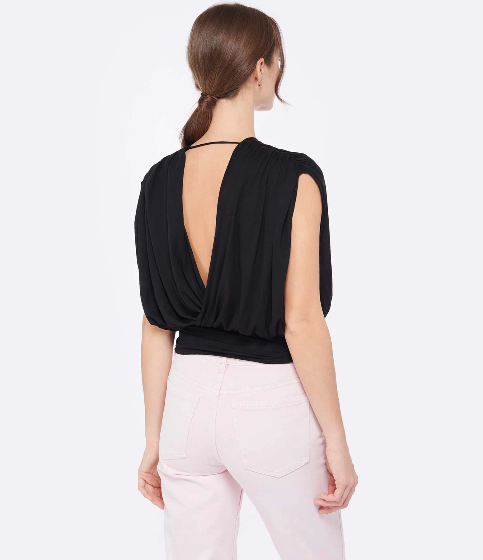 Top noir fluide décolleté à l’avant et à l’arrière. Col V échancré croisé sur tout le buste. Sans manches. Coupe ajustée et taille racourcie.