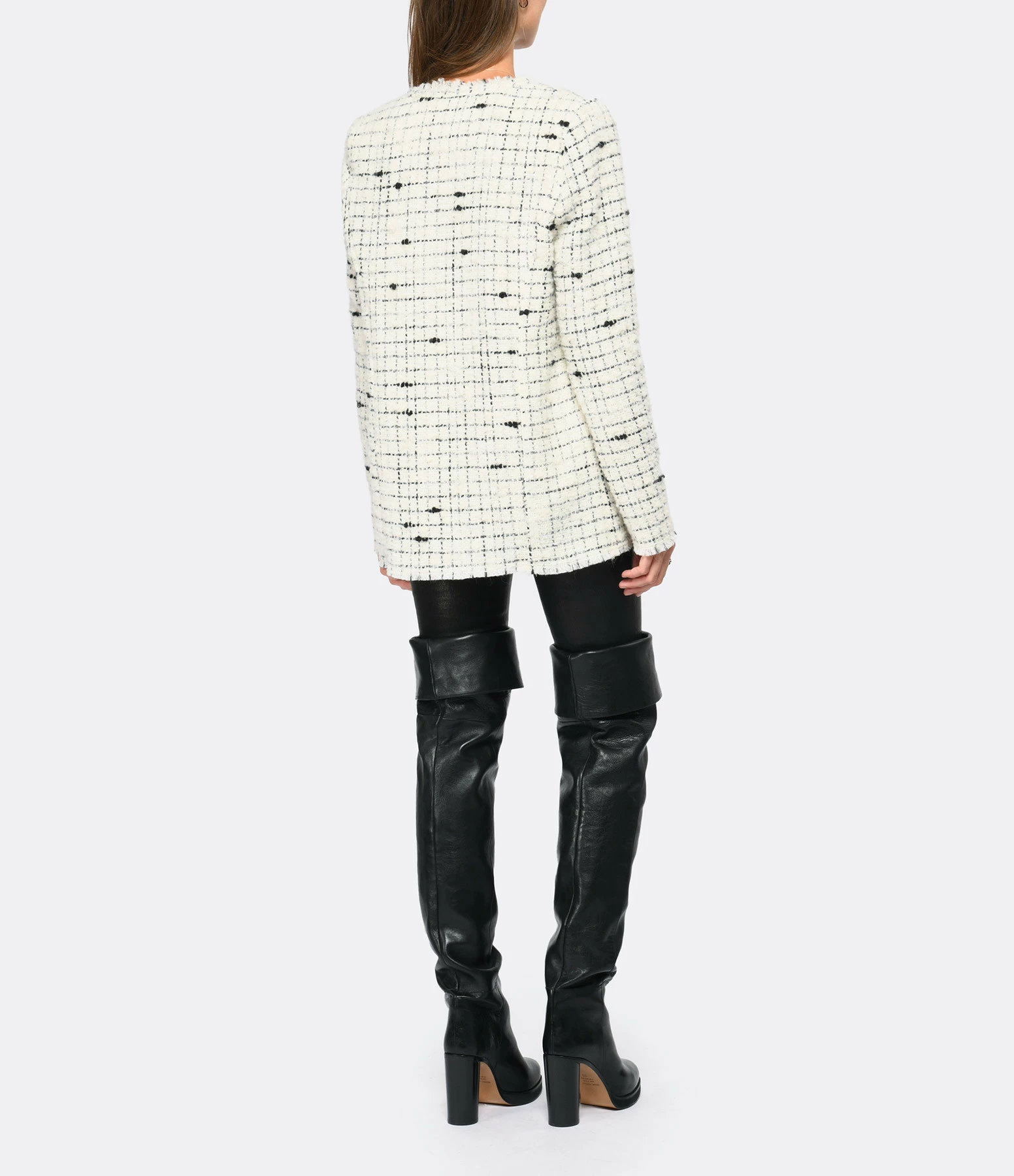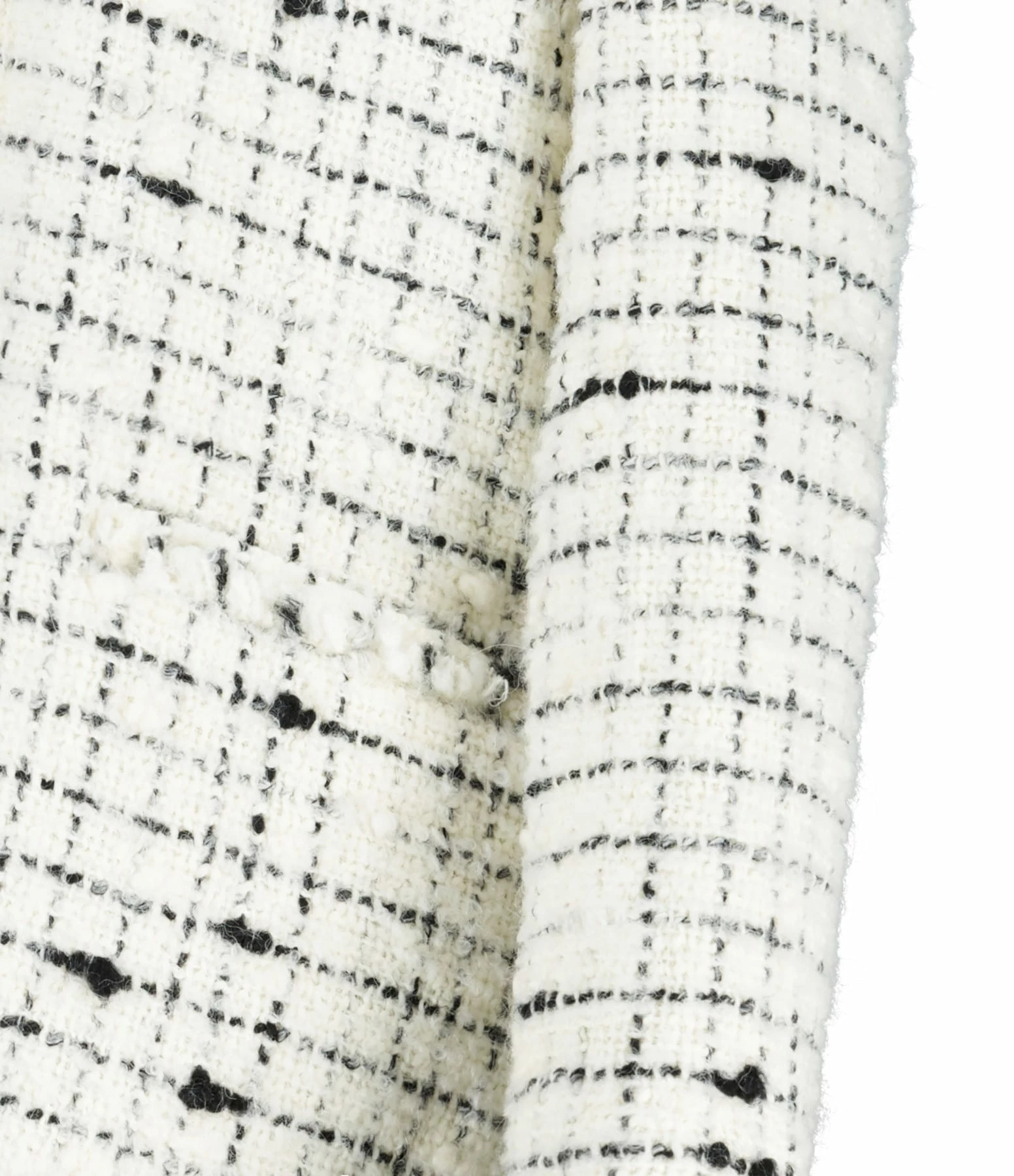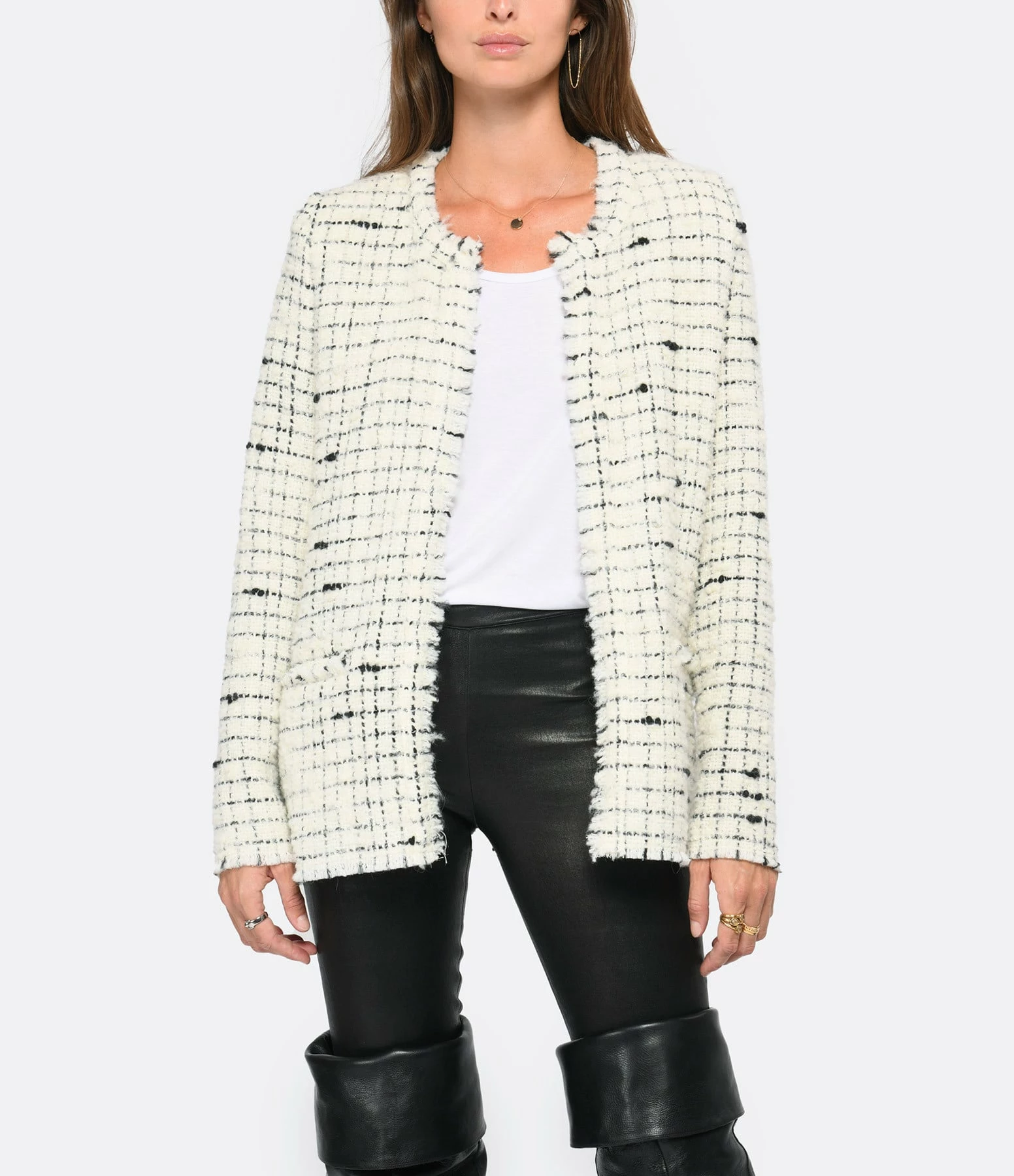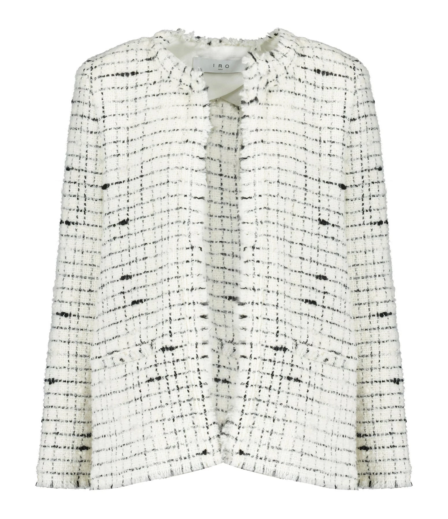 Veste courte en laine mélangée blanche et noire. Col arrondi. Manches longues avec bords frangés avec bords francs. Épaulettes. Deux poches passepoilées sur le devant. Coupe droite. Base droite avec bords francs.