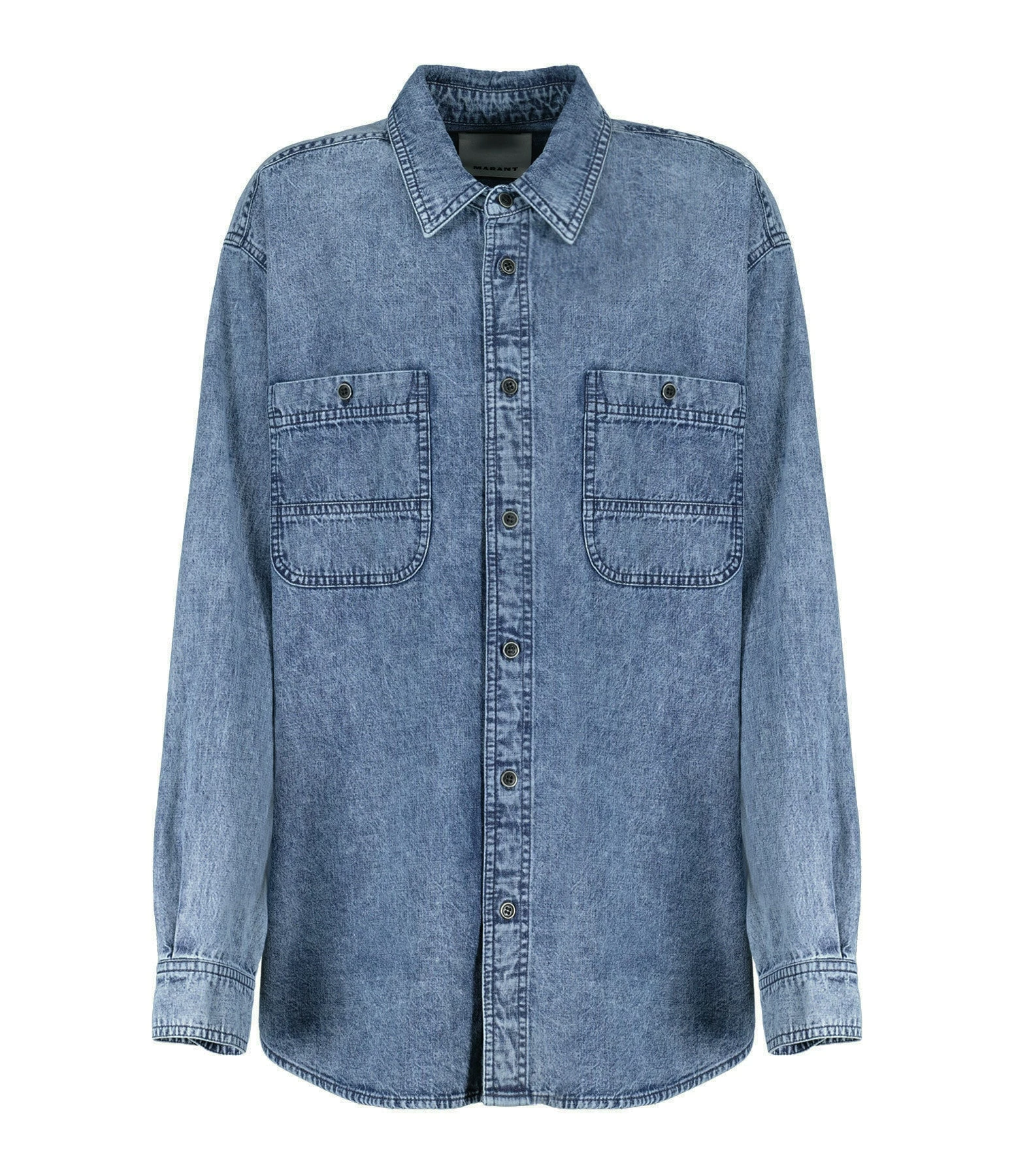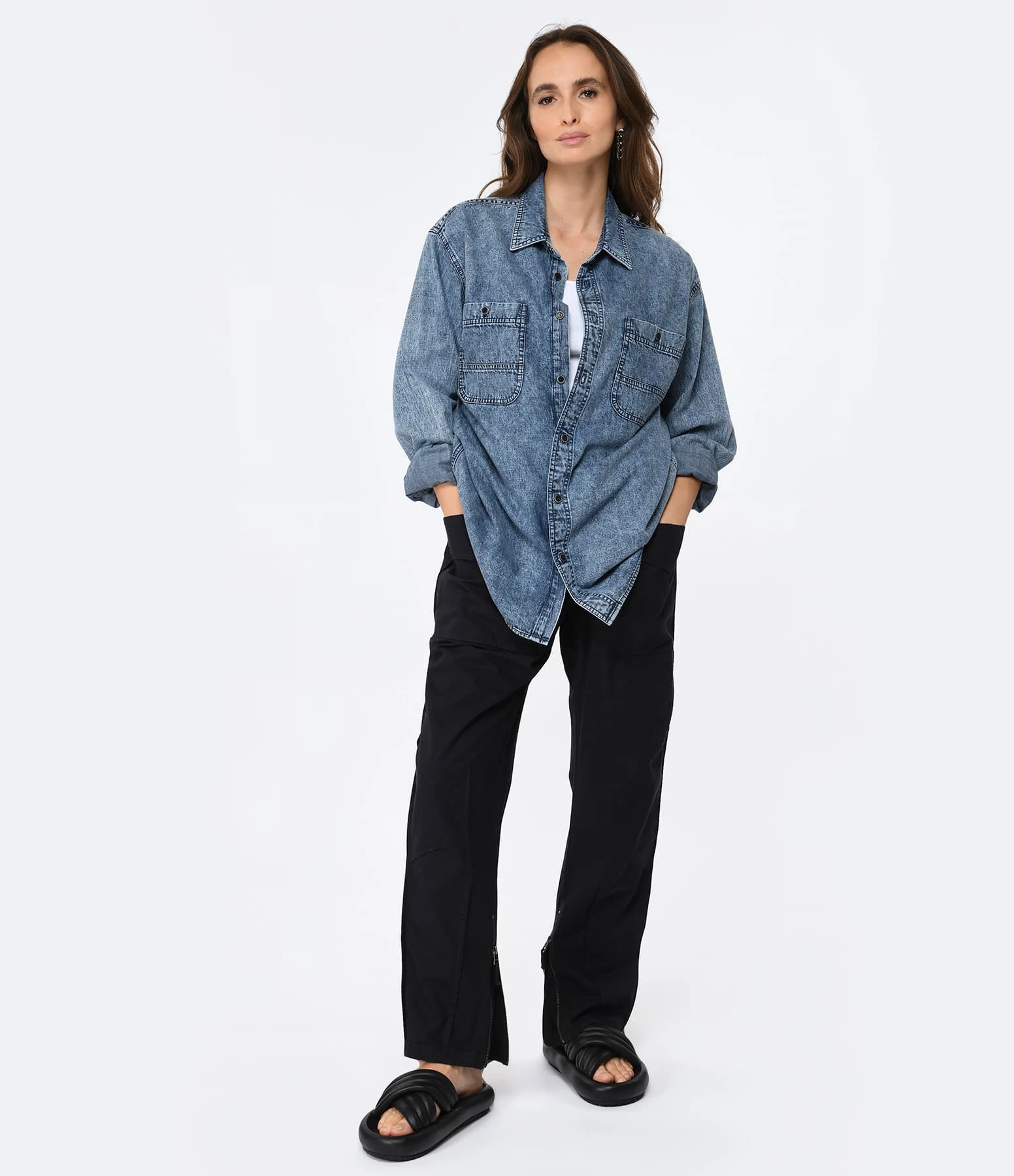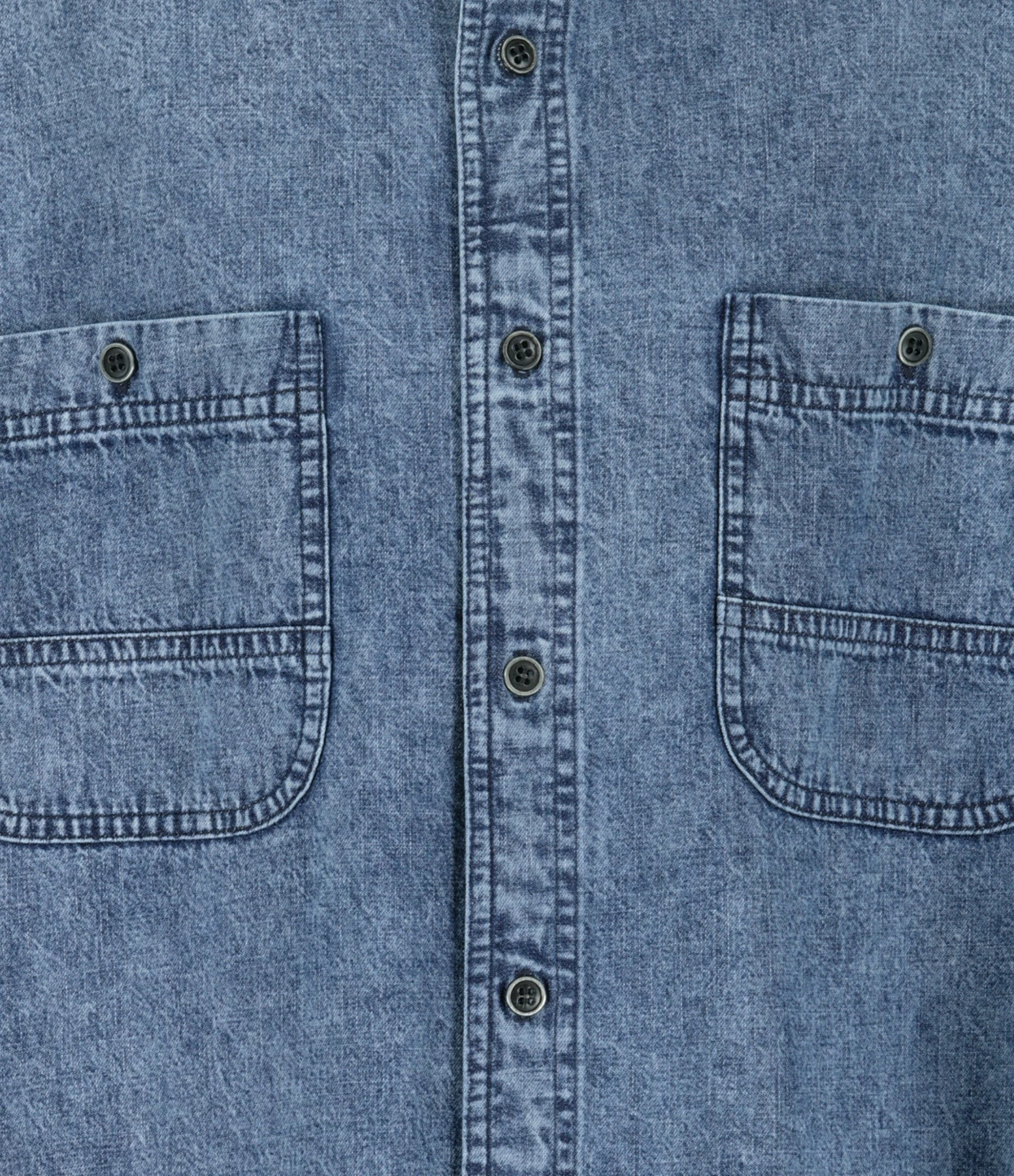 Chemise longue en denim de coton bleu délavé. Col chemisier. Manches longues avec fentes et boutons aux poignets. Fermeture à boutons sur le devant. Deux poches poitrine. Coupe droite. Base arrondie.