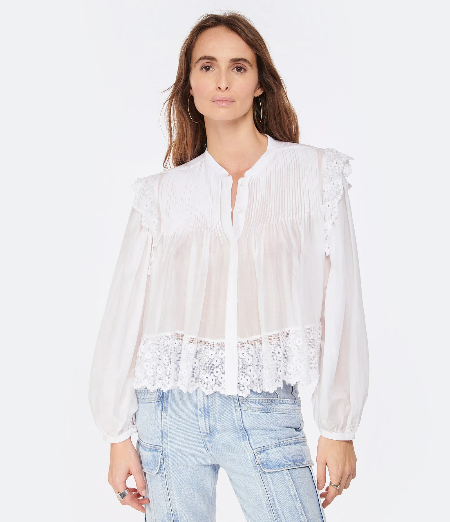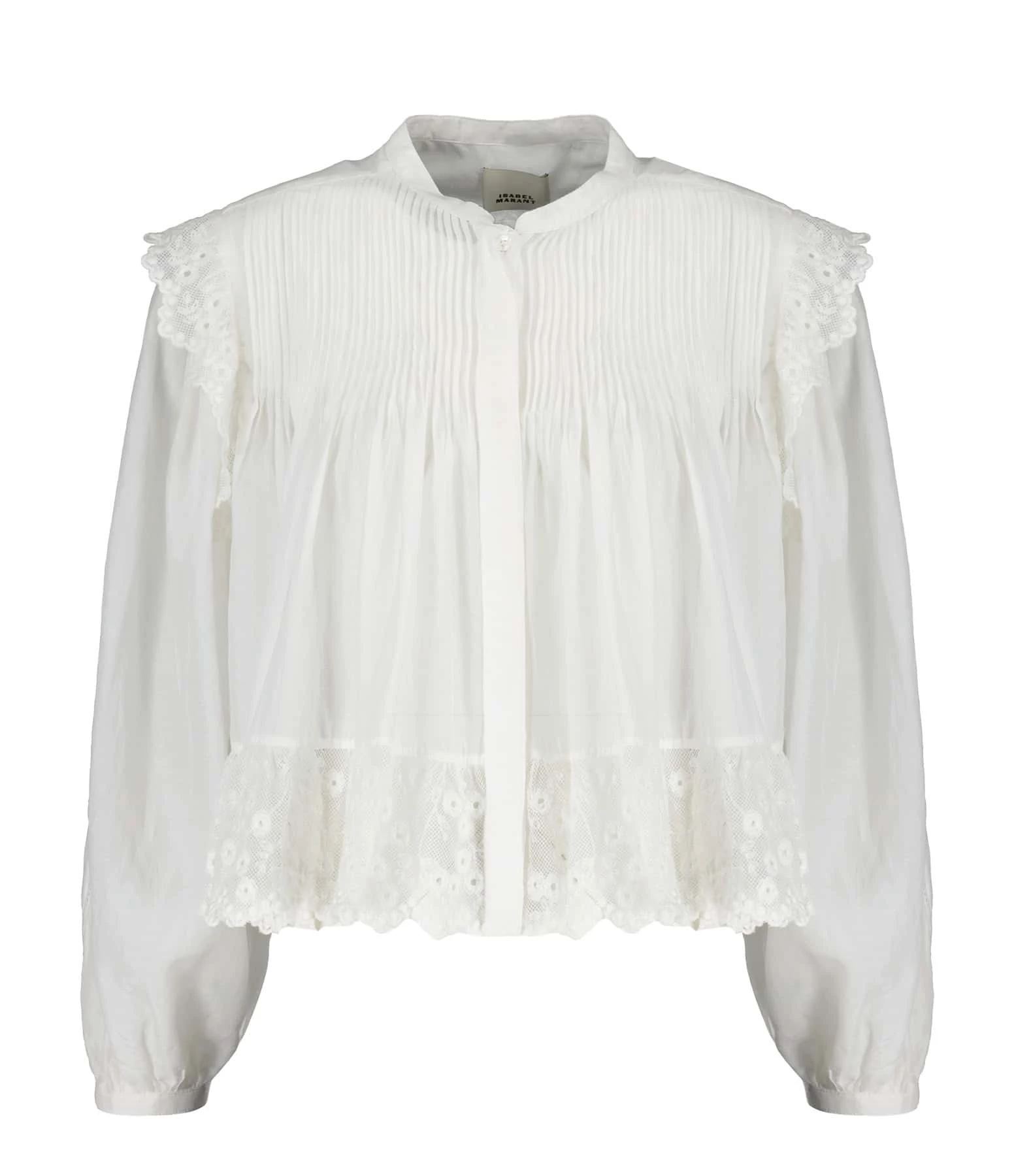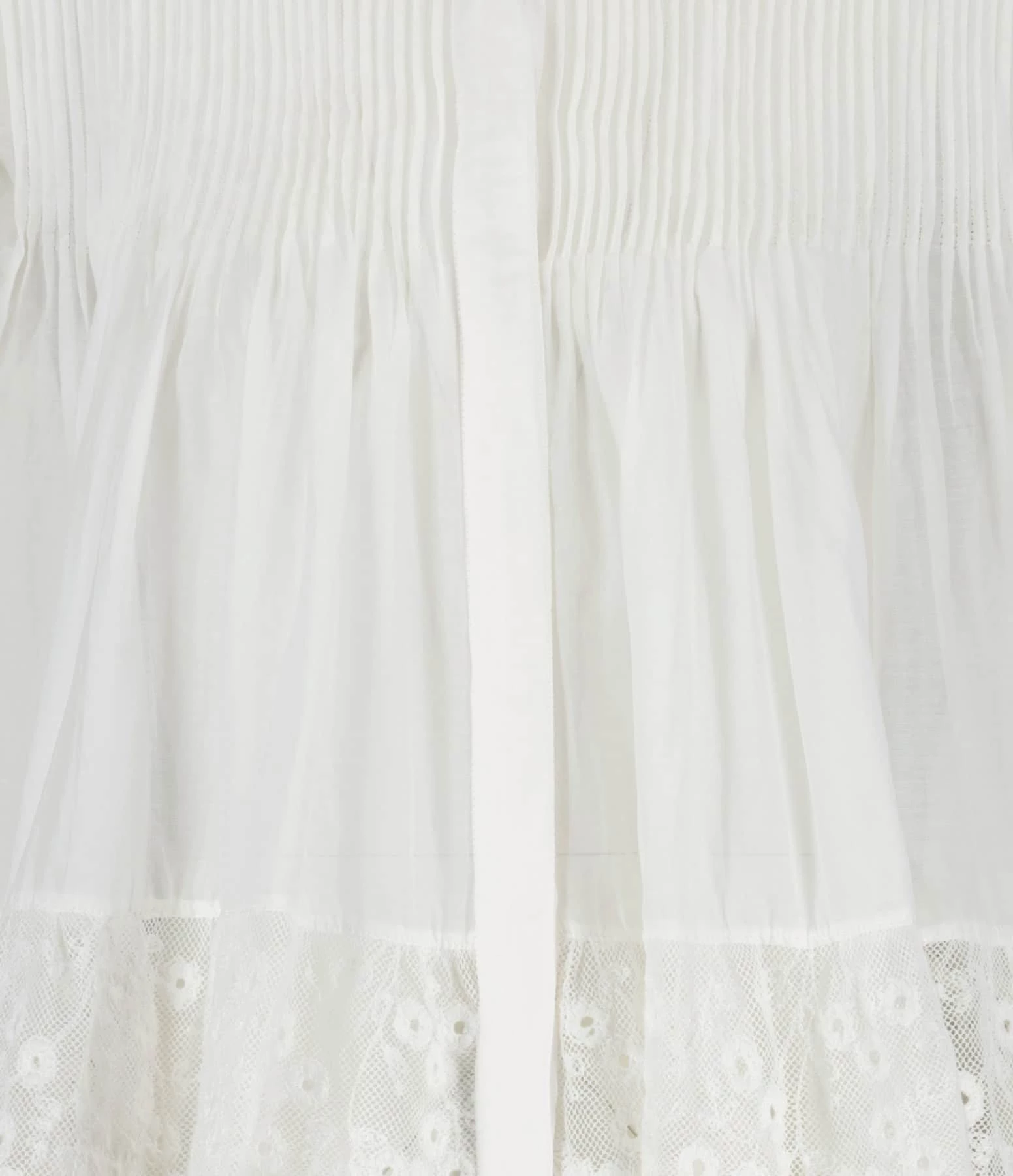 Chemise en coton et soie blanche plissée et ornée de dentelles florales. Col rond. Manches longues bouffantes avec fentes et poignets boutonnés. Fermeture boutonnée sur le devant à patte de boutonnage cachée. Dos froncé. Coupe ample. Base arrondie à dentelles.