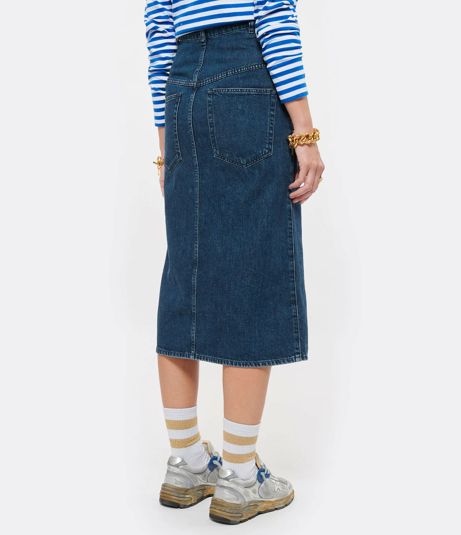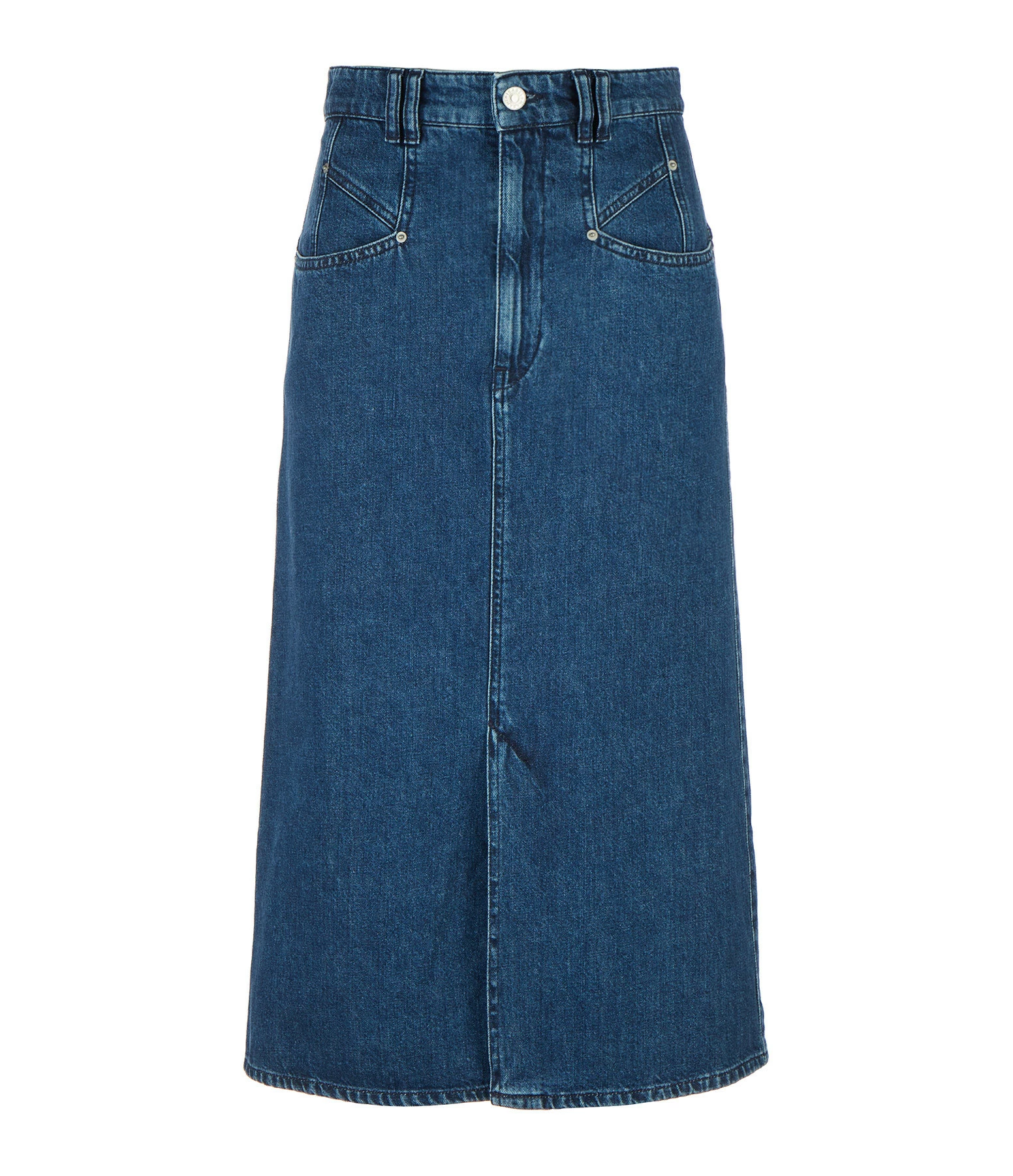 Jupe mi-longue en denim bleu. Quatre poches. Fermeture par zip et bouton. Fentes de 27 cm à l’avant. Coupe droite. Base droite.
