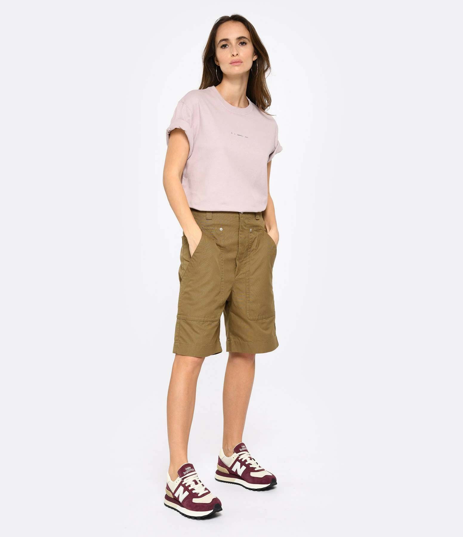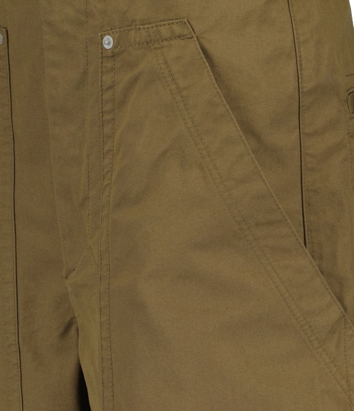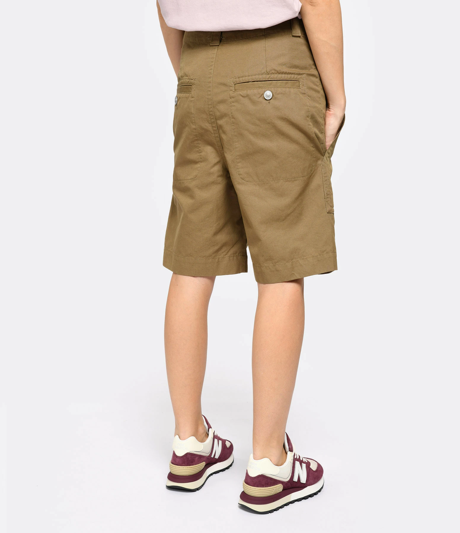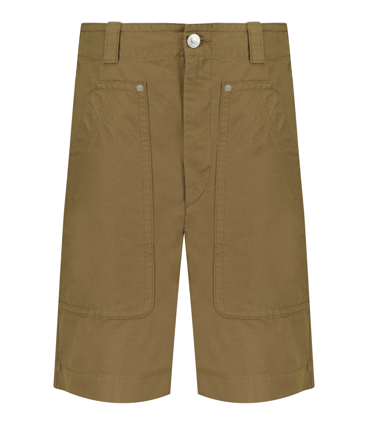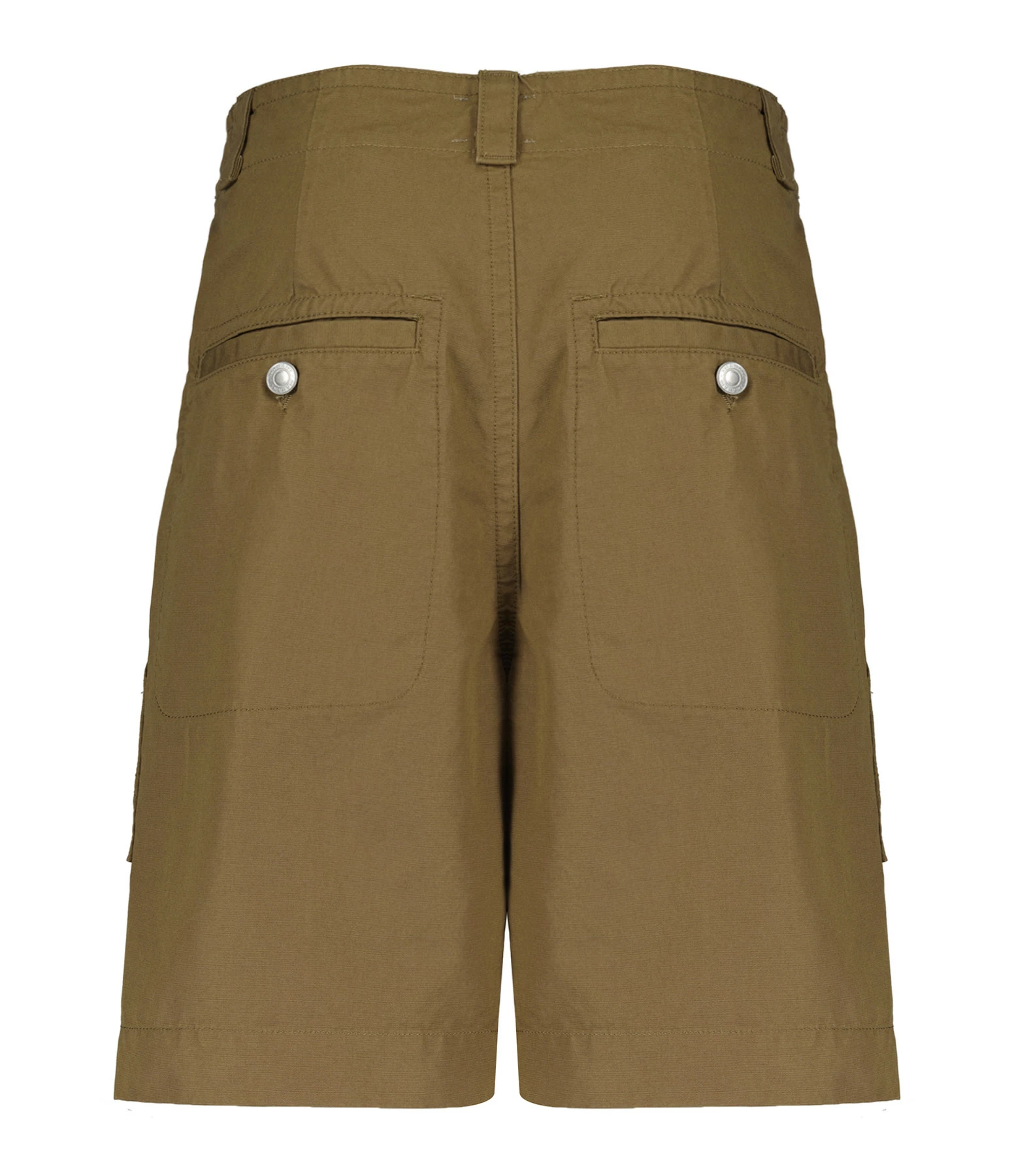 Short en coton kaki. Larges passants pour ceinture. Braguette zippée et bouton métallique argenté. Deux plaquées sur le devant. Deux poches passepoilées boutonnées dans le dos. Coupe large. Base droite.