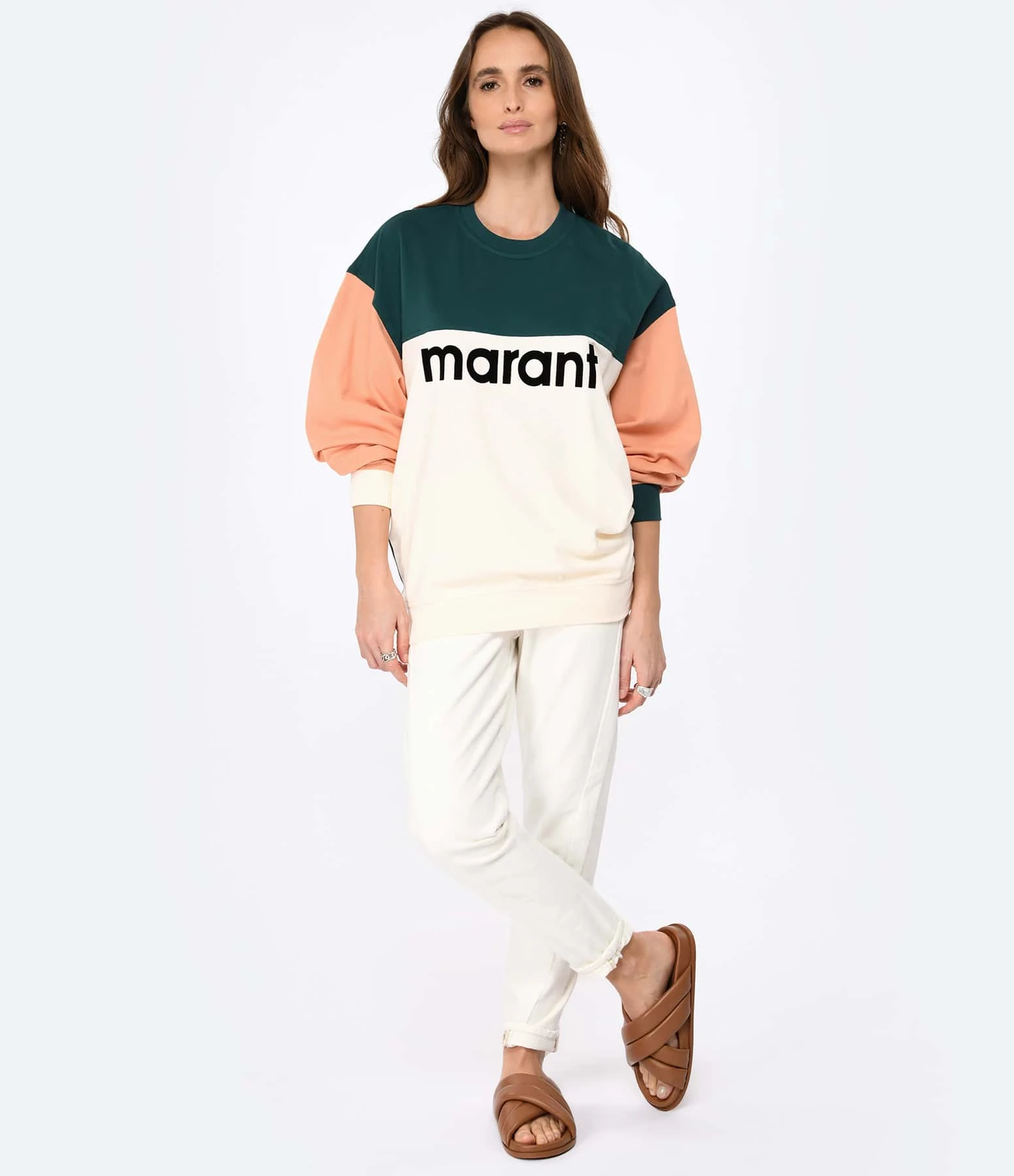 Sweatshirt en coton beige, vert et saumon. Inscription “MARANT” noire flockée sur le devant. Col rond. Manches longues. Coupe droite. Base droite.