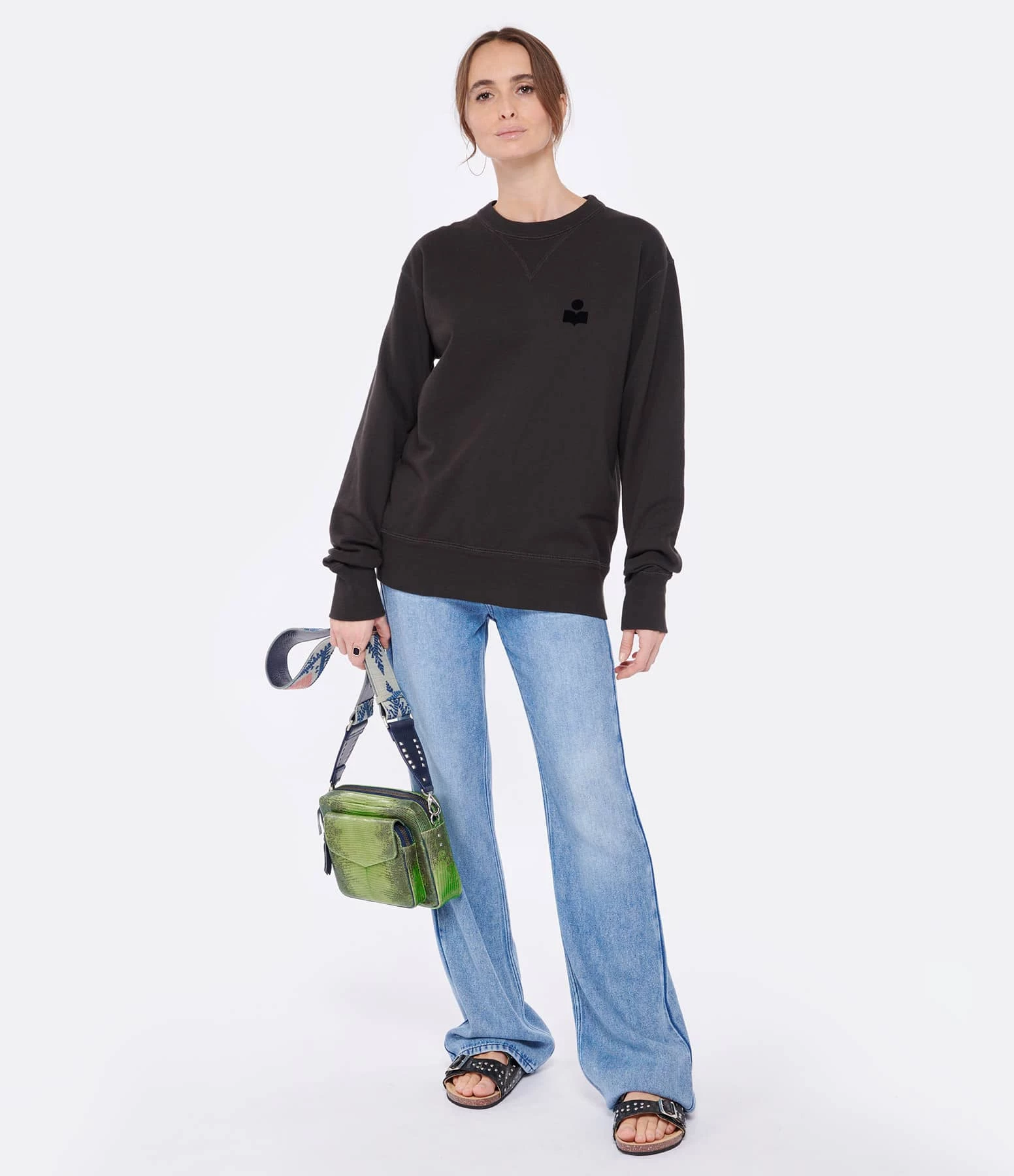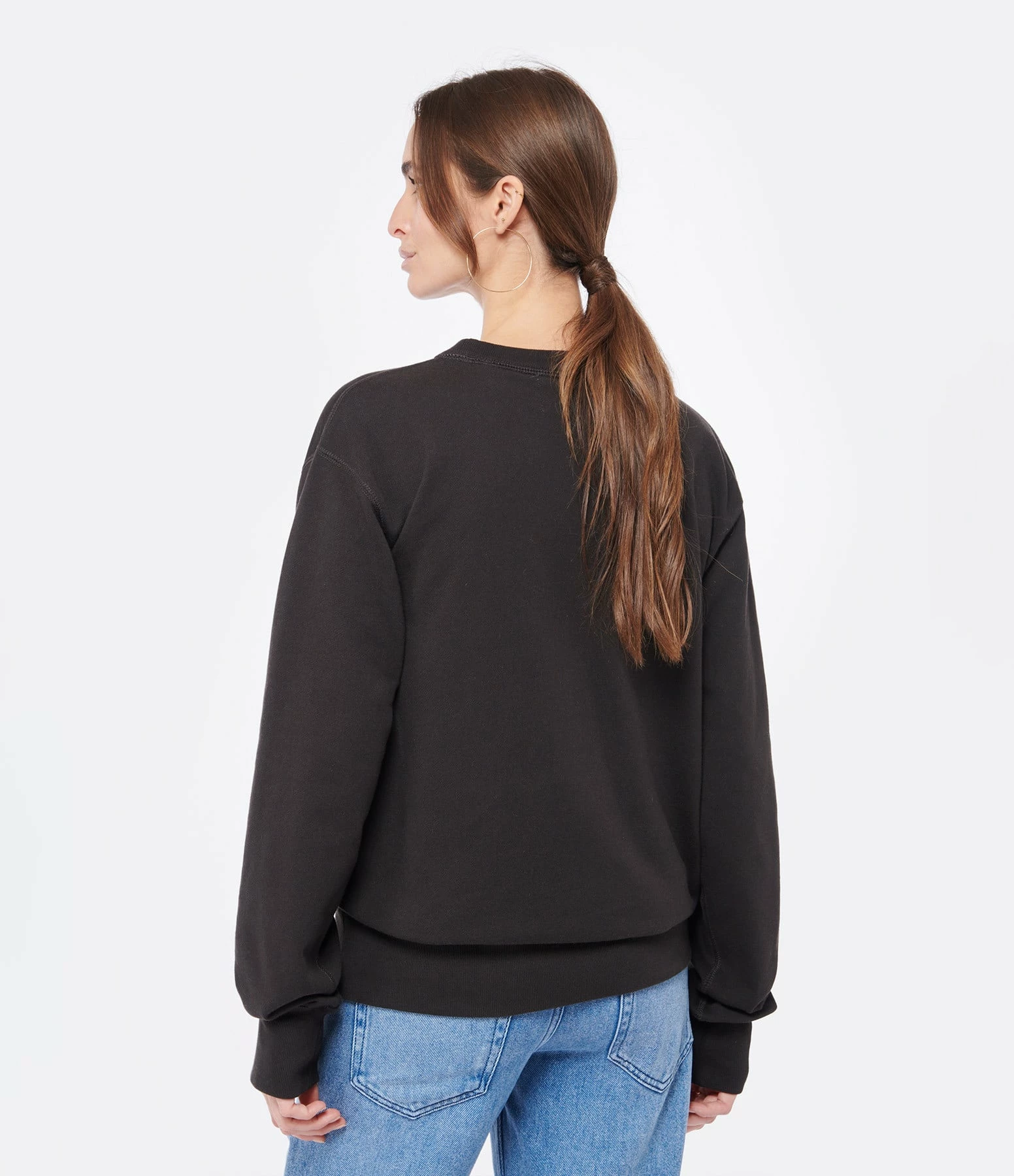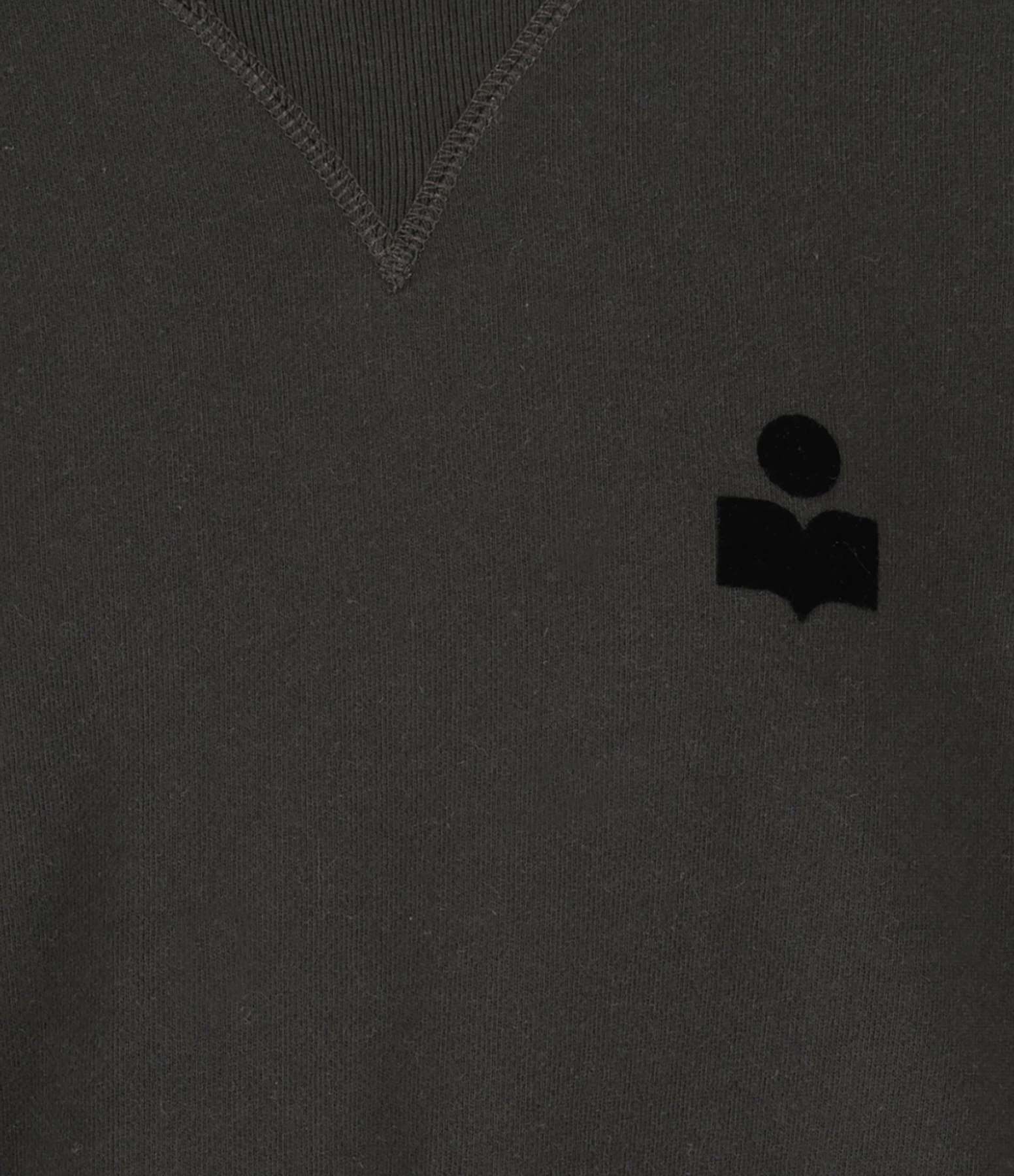 Sweatshirt en coton noir délavé. Logo flocké velours noir sur la poitrine. Col rond côtelé. Manches longues avec poignets côtelés. Coupe droite. Base droite.