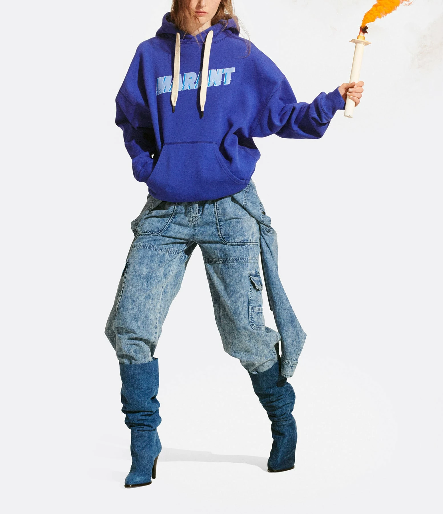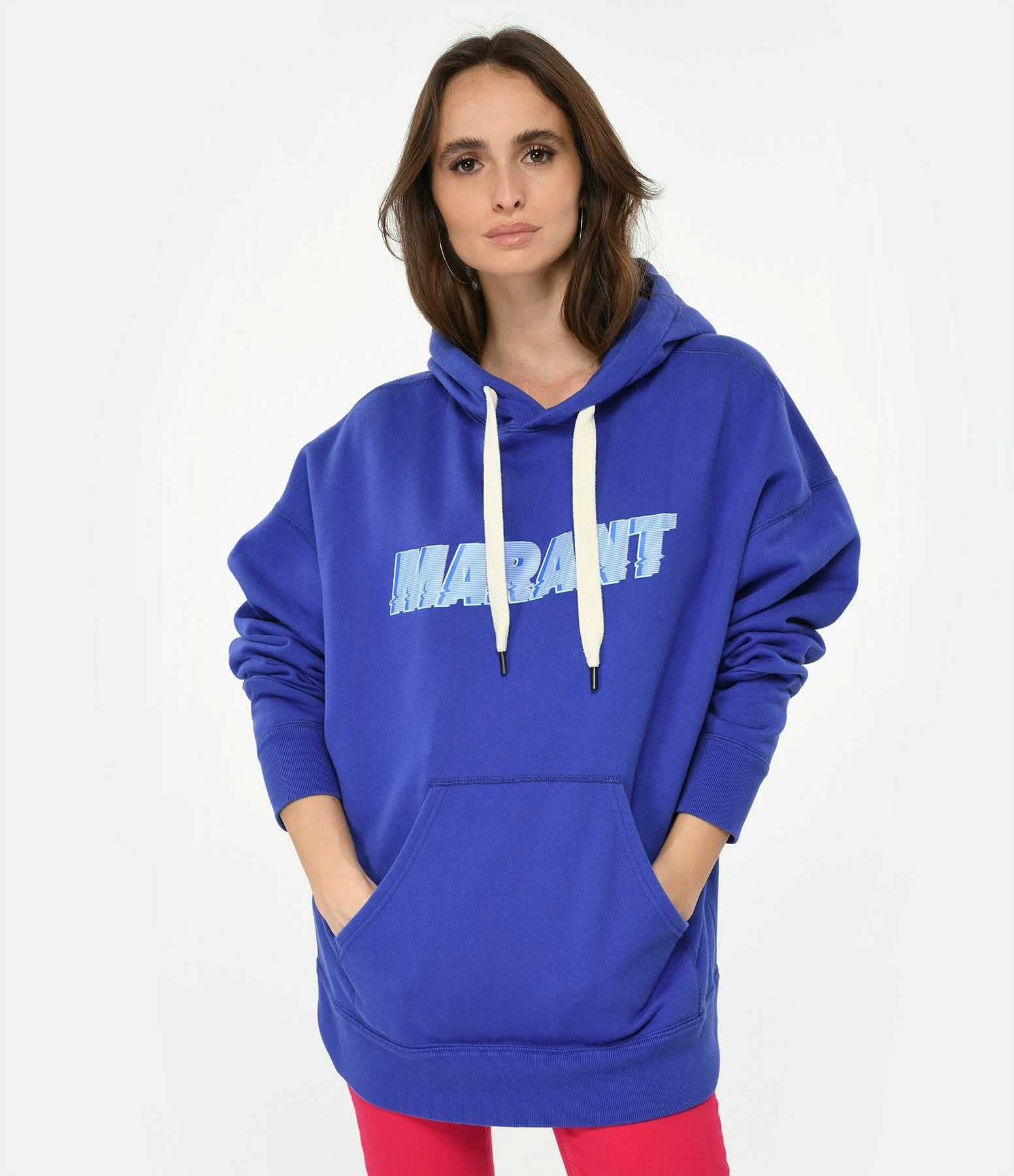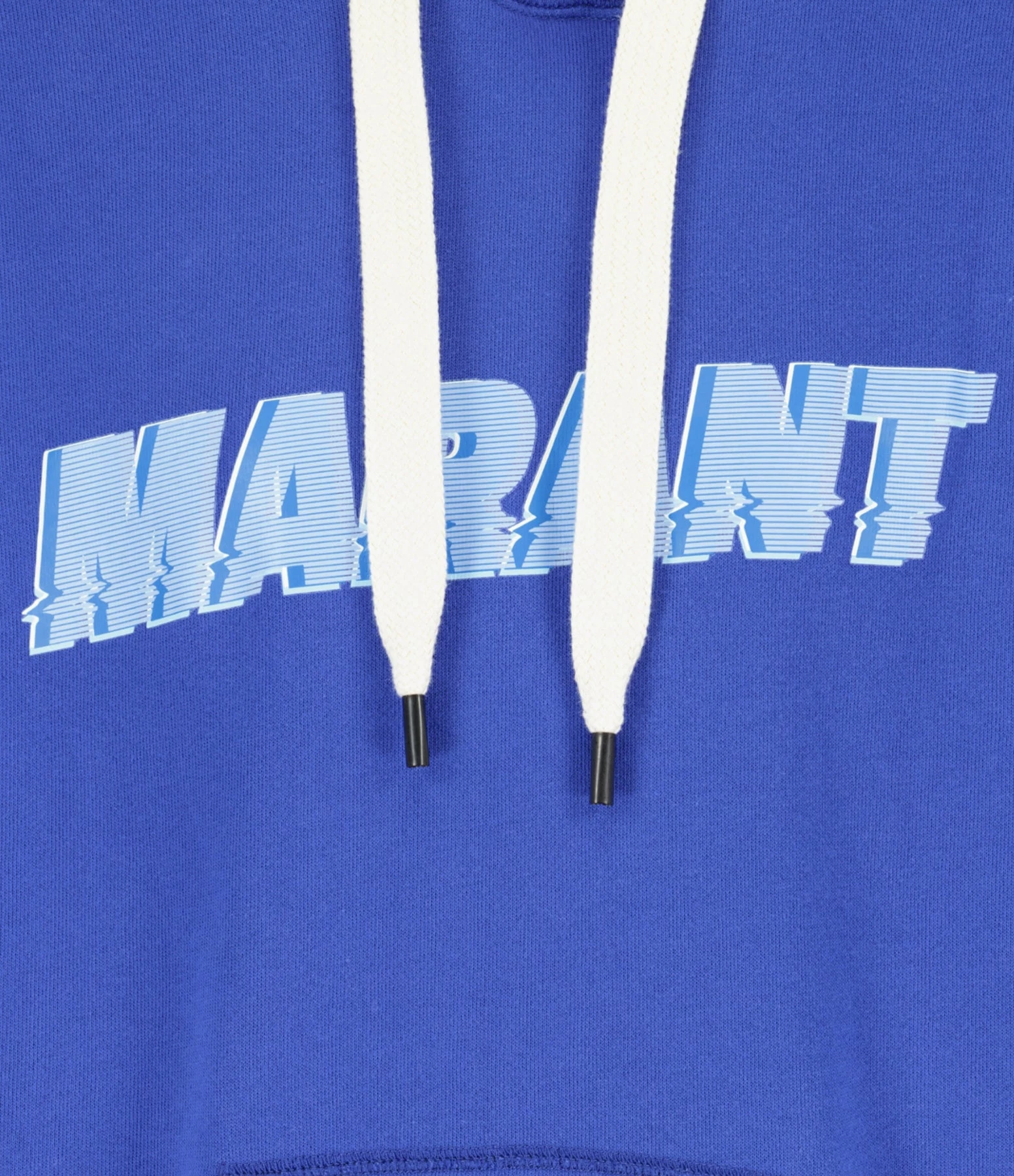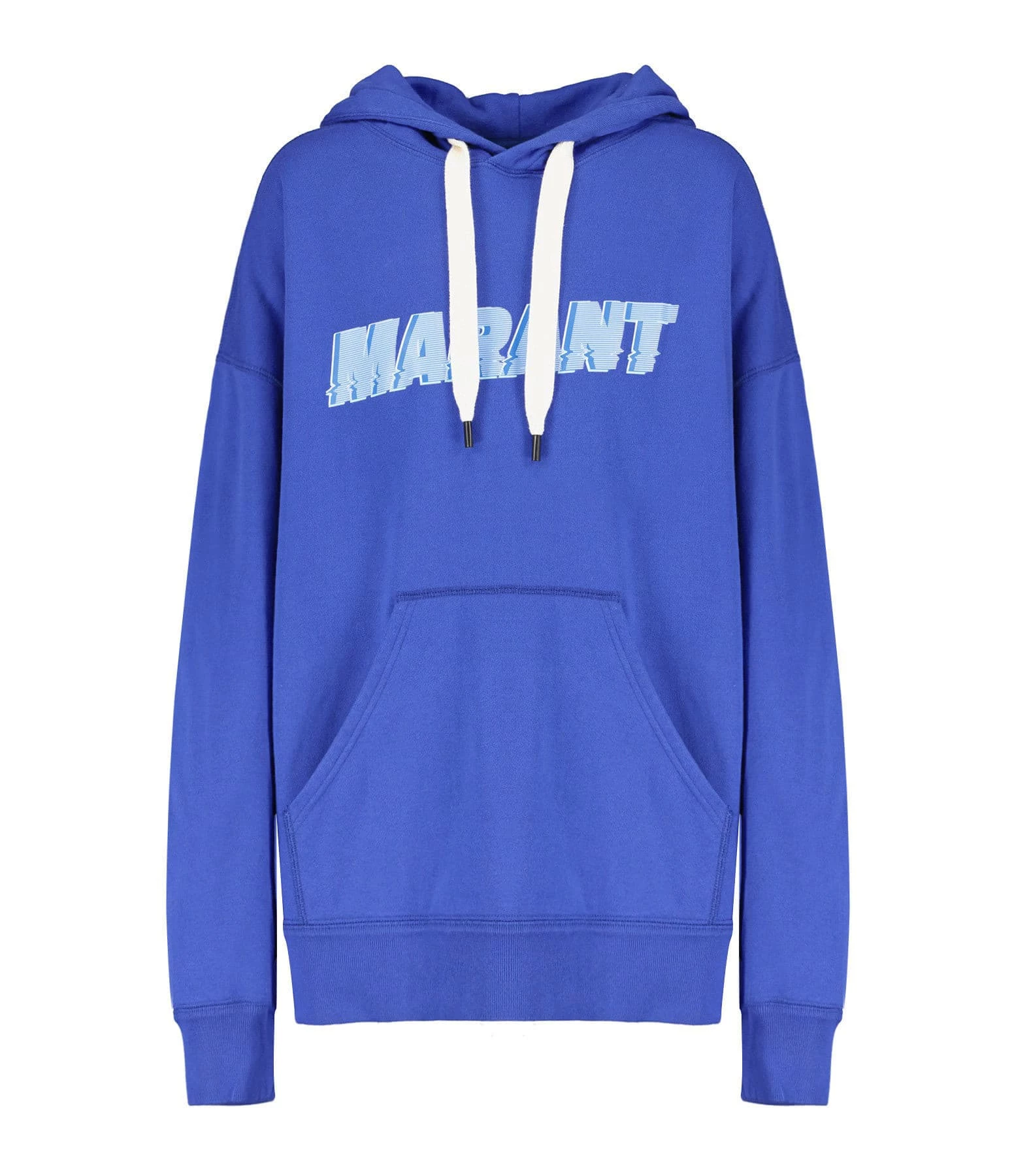 Sweatshirt en coton bleu électrique. Inscription “MARANT” bleue flockée sur le devant. Col à capuche. Poche kangourou. Manches longues. Coupe droite. Base droite.