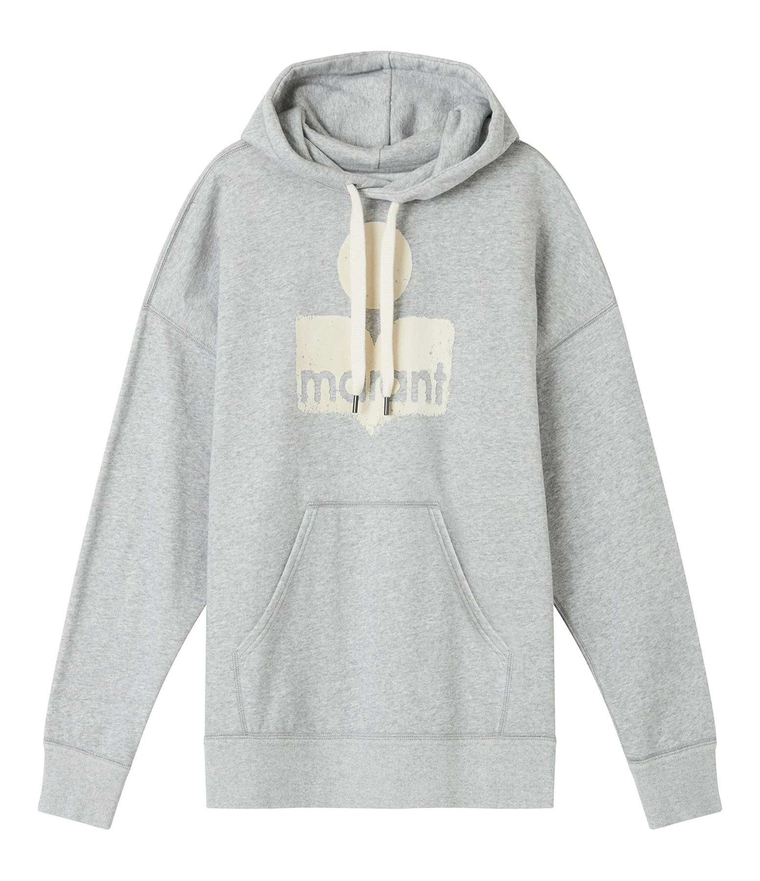 Sweatshirt en coton molletonné mélangé gris chiné avec le logo Marant flocké en velours blanc sur le devant. Col rond à capuche avec liens de serrage beiges. Manches longues avec poignets côtelés. Poche kangourou sur le devant. Coupe ample. Base droite côtelée.