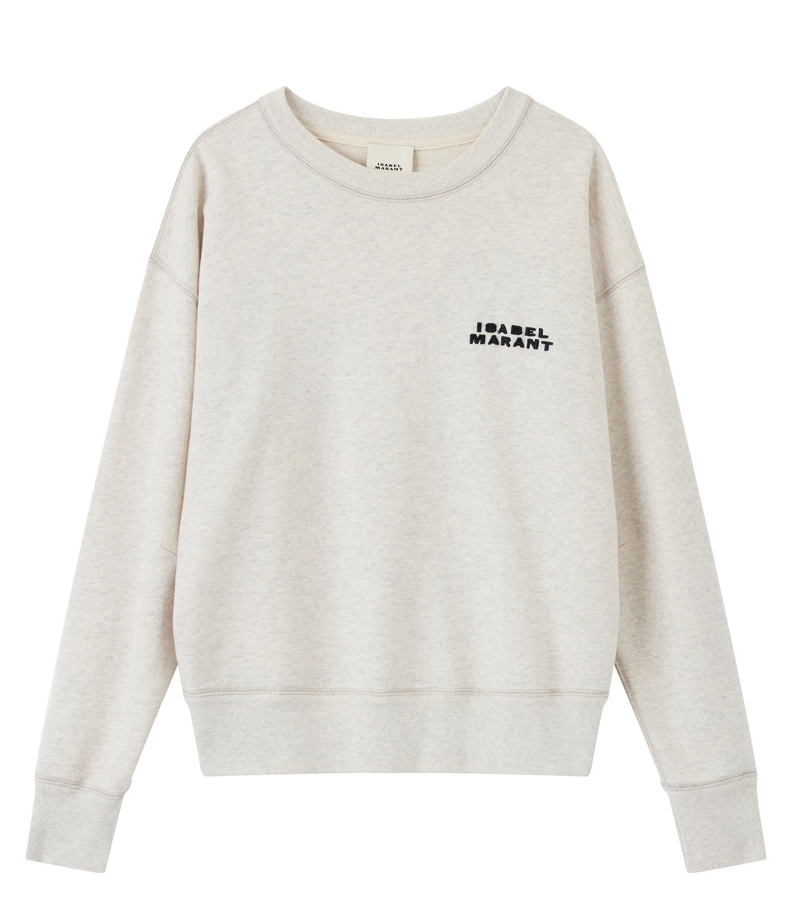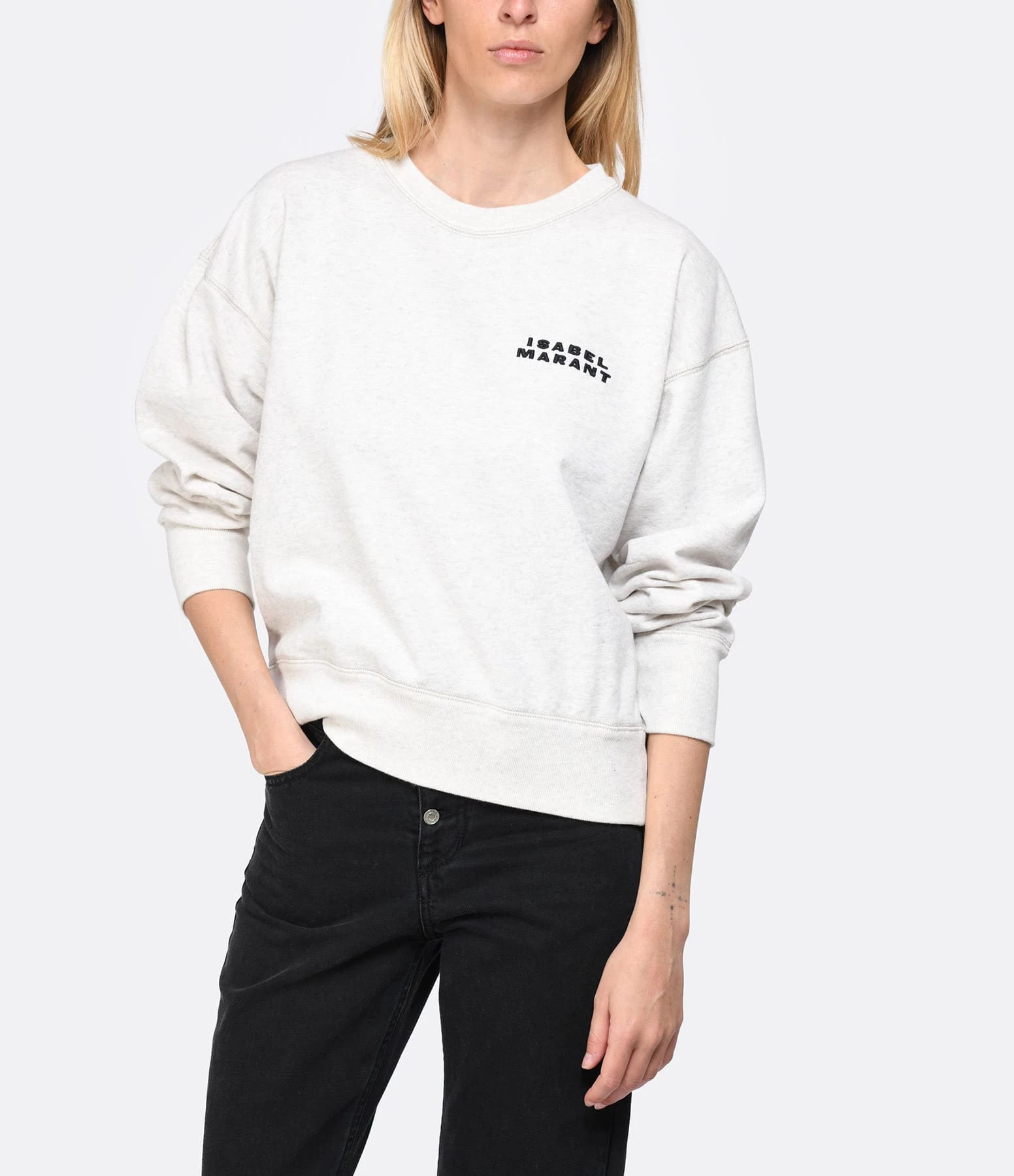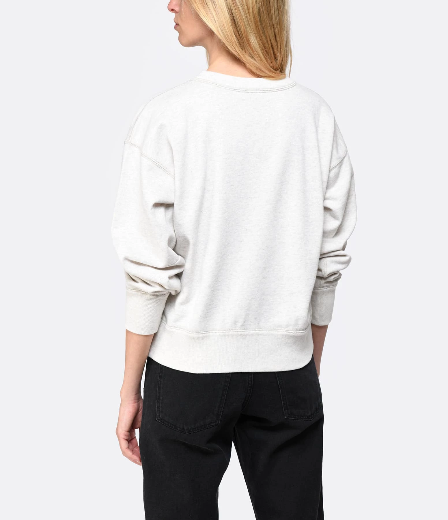 Sweatshirt en coton écru chiné à manches longues. Inscription “ISABEL MARANT” brodée en noir côté cœur. Col rond côtelé. Coupe droite. Base droite.