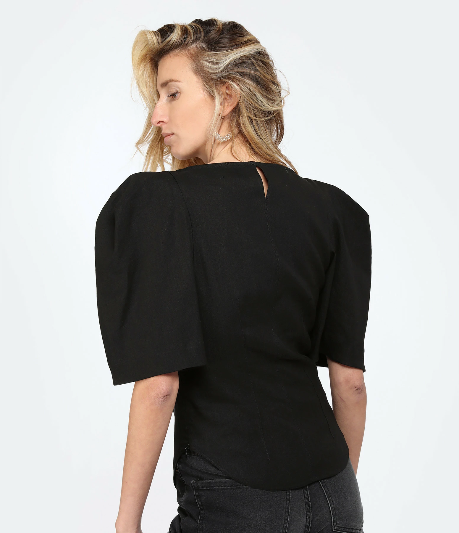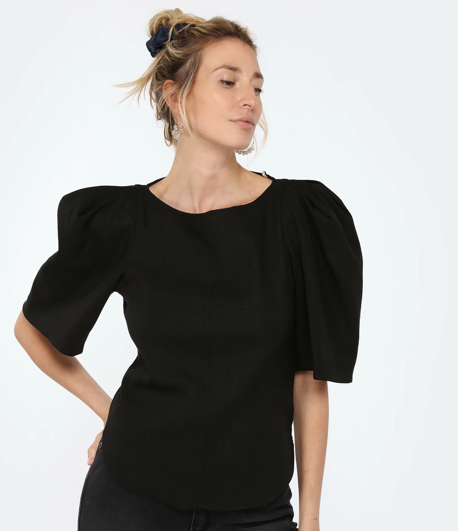 Top en chanvre noir à manches courtes. Col rond. Volume au niveau des épaules. Fermeture invisible latérale. Coupe ajustée. Base arrondie.