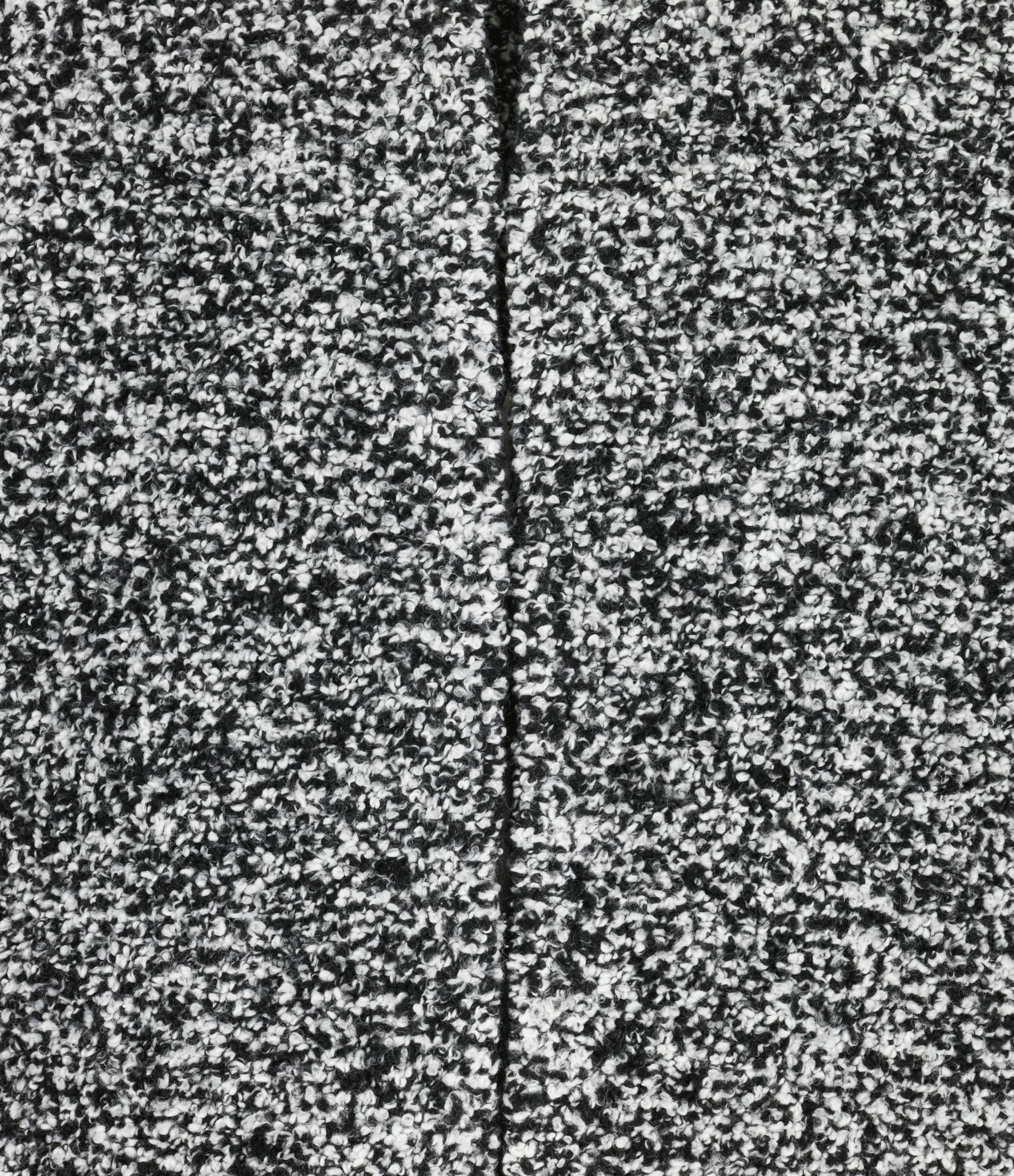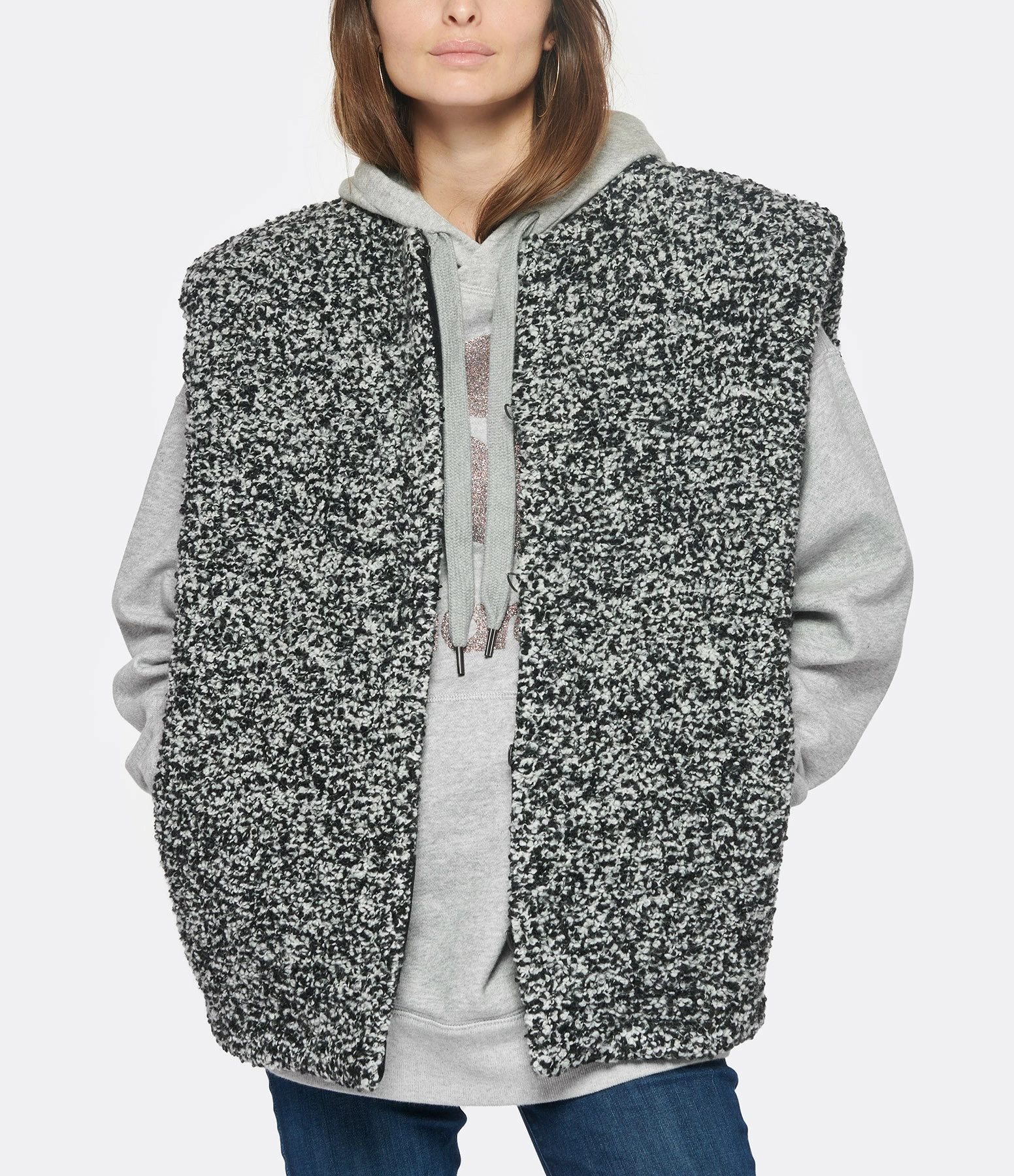 Veste en laine mélangée noir et écru. Col rond. Sans manches. Fermeture à crochet sur le devant. Deux poches latérales sur le devant. Coupe droite ample. Base droite.