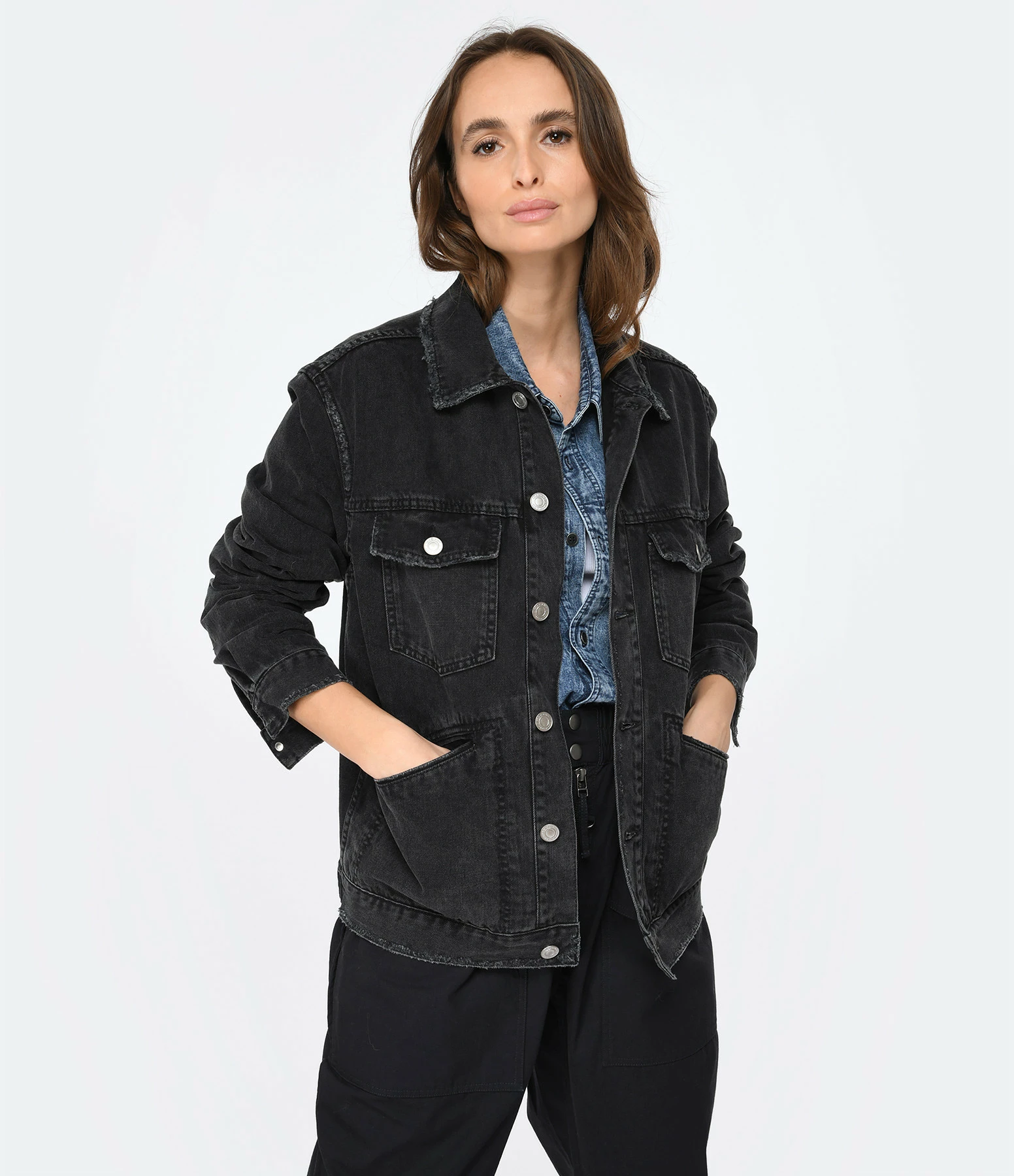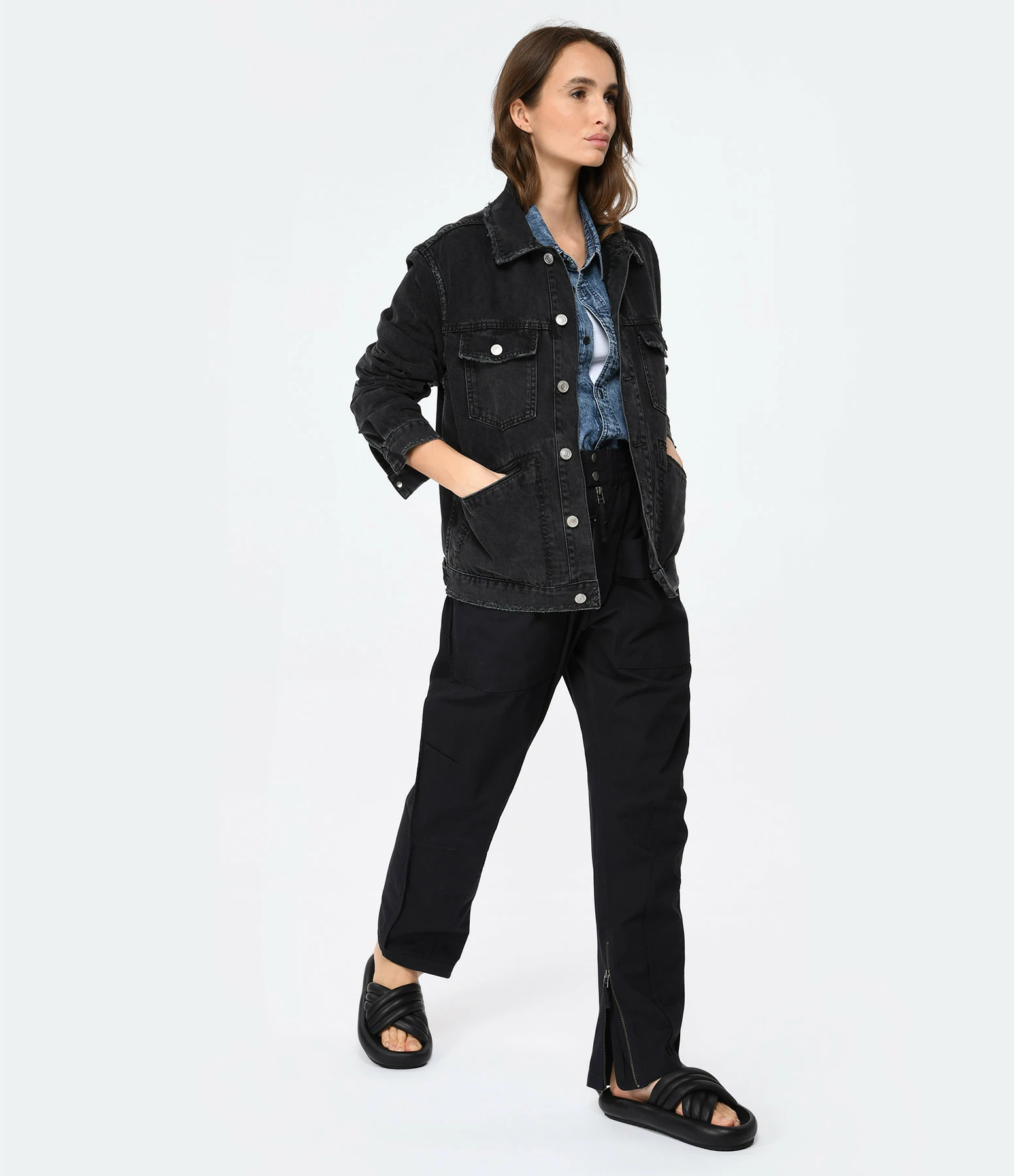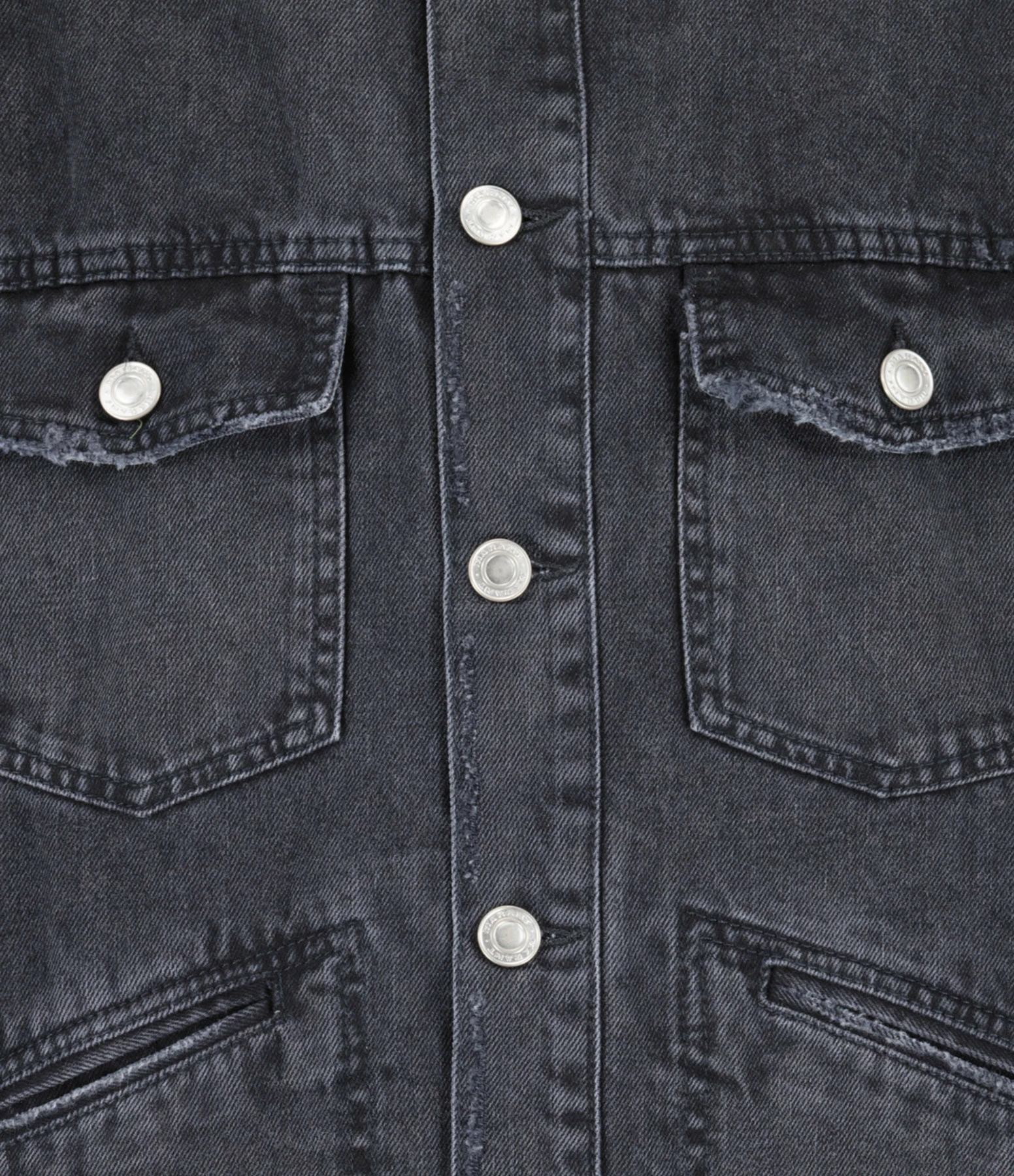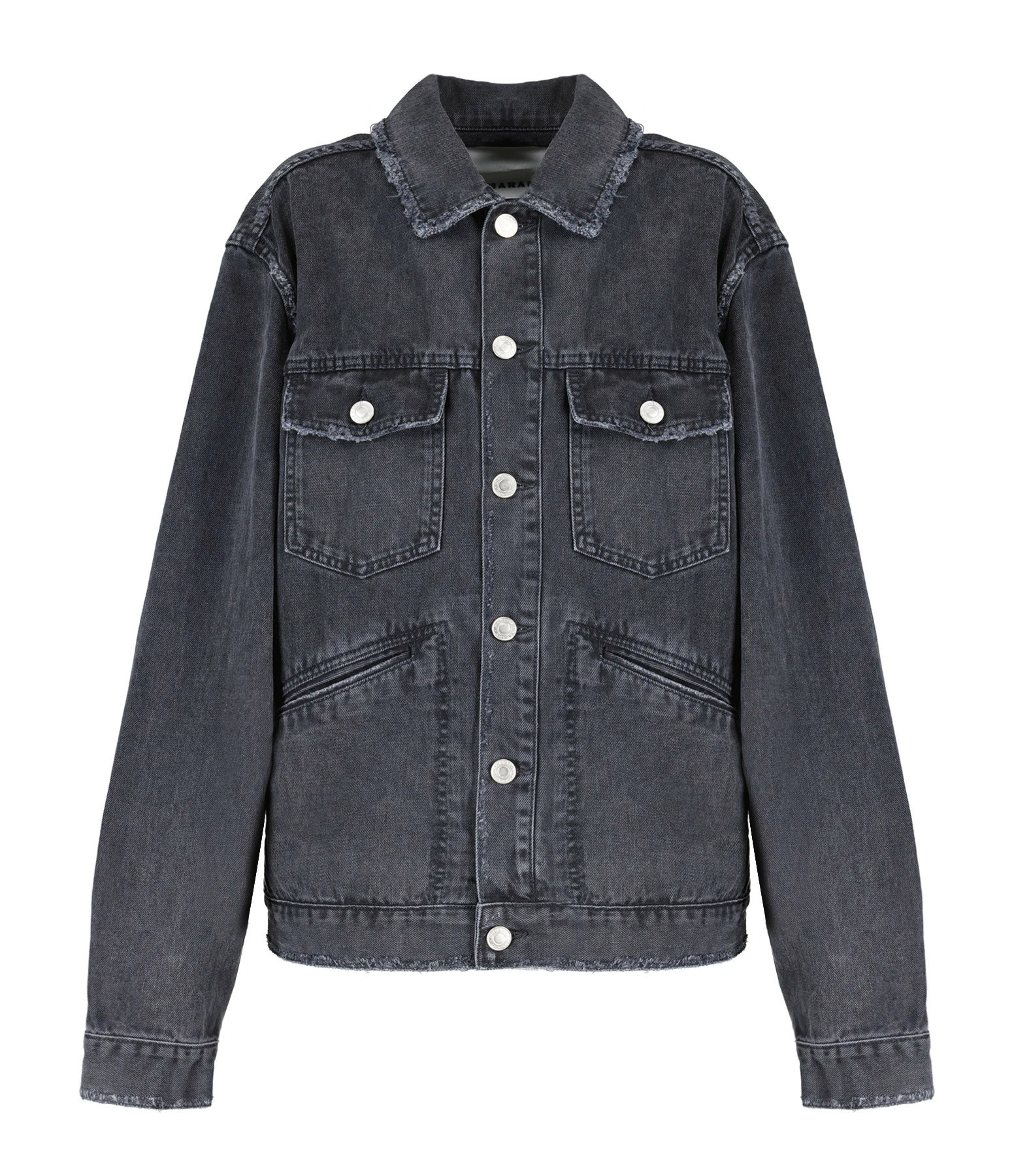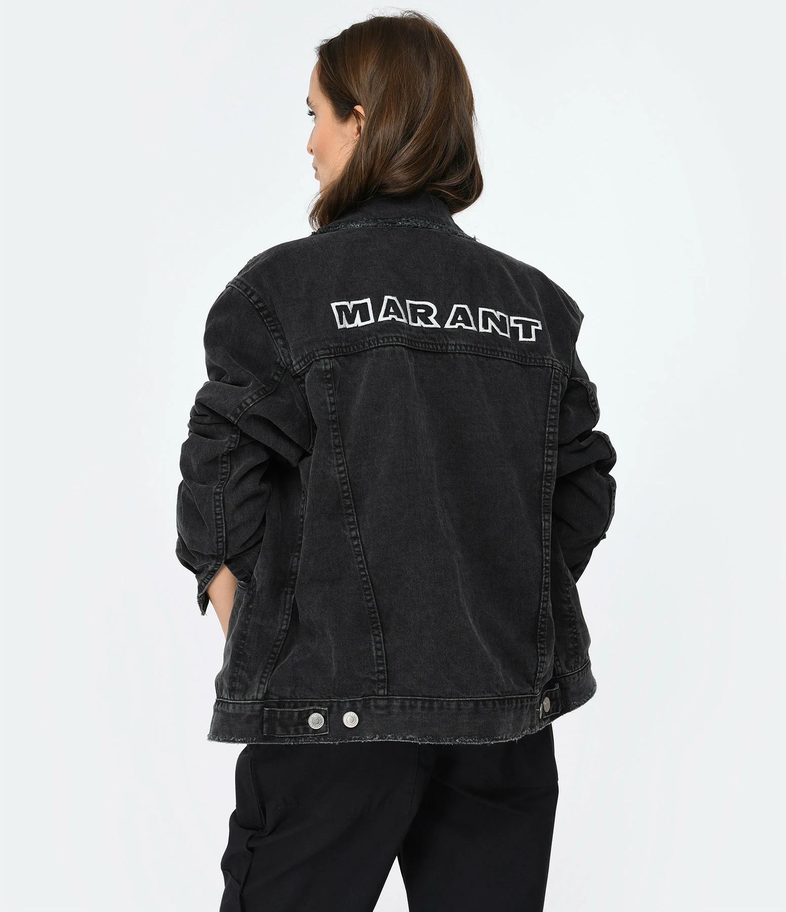 Veste en denim de coton noir délavé. Inscription “MARANT” brodé à l’arrière en blanc. Col chemisier à bords francs. Manches longues avec fentes et poignets boutonnés. Fermeture boutonnée sur le devant. Boutons métalliques avec logo. Deux poches à rabat boutonné et deux poches passepoilées sur le devant. Coupe droite. Base droite.