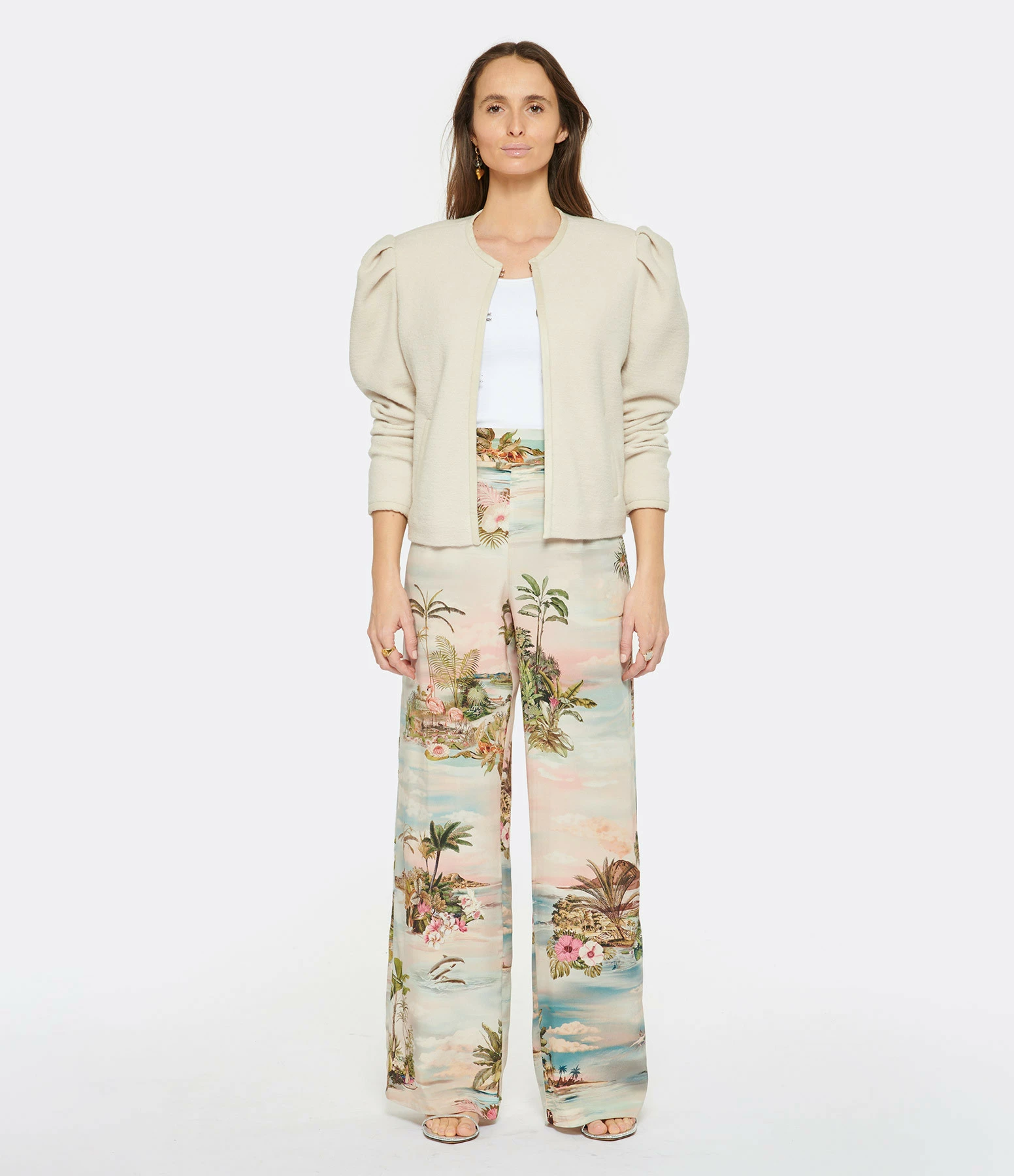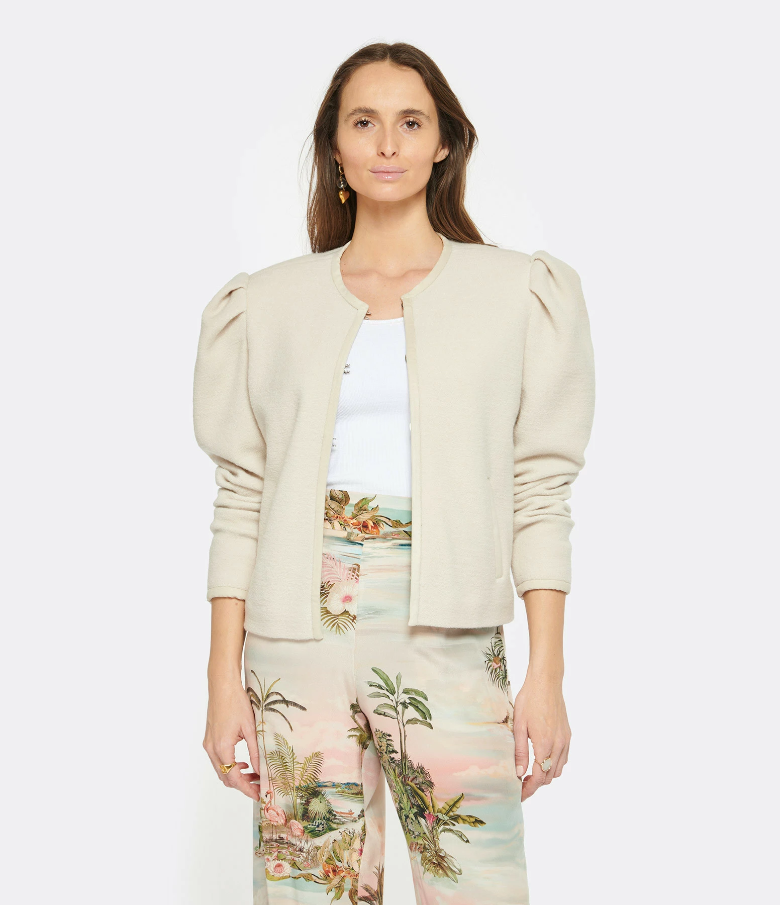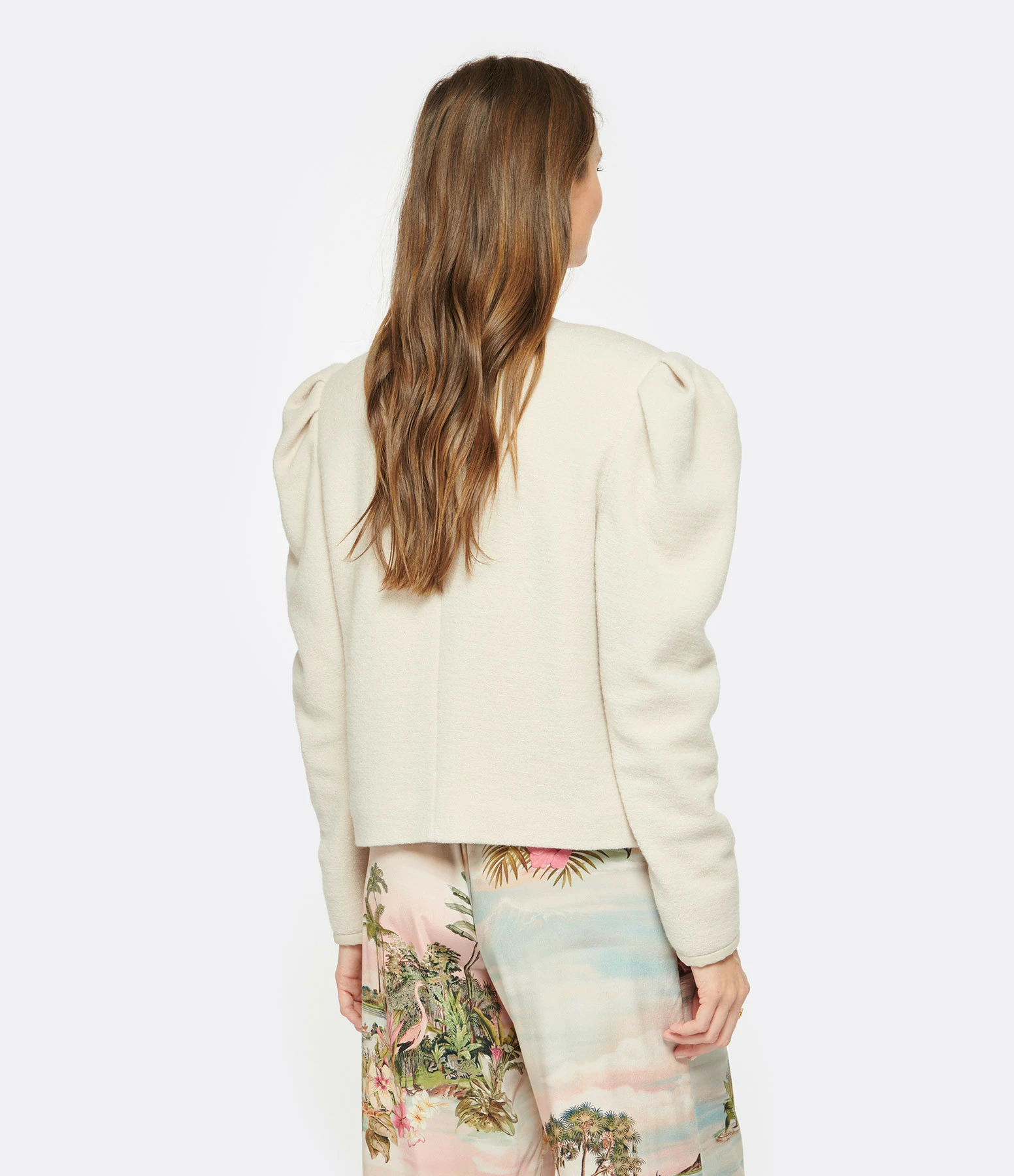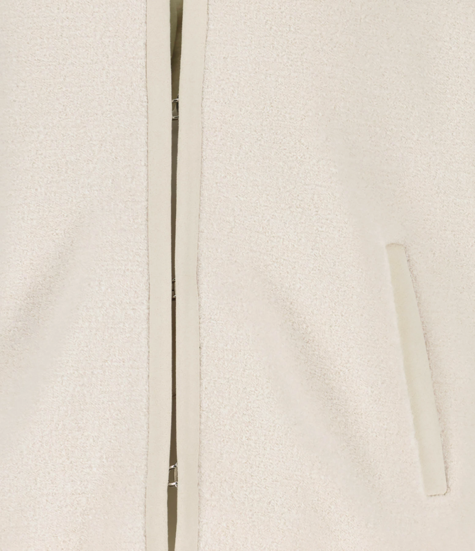 Veste courte en laine vierge écrue. Col rond. Manches longues avec épaulettes. Deux poches passepoilées sur le devant. Fermeture avec crochets invisibles sur le devant. Coupe droite. Base droite. Doublée en viscose beige.