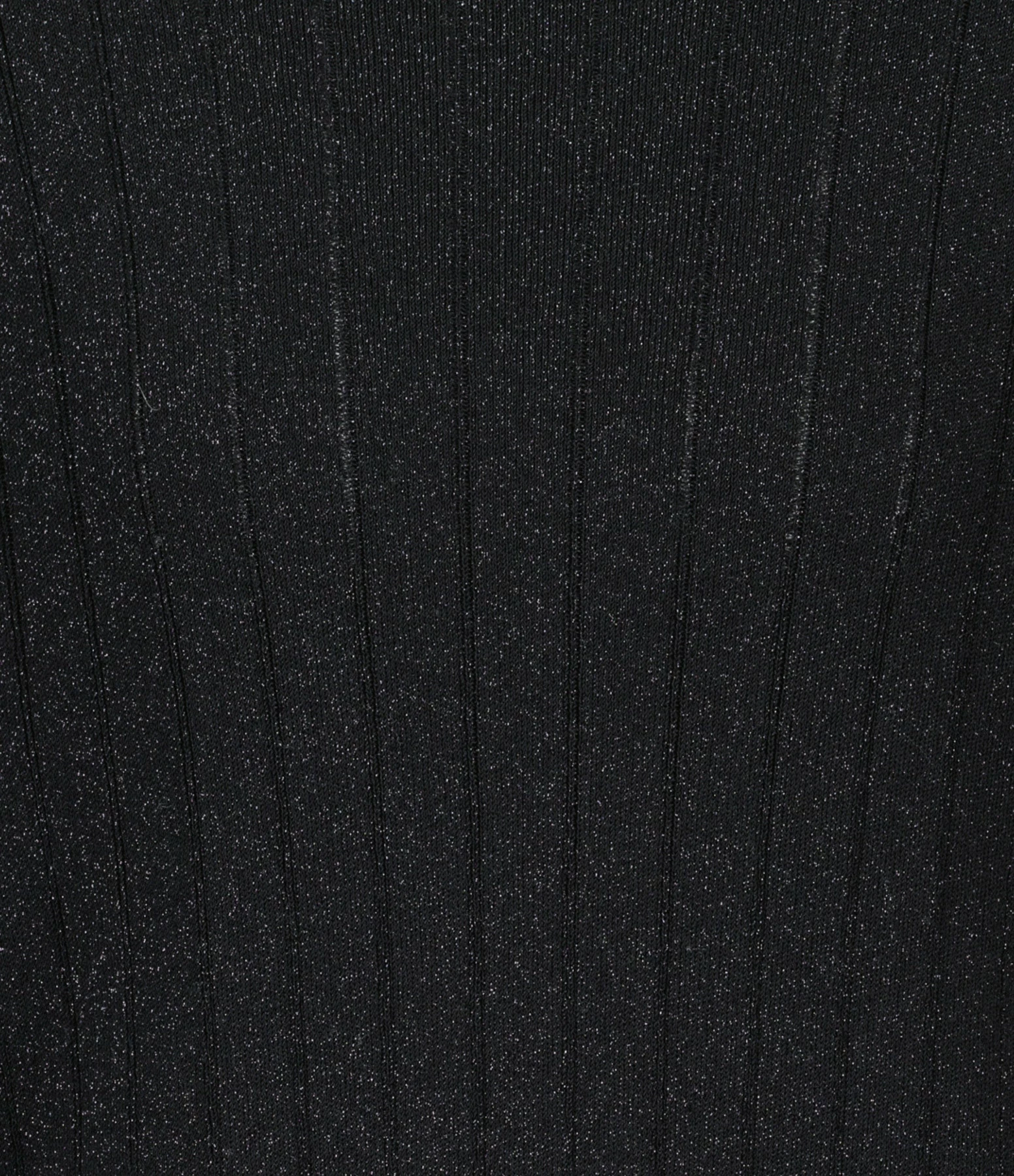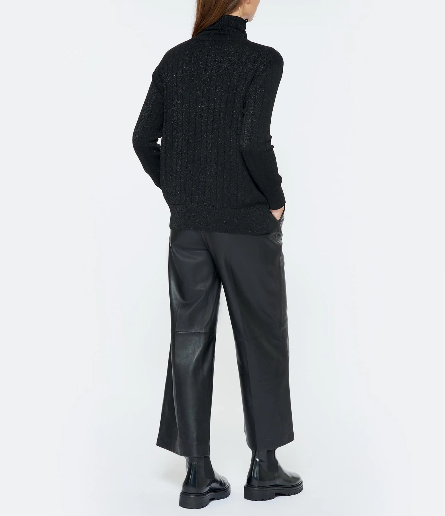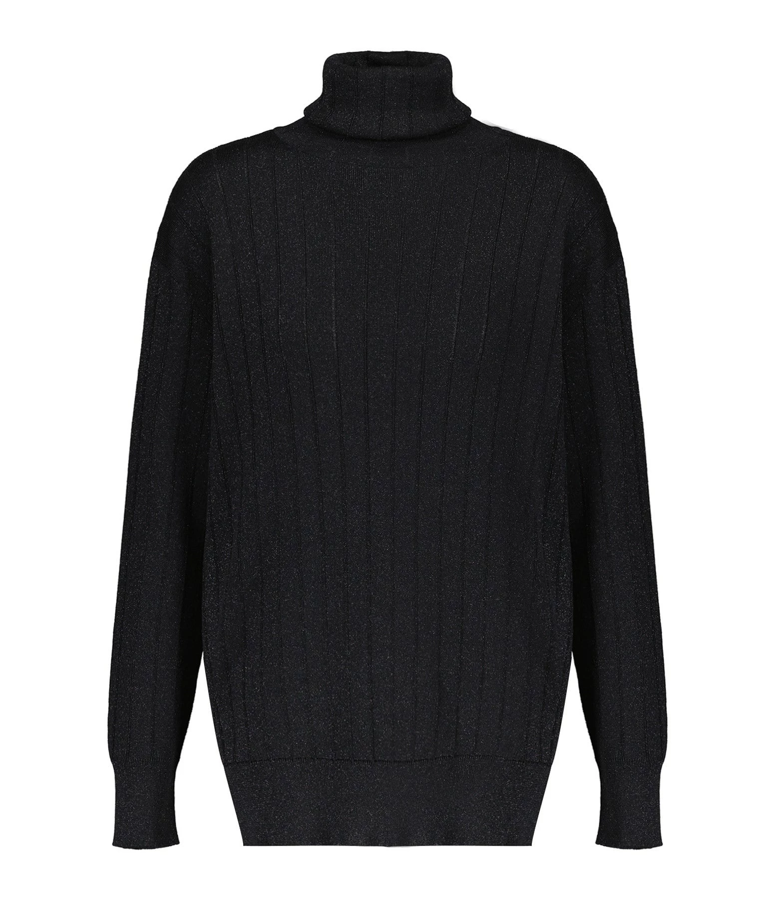 Pull en maille noir réhaussé de fins fils métallisés argentés. Col roulé. Manches longues avec poignets côtelés. Petites fentes latérales. Coupe près du corps. Base droite côtelée.