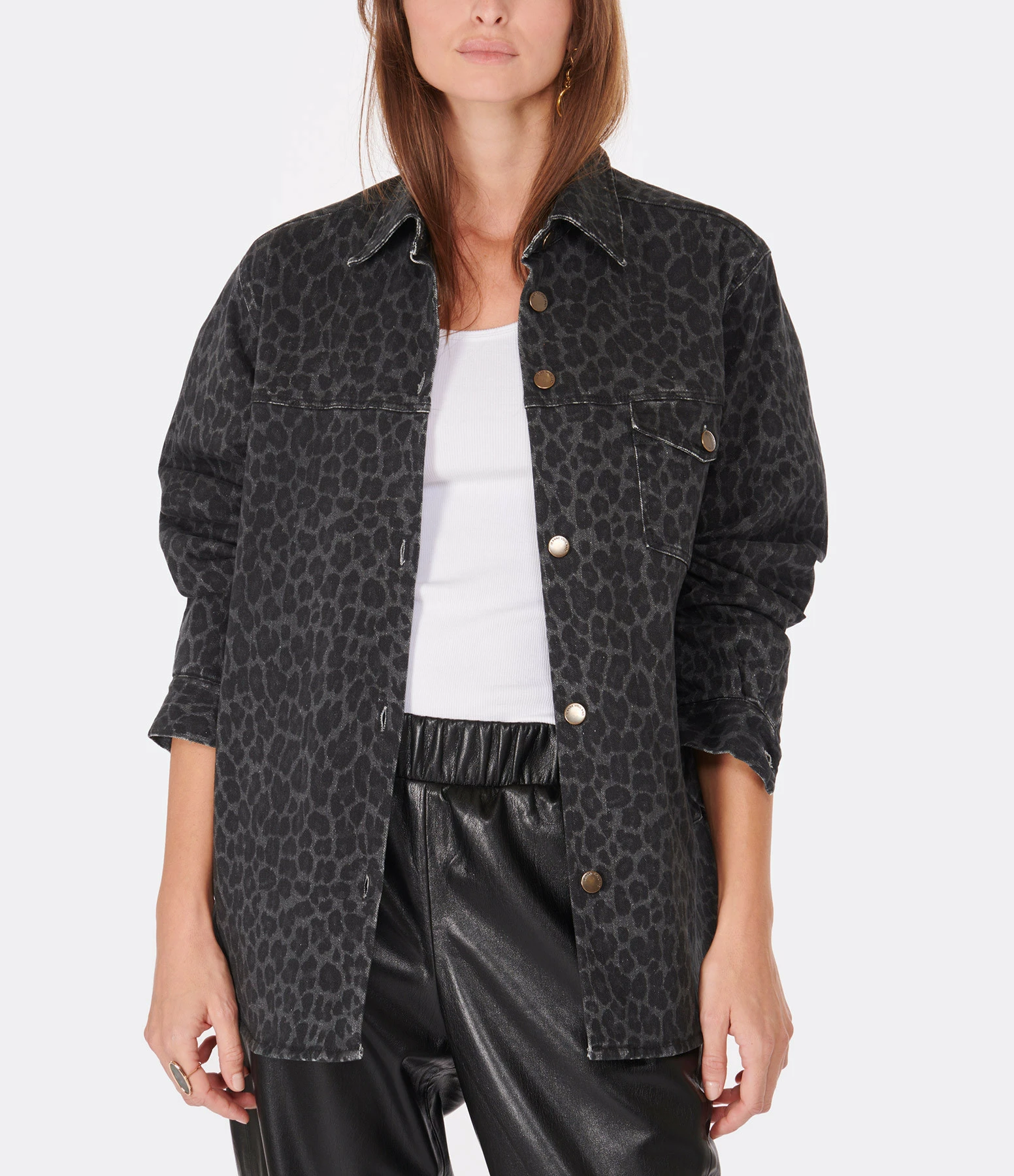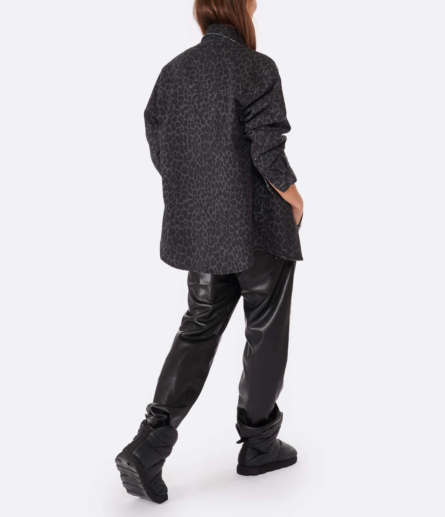 Surchemise oversize en denim à imprimé léopard noir et gris. Col chemise. Manches longues. Fermeture boutonnée. Une poche plaquée à rabat boutonnée sur la poitrine. Deux poches fendues. Coupe ample. Base droite.
