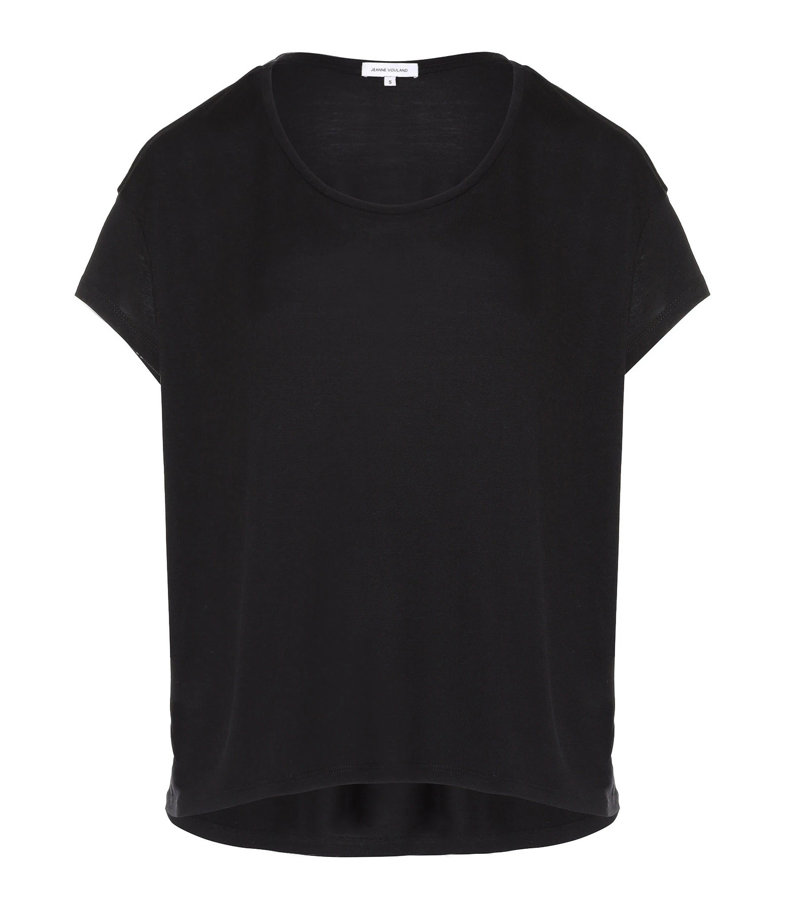 Tee-shirt noir en lyocell pour femme. Col rond. Manches courtes. Base droite avec broderie “JV” ton sur ton sur le côté gauche. Non doublé.
