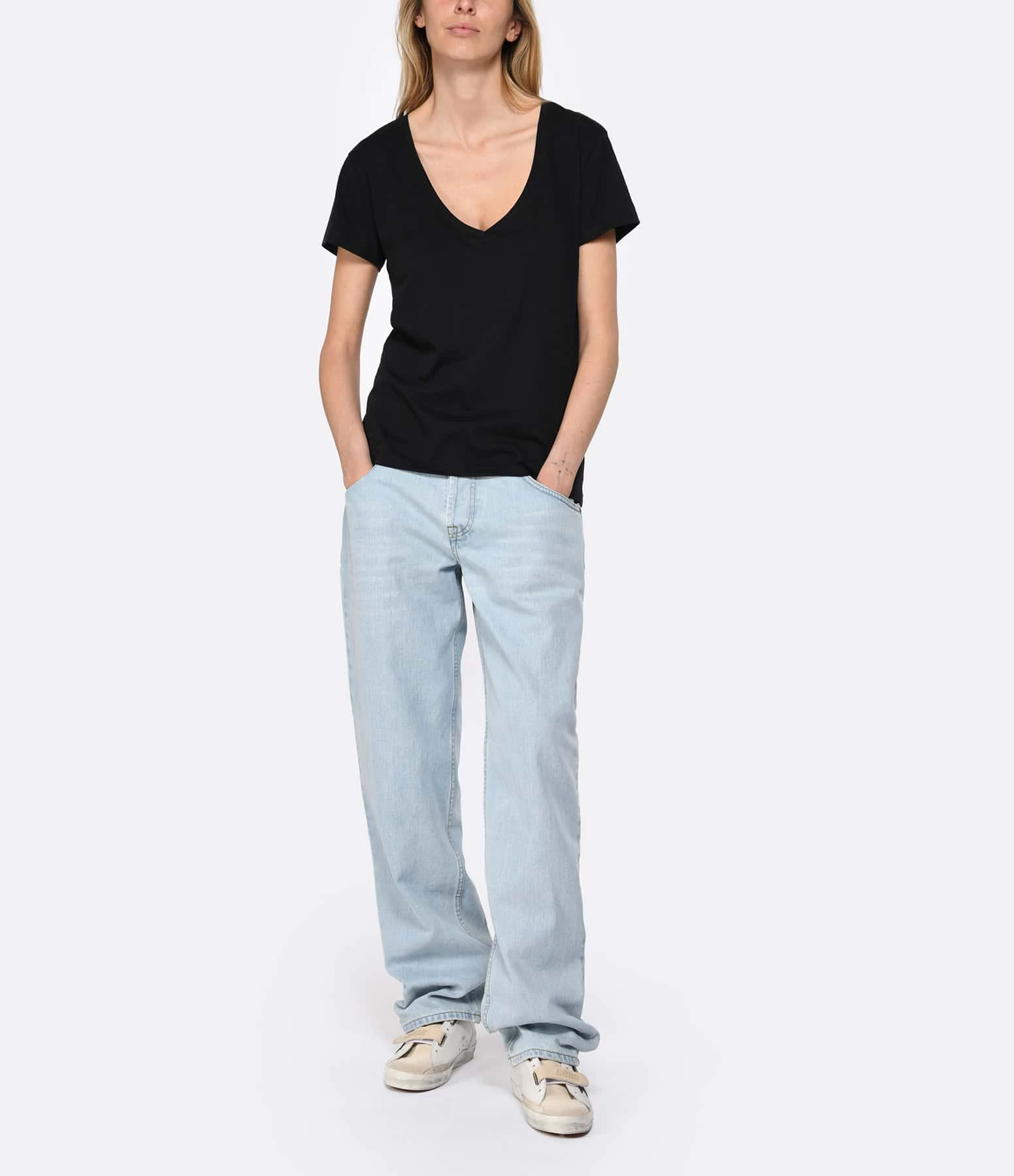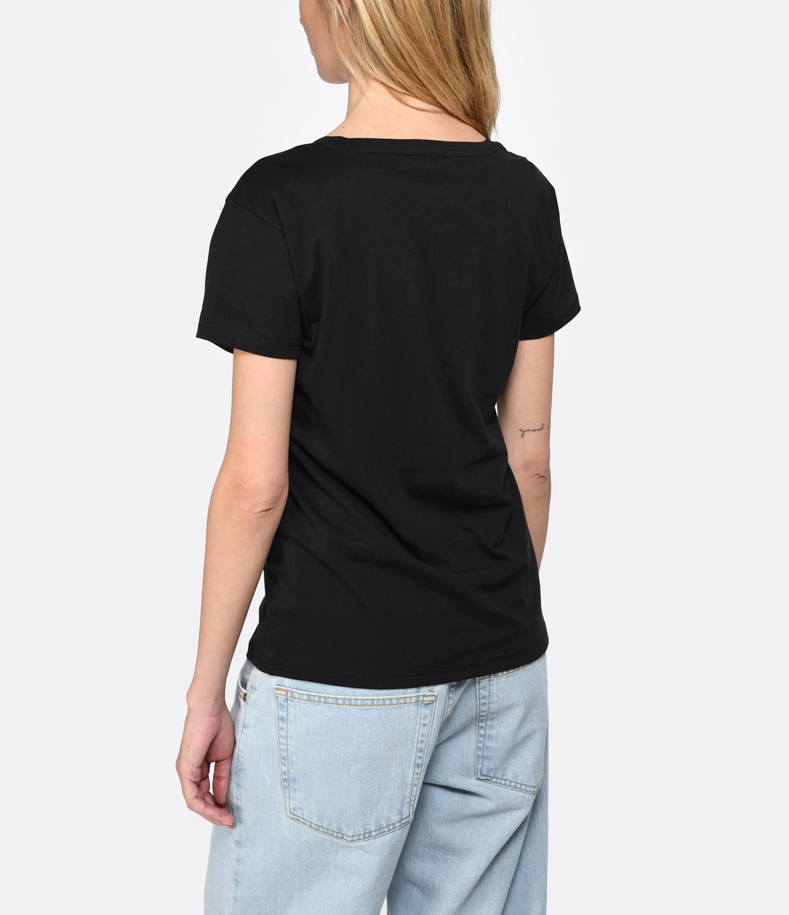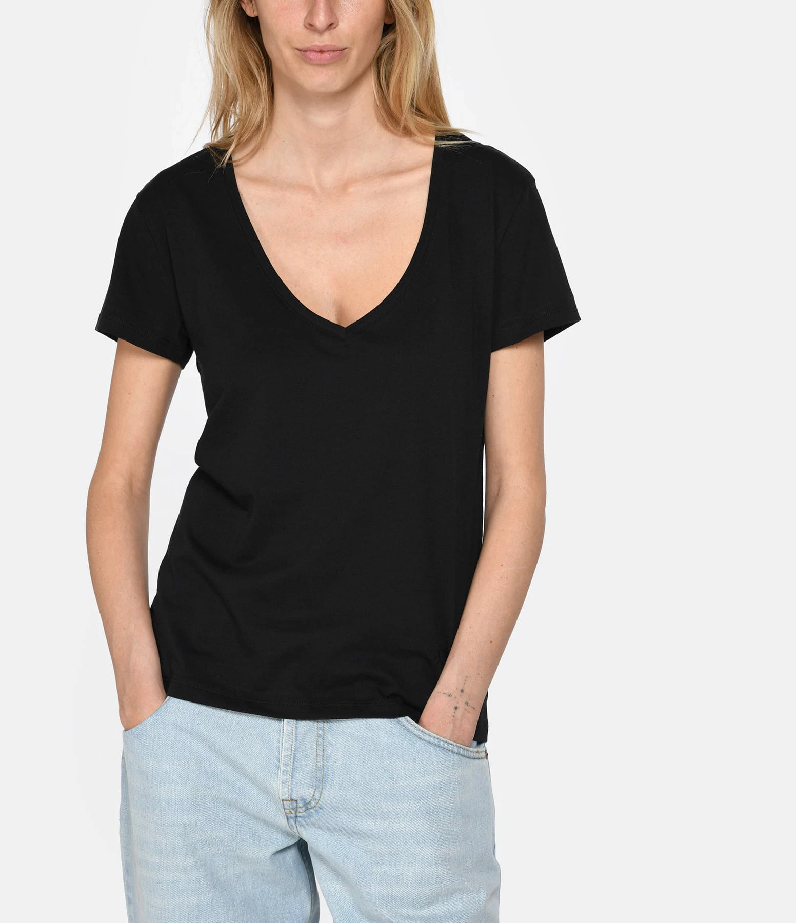 Tee-shirt en coton pima noir. Col V. Manches courtes. Coupe droite. Base droite.
